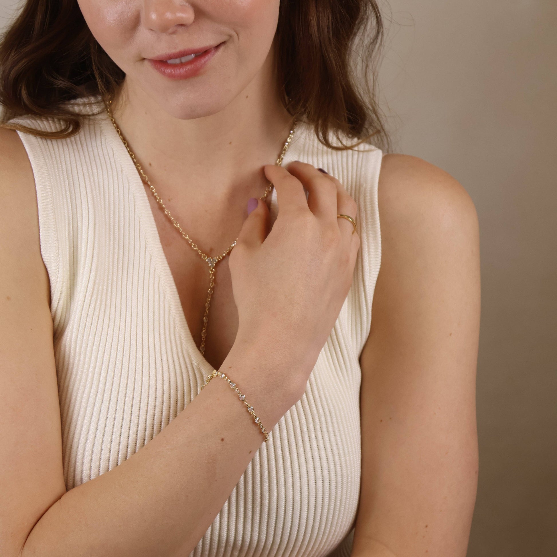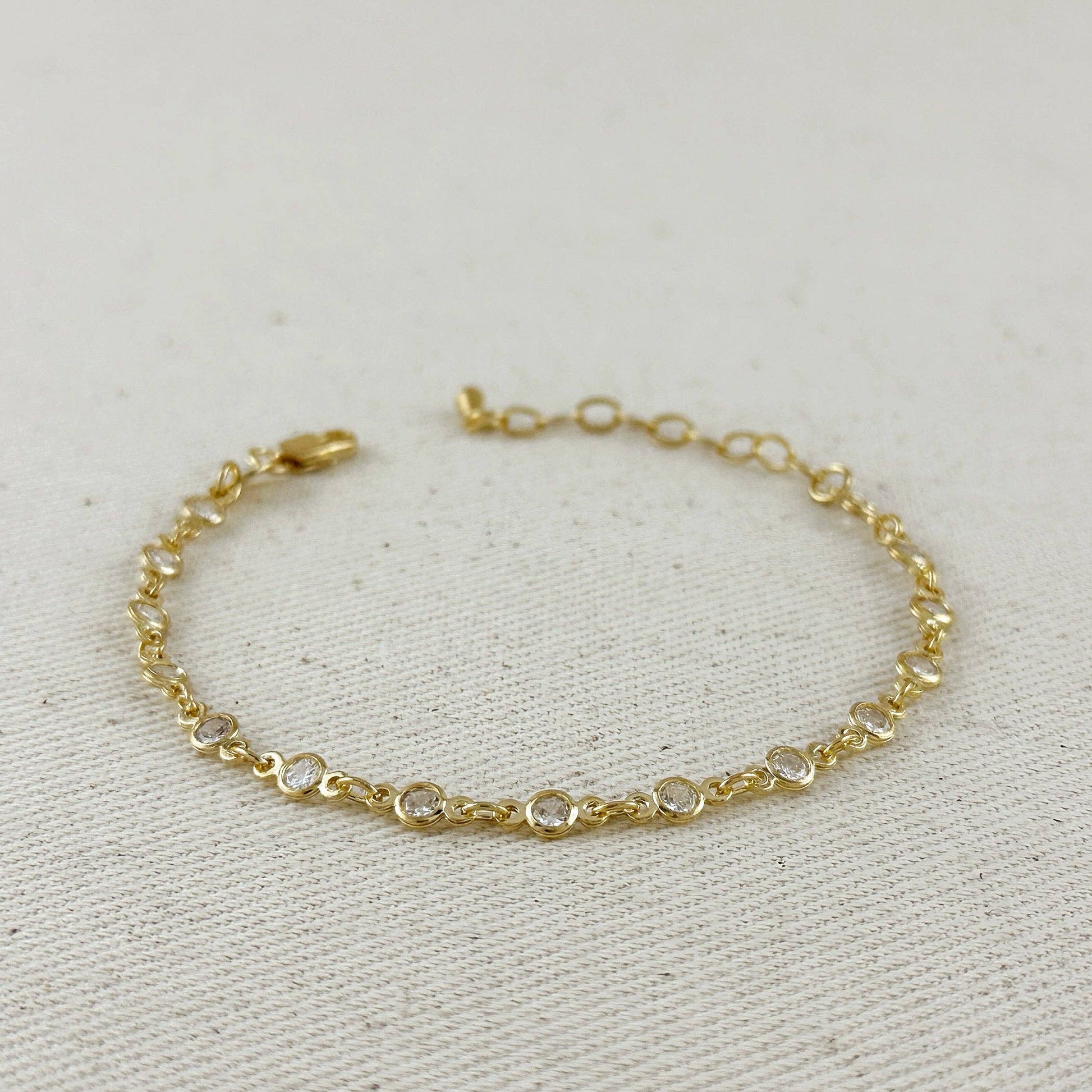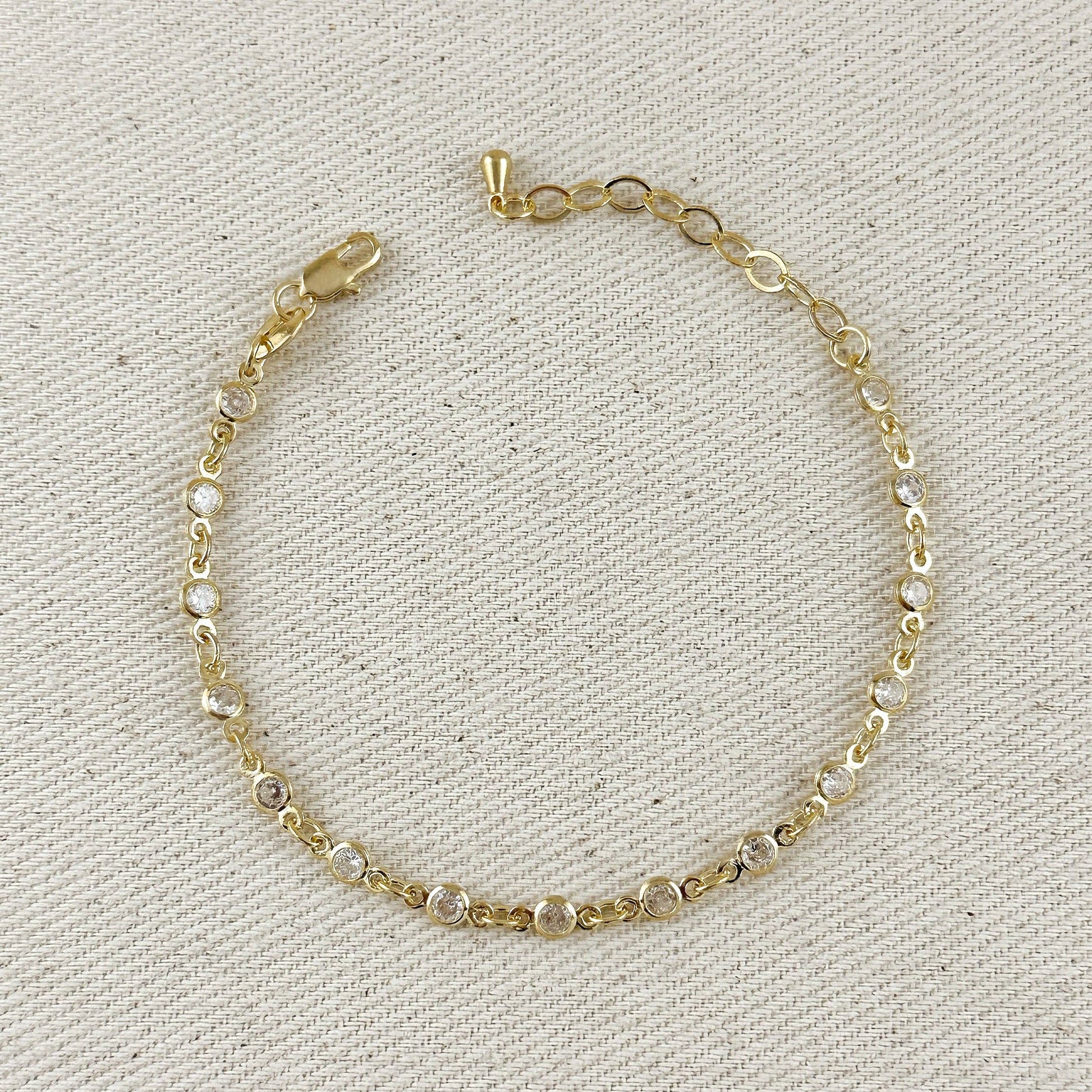 The seamless round settings showcase each CZ stone to perfection, creating a continuous circle of sparkle that delicately adorns your wrist. The precision-cut stones are securely nestled in smooth gold filled bezels that enhance their natural brilliance while providing a clean, contemporary finish.