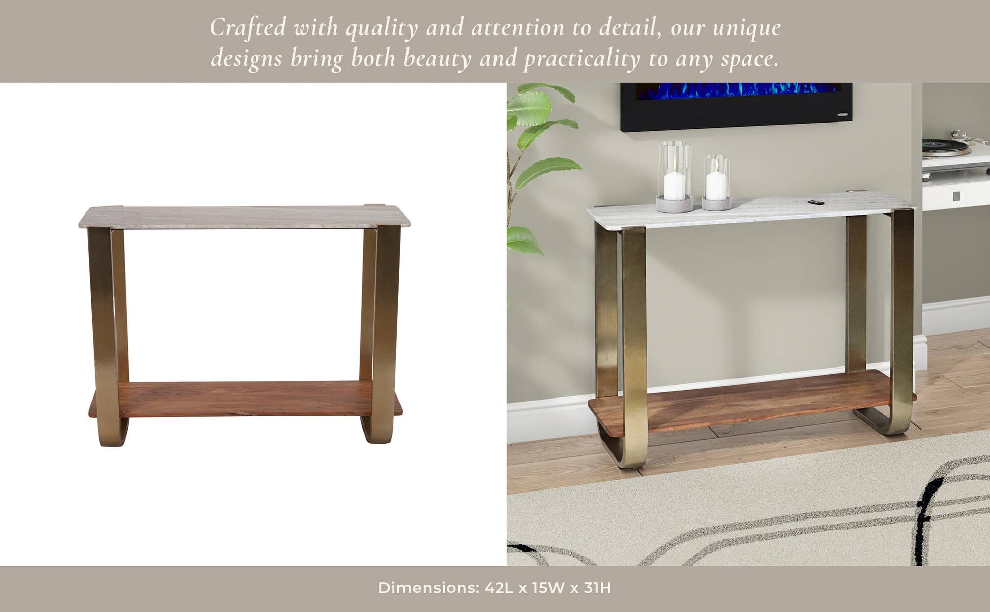 Elevate your home decor with this modern console table, a sophisticated blend of metal, wood, stone, iron, and MDF that brings both style and functionality to any space. Featuring a sleek gold and metallic finish, this table makes a striking statement in entryways, living rooms, bedrooms, or offices. Its elegant stone tabletop provides a durable and refined surface perfect for displaying decorative pieces, books, or everyday essentials, while the sturdy iron legs with a luxurious gold finish ensure long-lasting stability. A wooden lower shelf offers additional storage, ideal for organizing baskets, plants, or personal accessories, maximizing space without adding clutter.