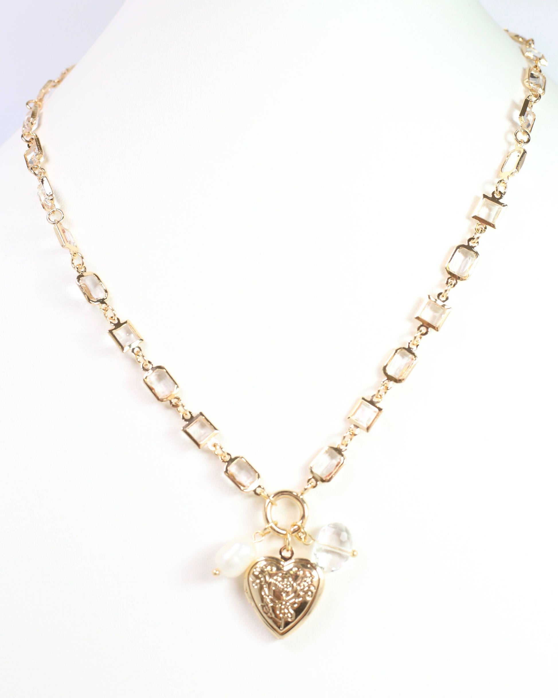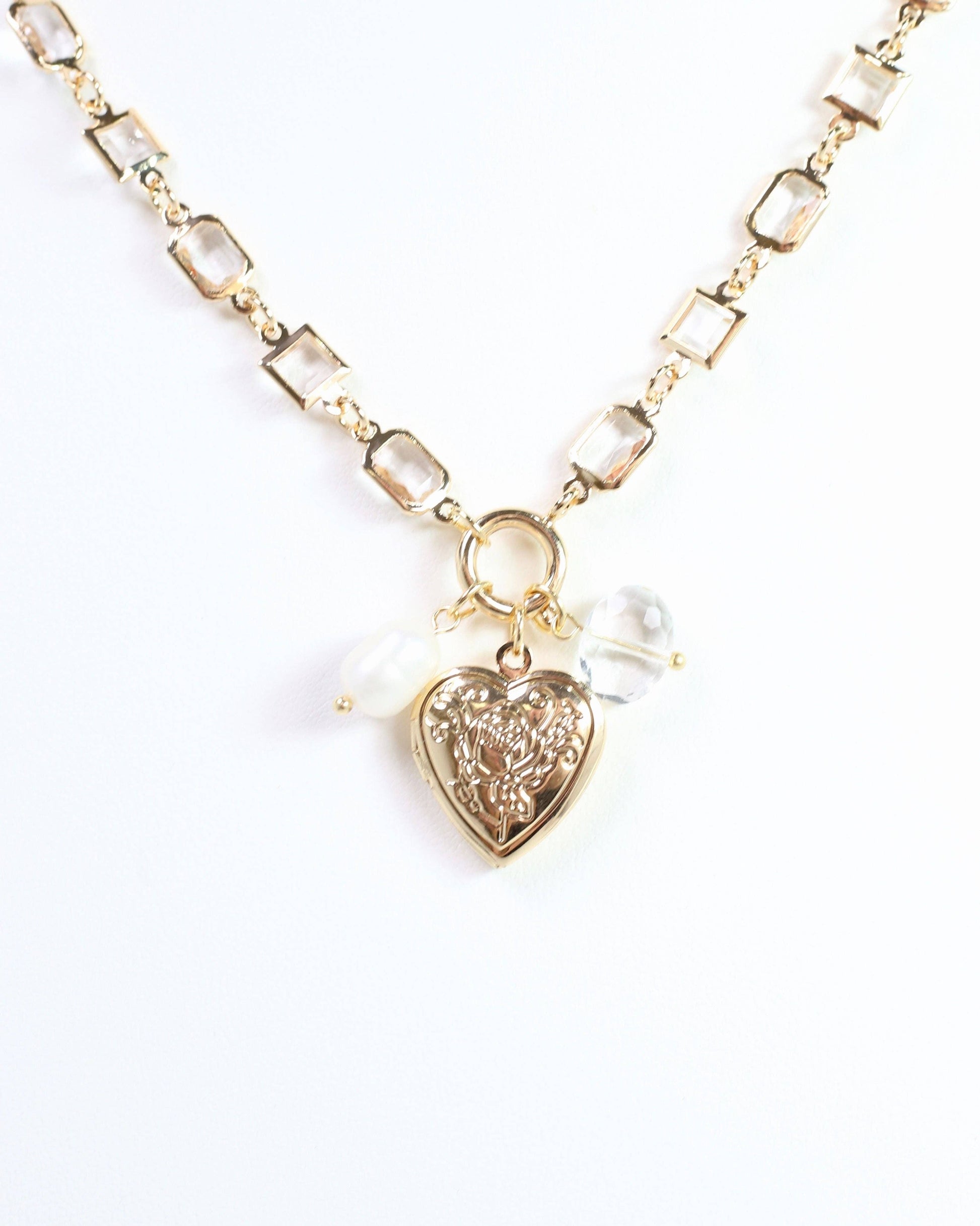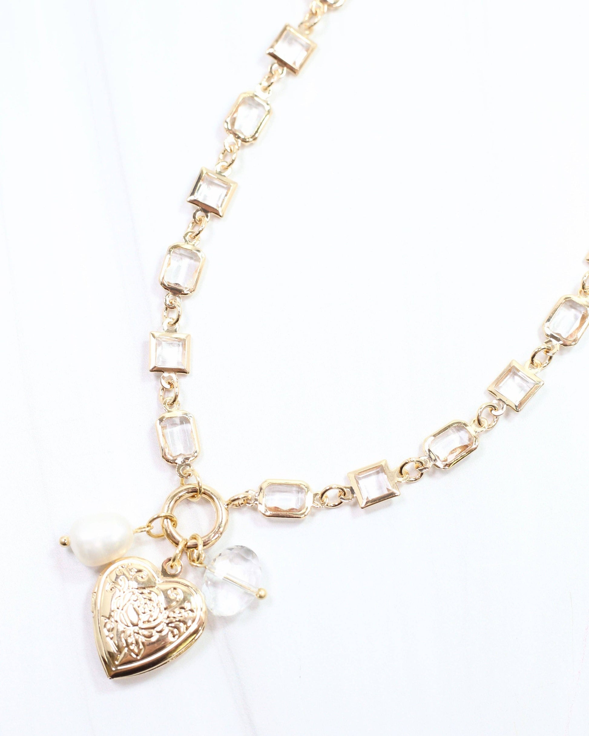 Add a touch of love to your day with this Ammon Charm necklace. Featuring a square crystal chain, etched heart locket, faceted bead, and pearl charm, it’s the perfect blend of vintage vibes and modern flair. A timeless statement piece for any occasion!