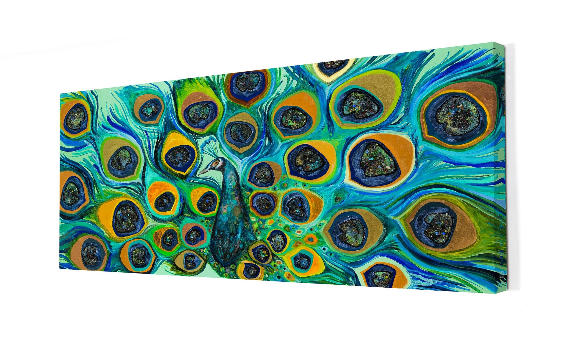 Made-to-Order. Canvas wall art by Eli Halpin featuring a proud peacock fanning his feathers of blue, teal and green.