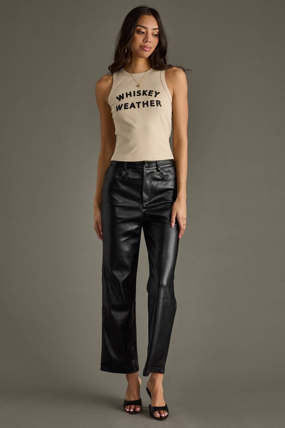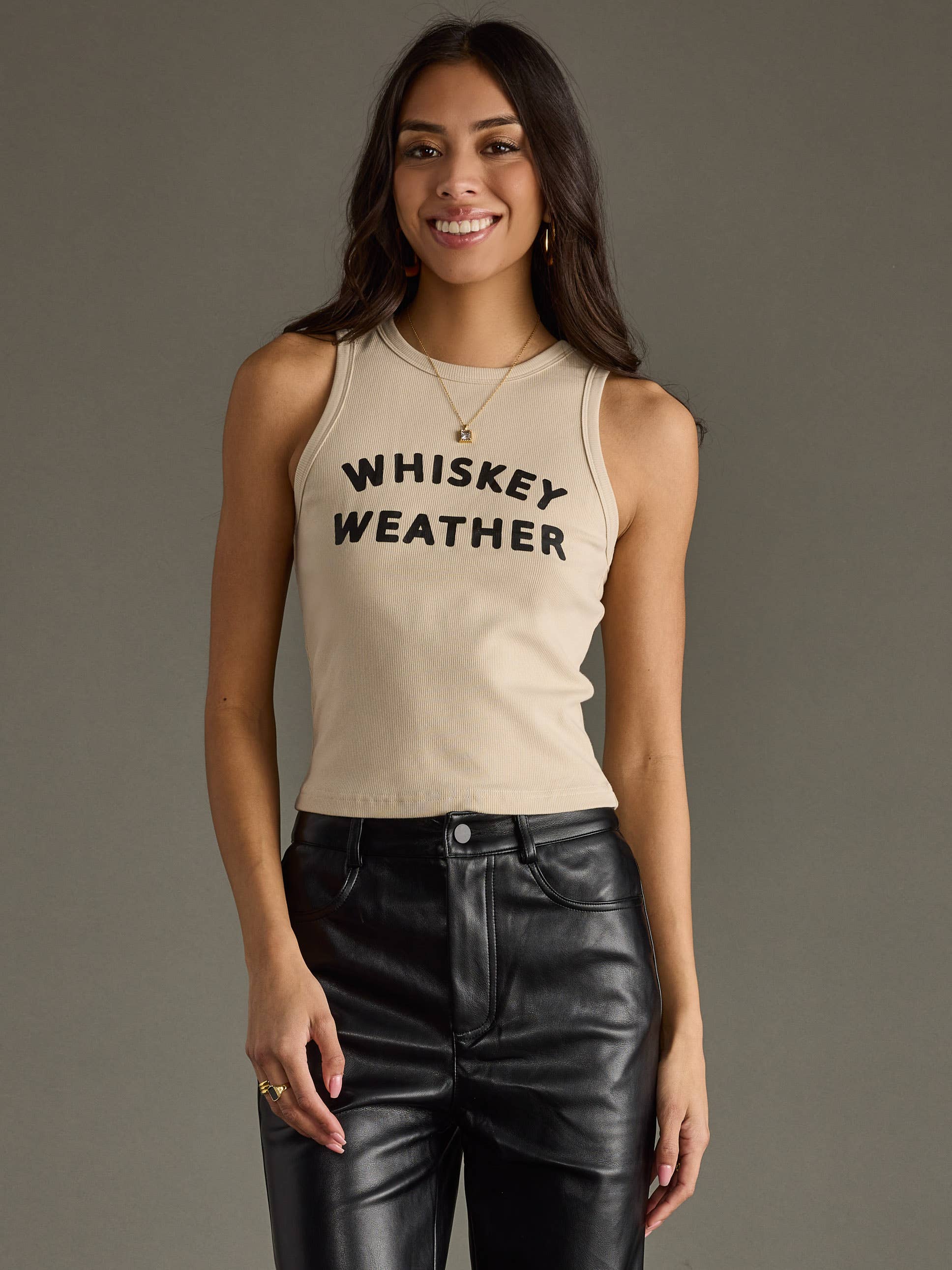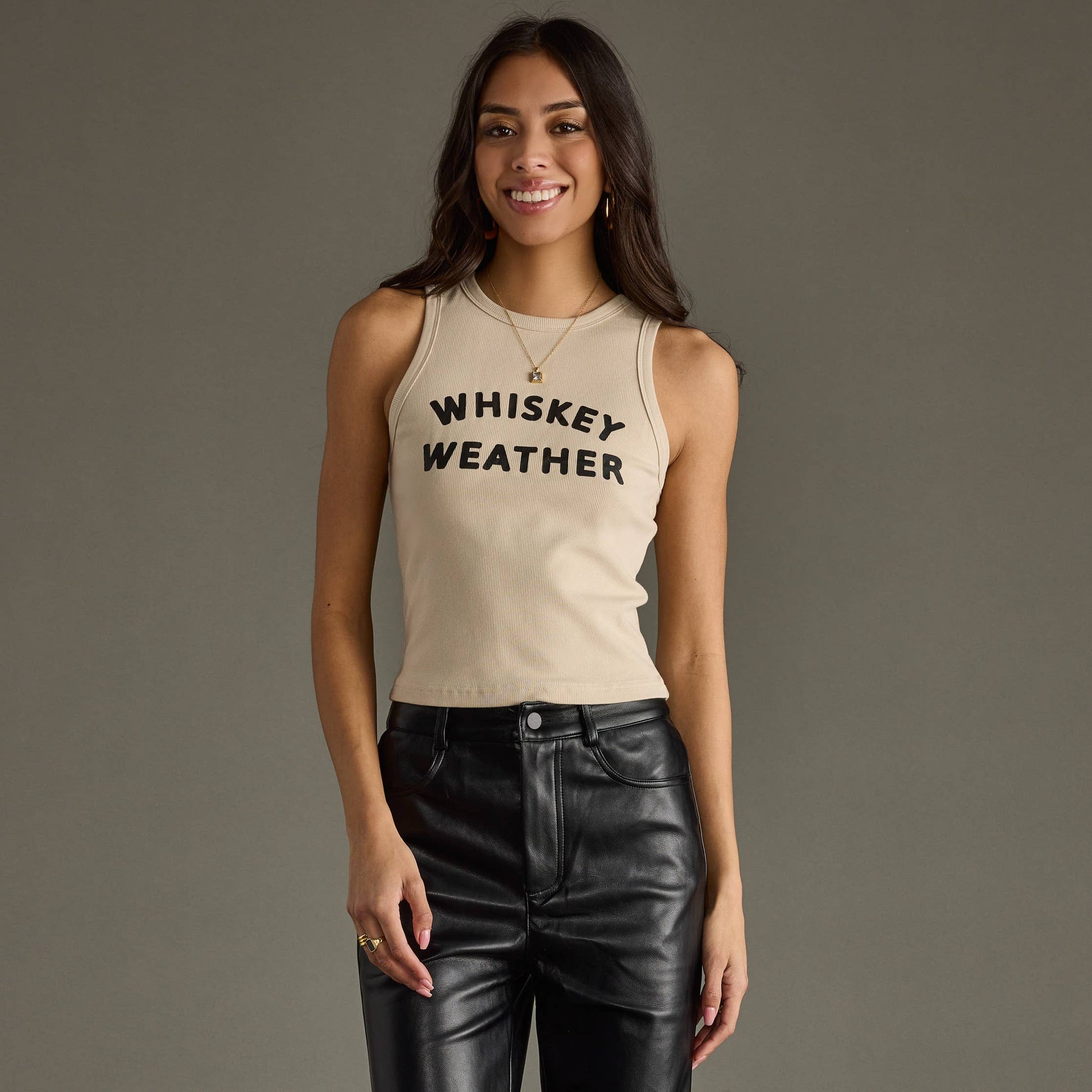 Beige ribbed tank top Black "Whiskey Weather" text on the front 60% Polyester/35% Rayon/5% Spandex
