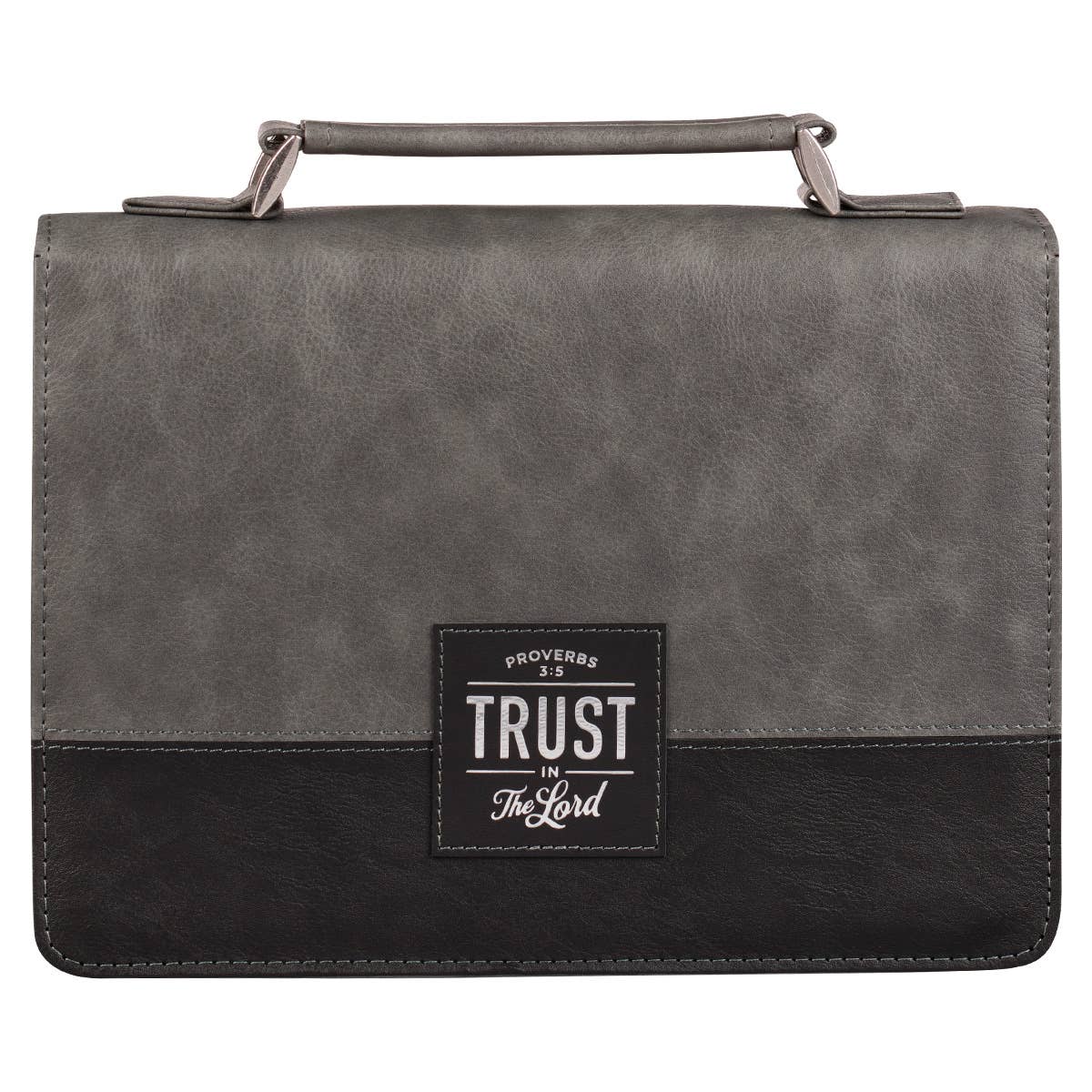 Two-tone gray-and-black design with black appliquéd patch, Gray and black faux leather, White screen printed text, Trust in the Lord with all your heart, Proverbs 3:5, Trust in the Lord Gray and Black Collection, Classic Bible cover, Exterior slip pocket, Lay-flat carry handle, Silver handle hardware, Silver cross-engraved zipper pull, Two interior pen loops, Available in Medium and Large, Refer to Image Carousel for Bible Cover Sizing Chart,