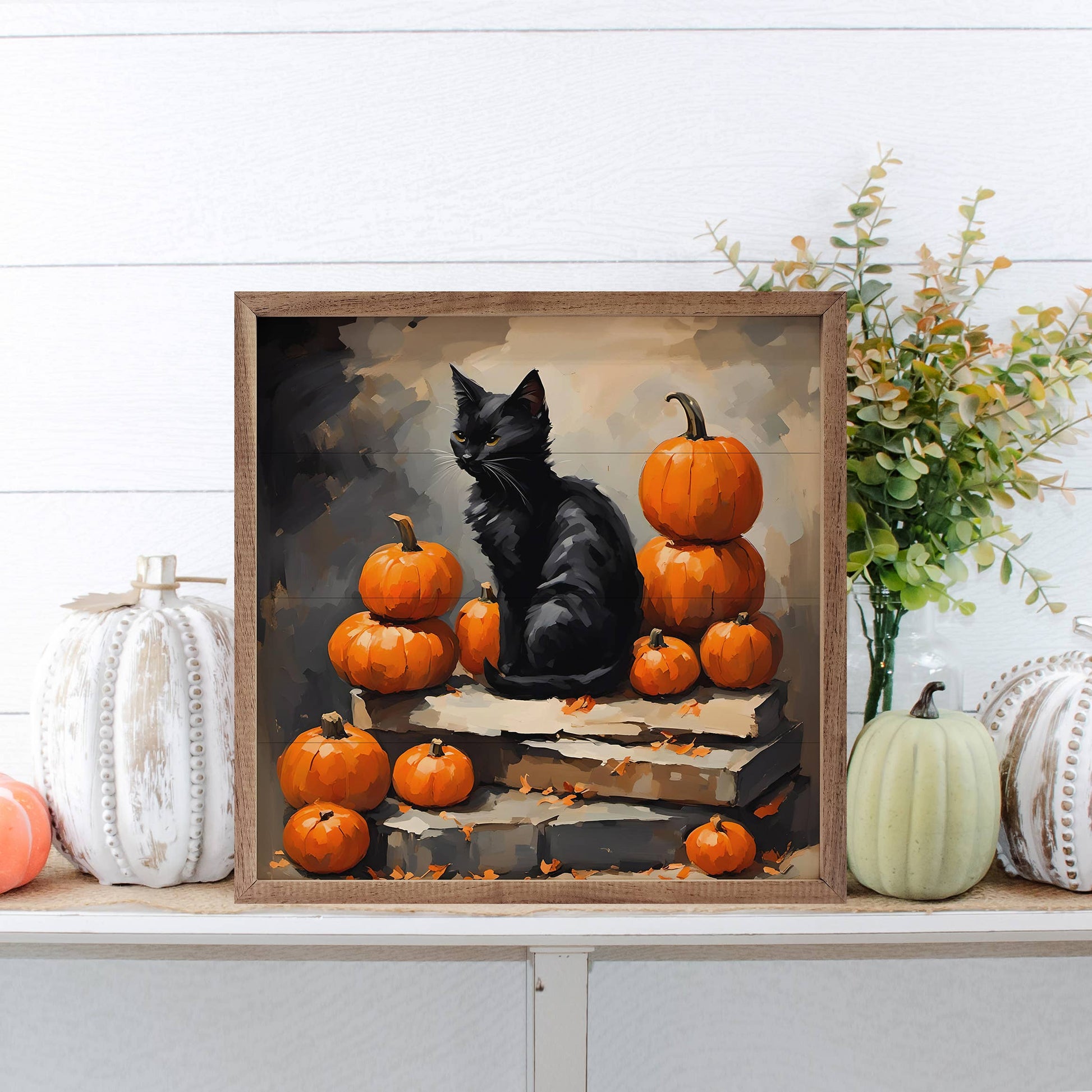 Black Cat With Pumpkin Stack
