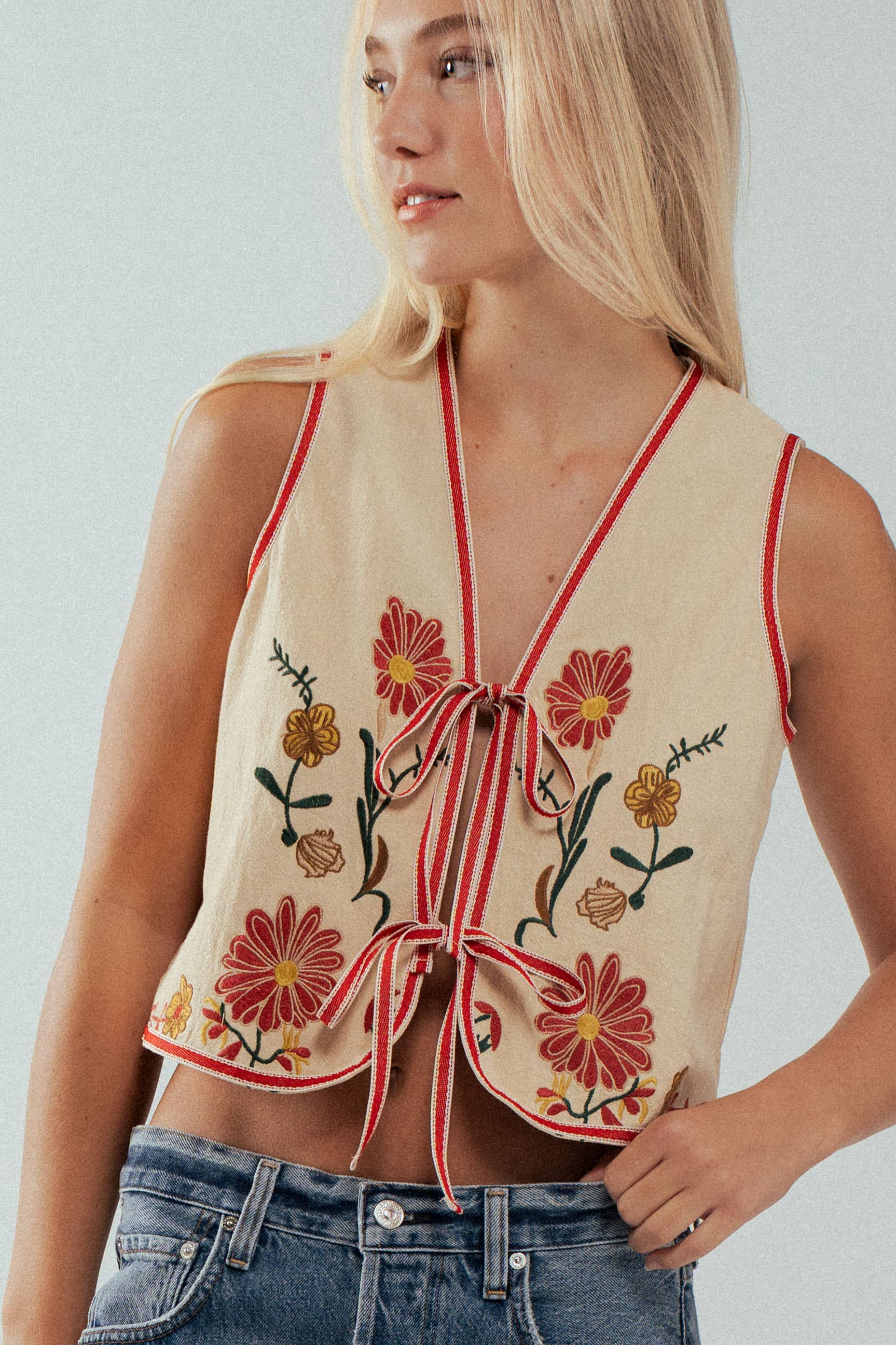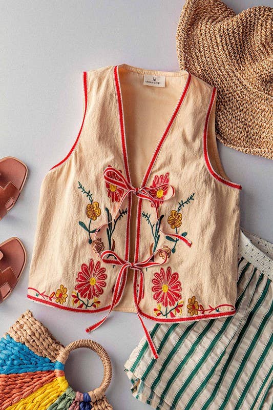 Add a touch of western charm to your spring 2025 clothing and summer 2025 wardrobe with this boho-inspired cotton vest with vibrant floral embroidery, adjustable ties, and colorful stitching. Lightweight, relaxed fit for easy layering over summer outfits.