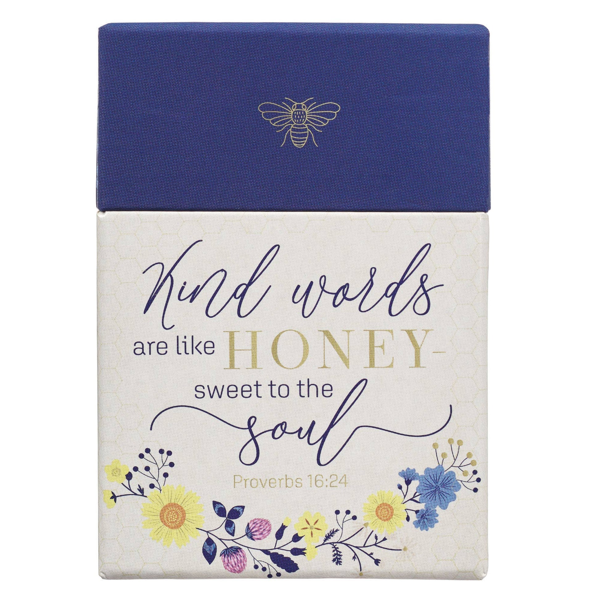 Yellow and royal blue beehive design, Royal blue and gold-foiled text, Kind words are like honey, Proverbs 16:24, Kindness is Like Honey Collection, Full-color printed cards and box, 51 double-sided cards, Scripture on front, Space to write message on back, Shrink-wrapped, Sturdy box with lid, Card size: 3.4" x 2.3" (86 x 58mm), Box size: 3.8" x 2.7" x 1.1" (97 x 69 x 28mm)