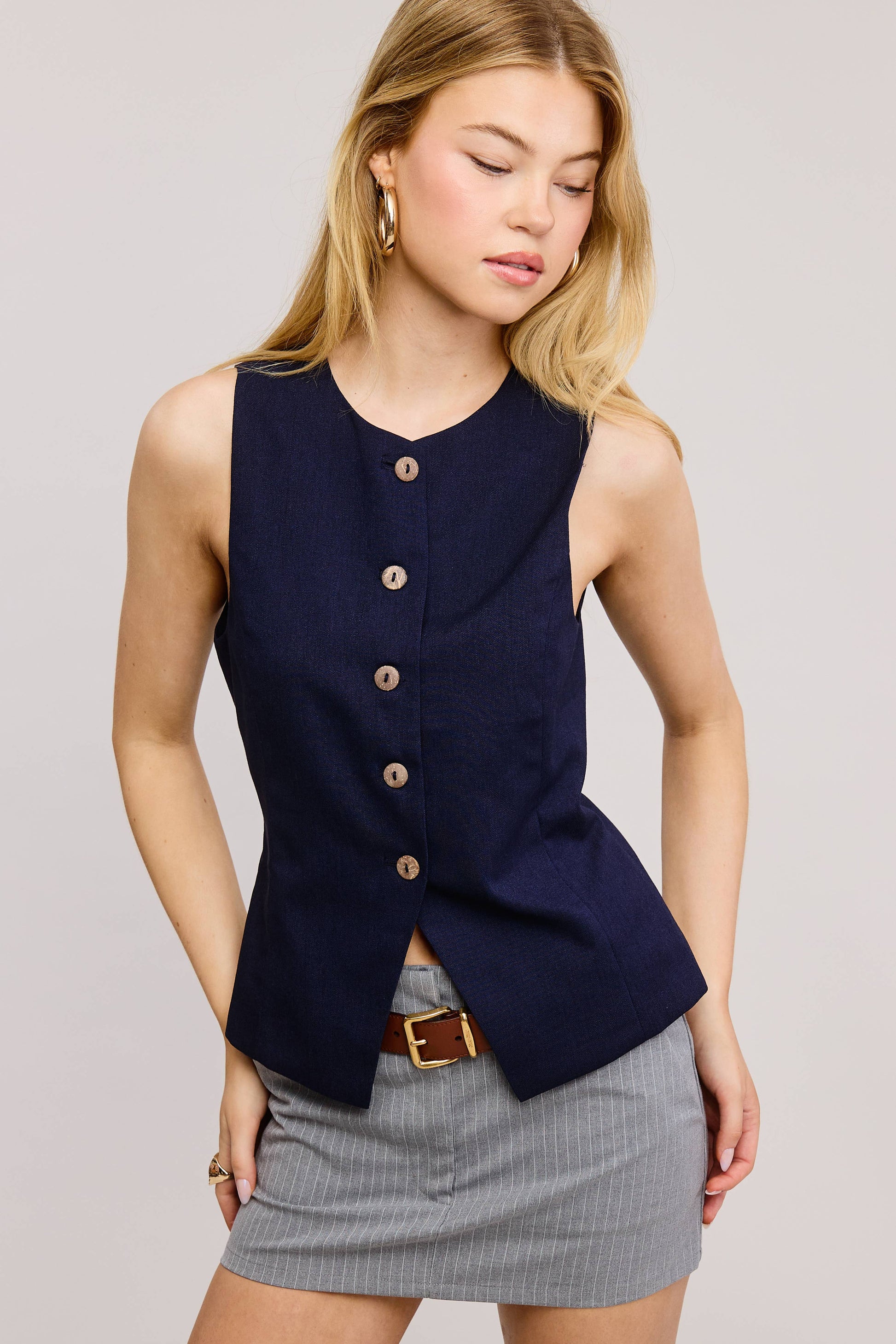 Button-Down Sleeveless Round Neck Waistcoat Vest A solid-colored, round-neck sleeveless waistcoat vest top featuring a button-down front closure. Designed with a regular-length fit, this top has a split hem at the front, adding a stylish touch to its sleek silhouette. Buttoned vest, tailored vest, womens clothing, work wear, trendy, solid vest, sleeveless vest, fitted vest, classic, minimalistic, spring, summer, ootd, womens tops, slim fit