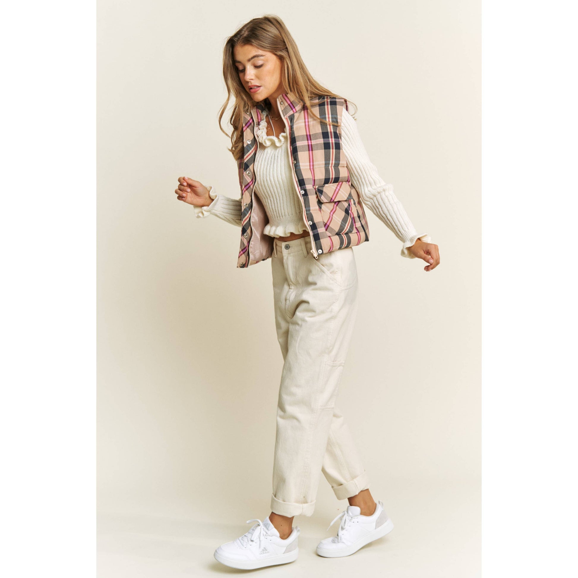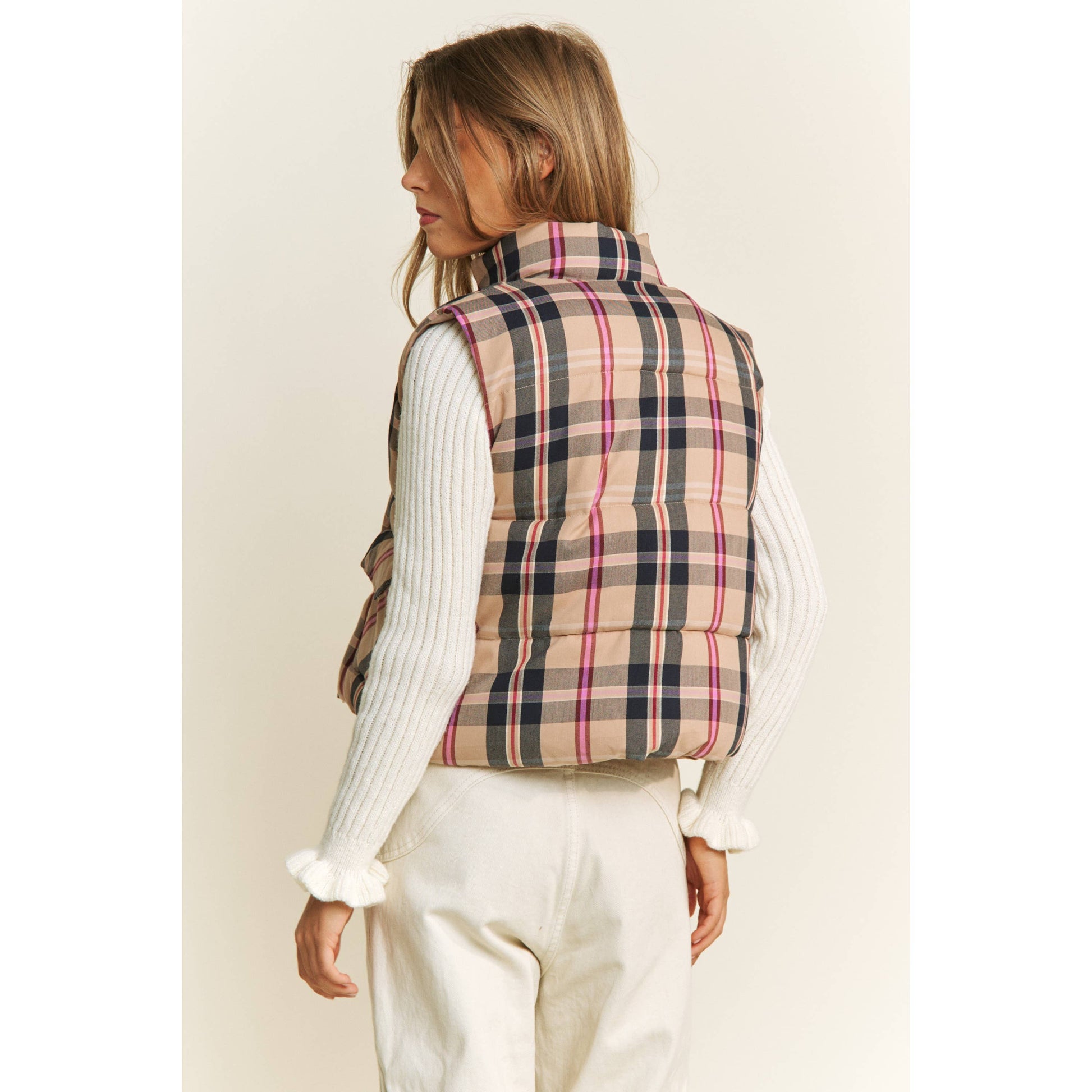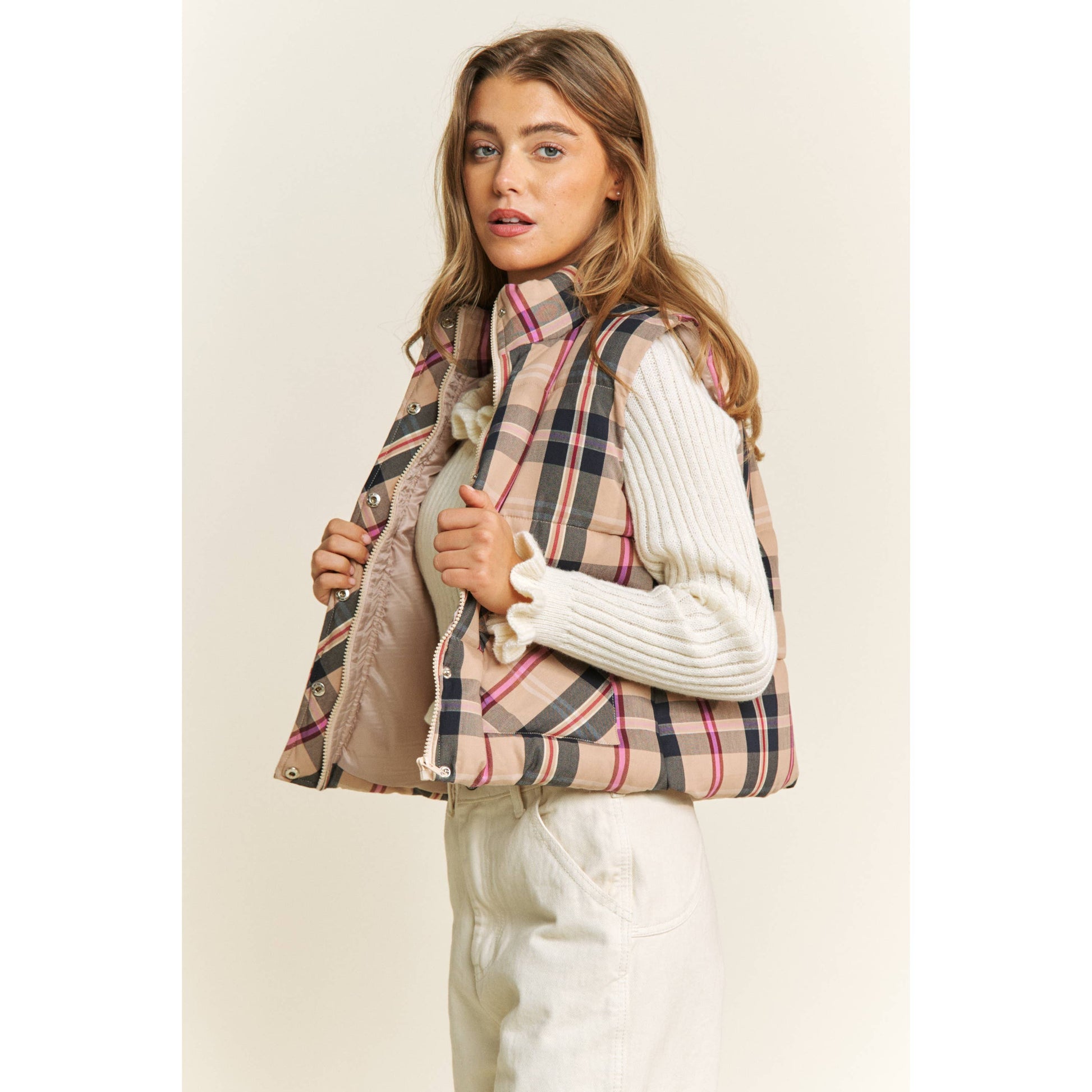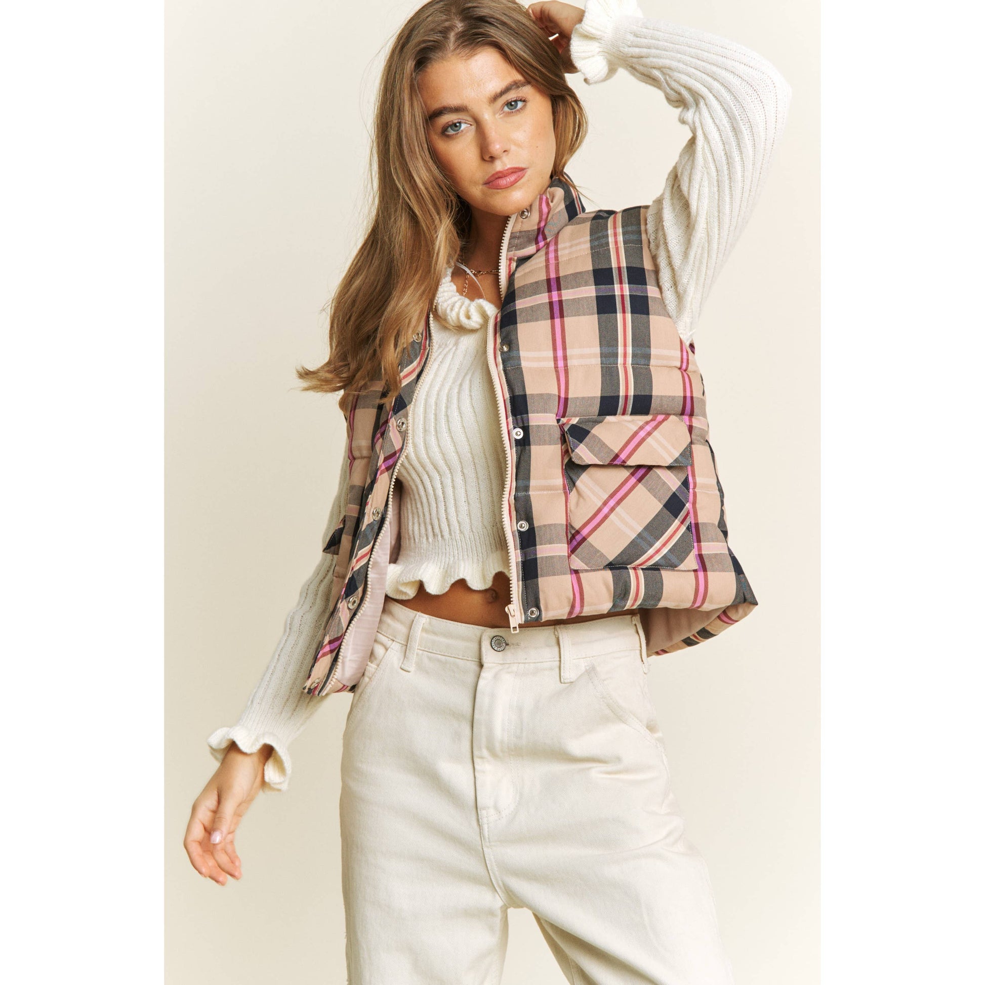 High neck short puffer vest - Soft plaid fabric used - Lined - Front pockets - Zipper up and snap buttons - Model is 5' 8" 30-25-34 and wearing a S/M