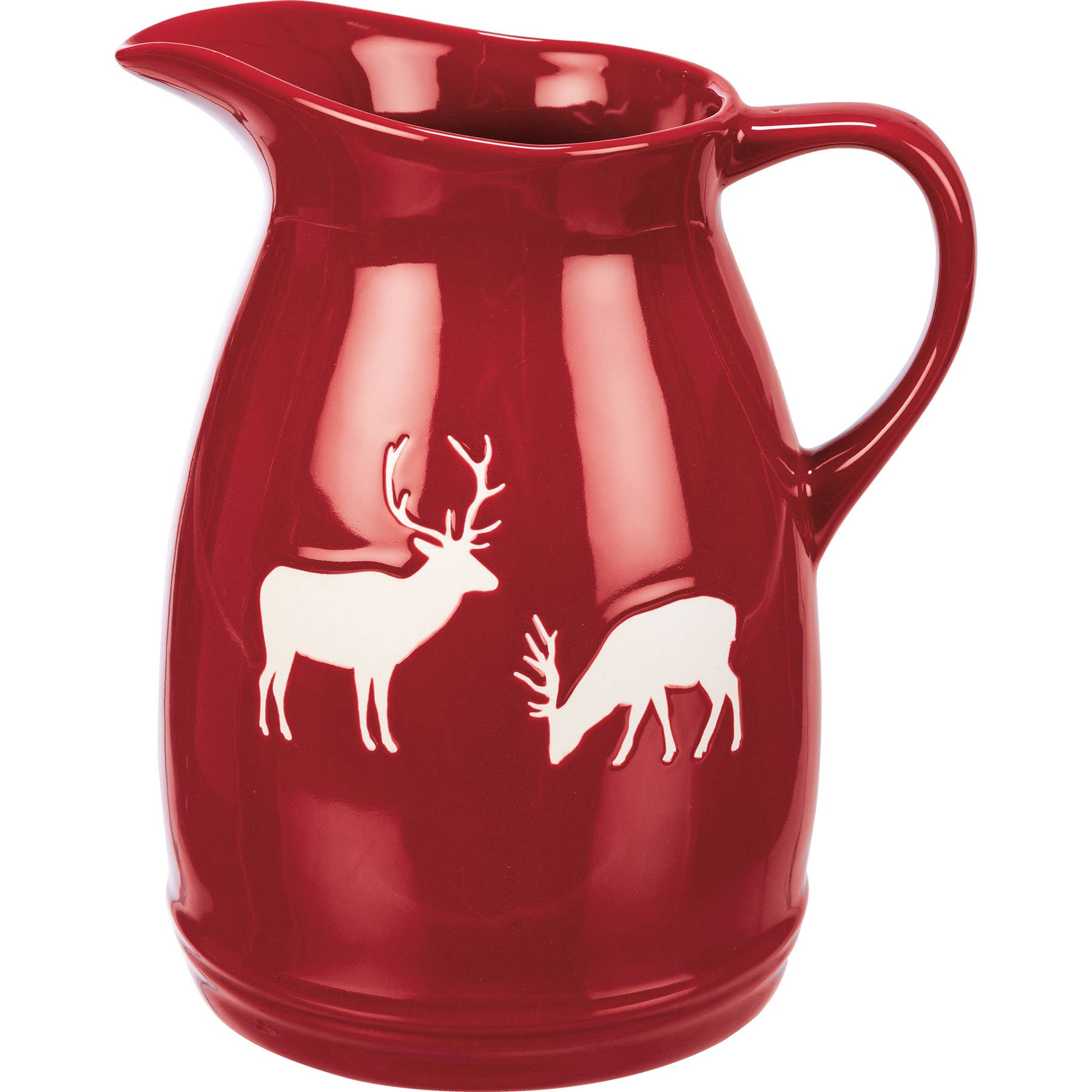 A red stoneware pitcher featuring debossed white deer designs. Our Deer pitcher is microwave, oven, dishwasher, and food safe.