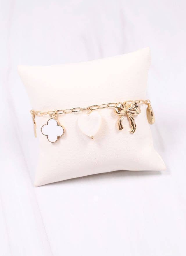 This bracelet features wonderful charms in shiny gold and pearl accents. It can easily be styled for casual outfits or dressy looks.