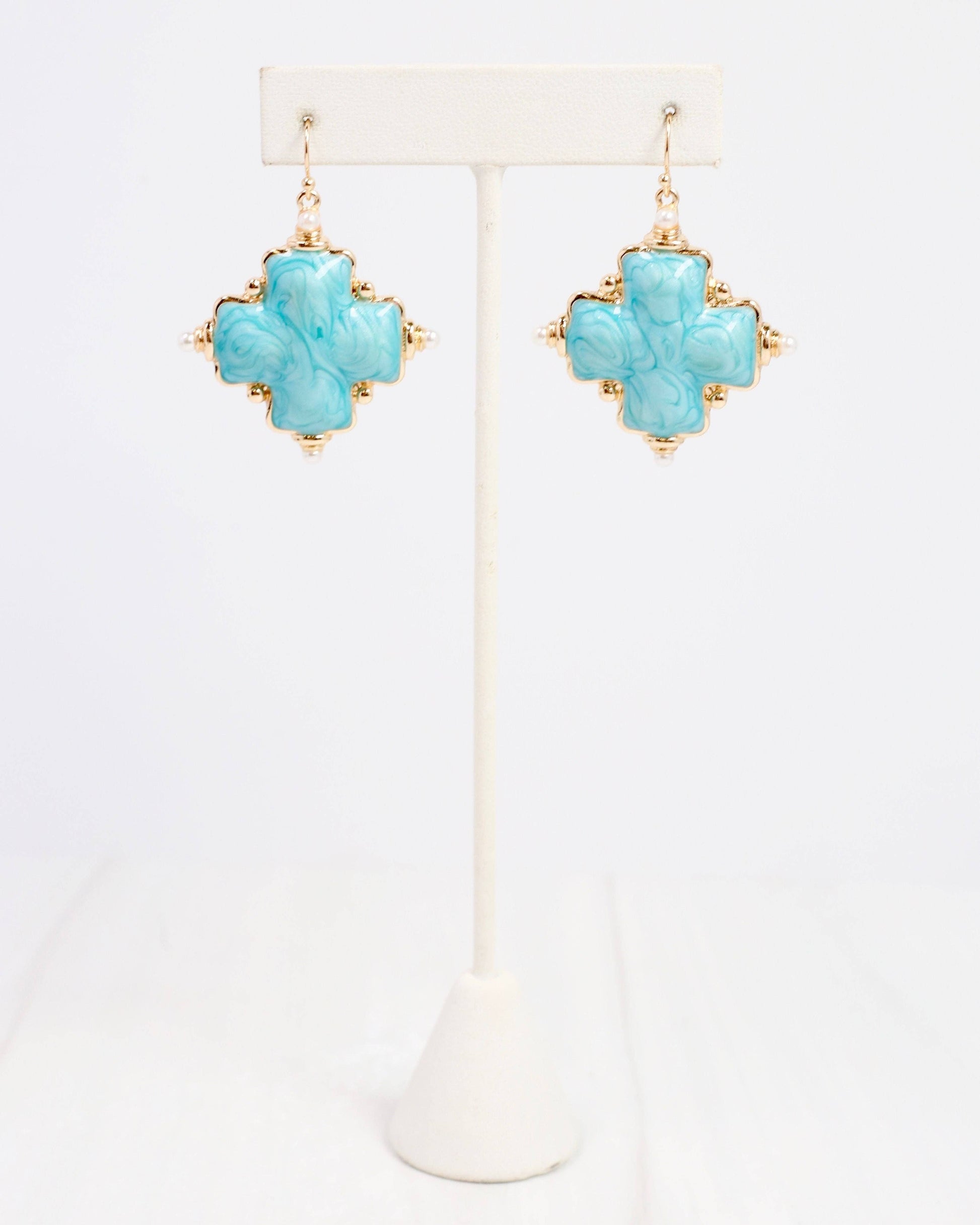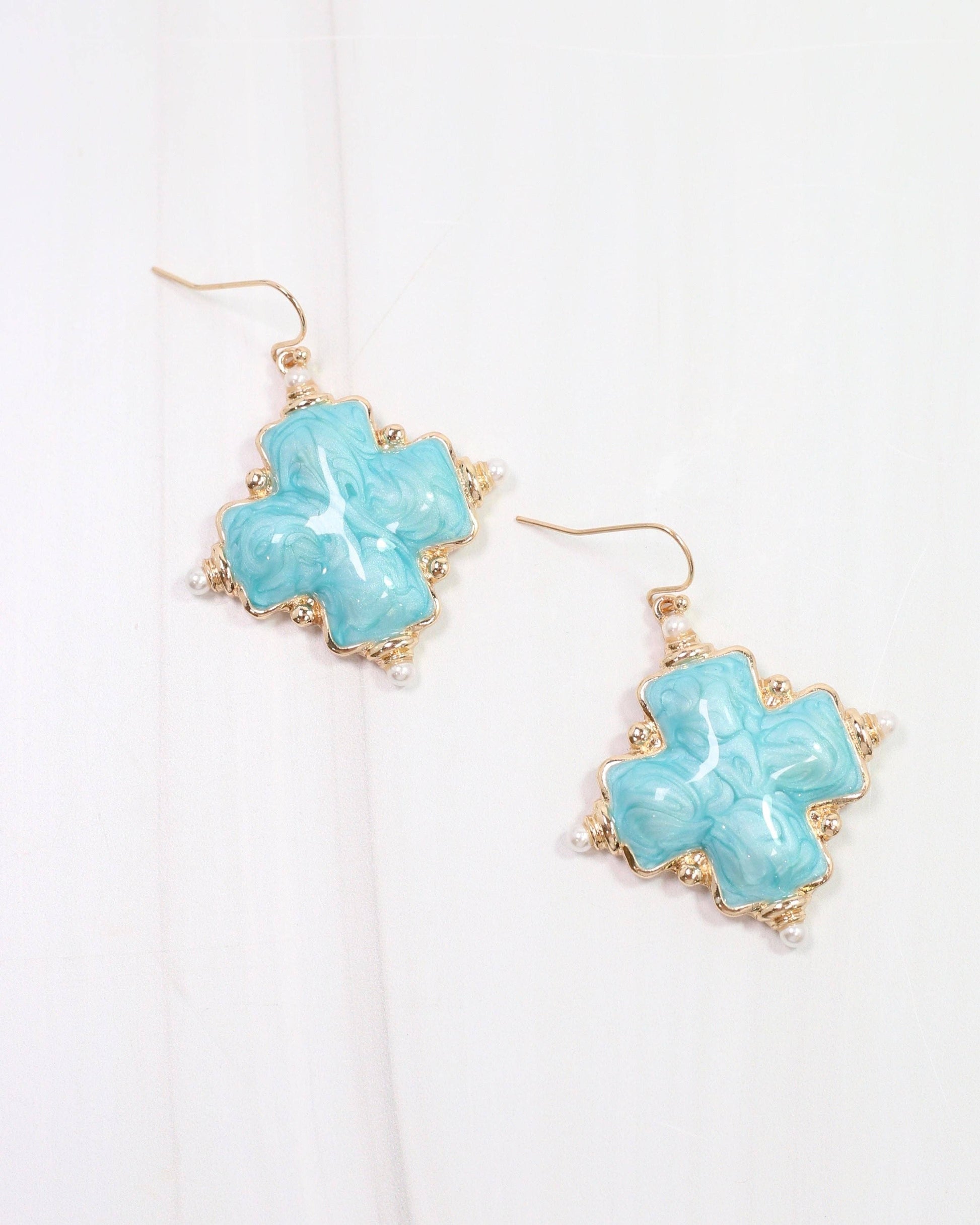 Add a touch of elegance and sophistication to your wardrobe with the Edie Enamel Cross Earring in Turquoise. Featuring a stunning turquoise enamel cross design with a delicate pearl at each point, these drop earrings are the perfect accessory for any occasion. Crafted with a brass fish hook post, these earrings are both bright and beautiful. Complete your look with these exclusive and tasteful earrings.
