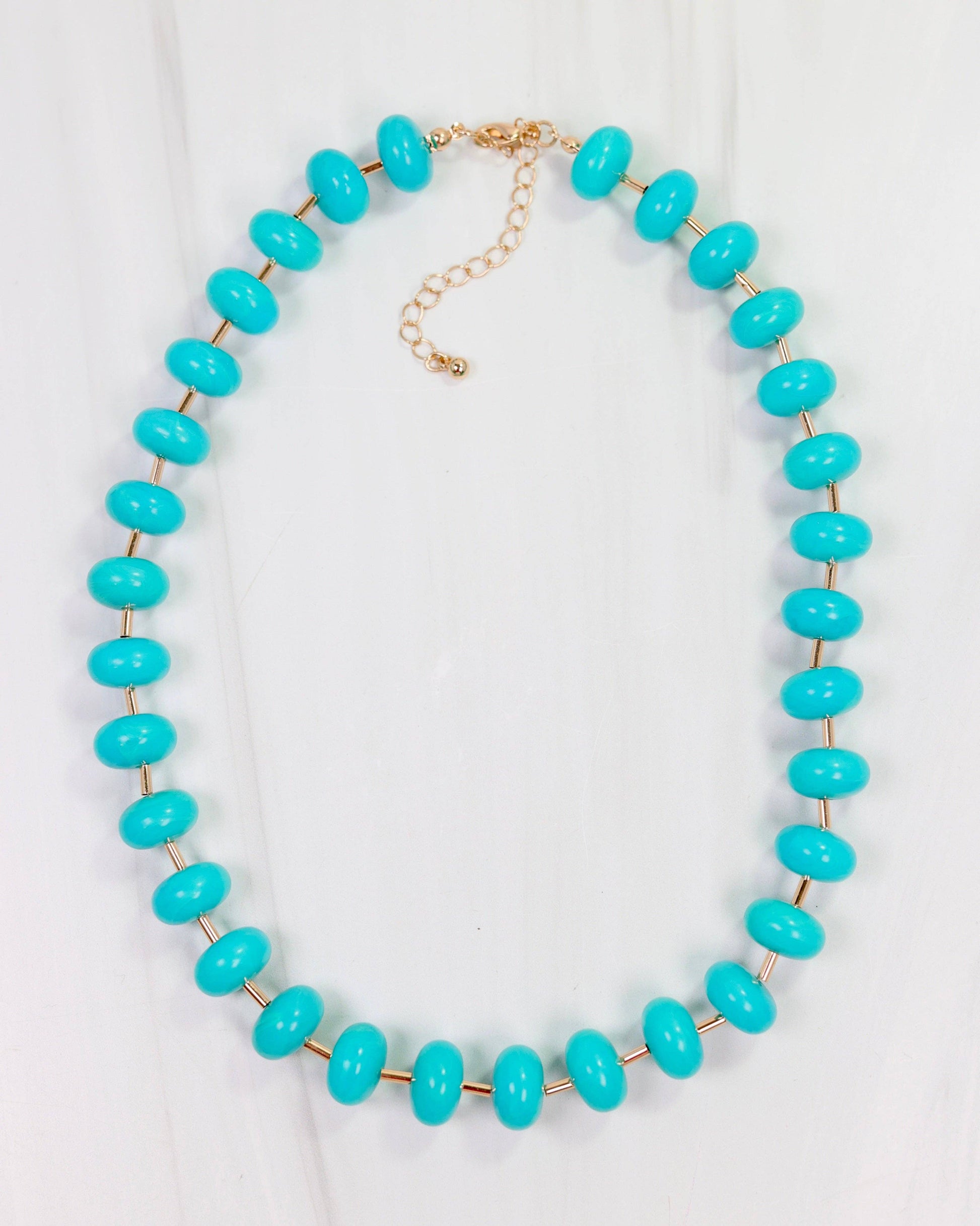 Add the cutest pop of color to any outfit with the Erica Beaded Necklace in vibrant turquoise. Featuring charming stone beads accented by delicate gold spacers, this playful piece brightens your look with effortless style. Perfect for layering or wearing solo, it’s a fun way to bring a fresh, cheerful vibe to your jewelry collection.