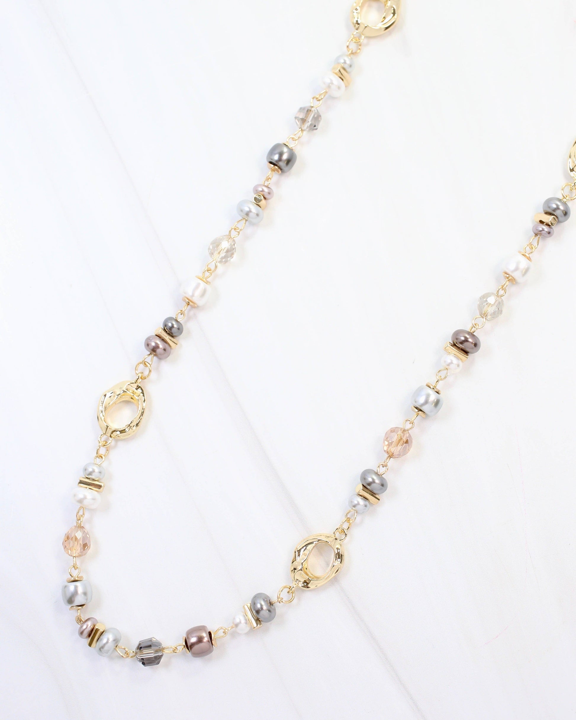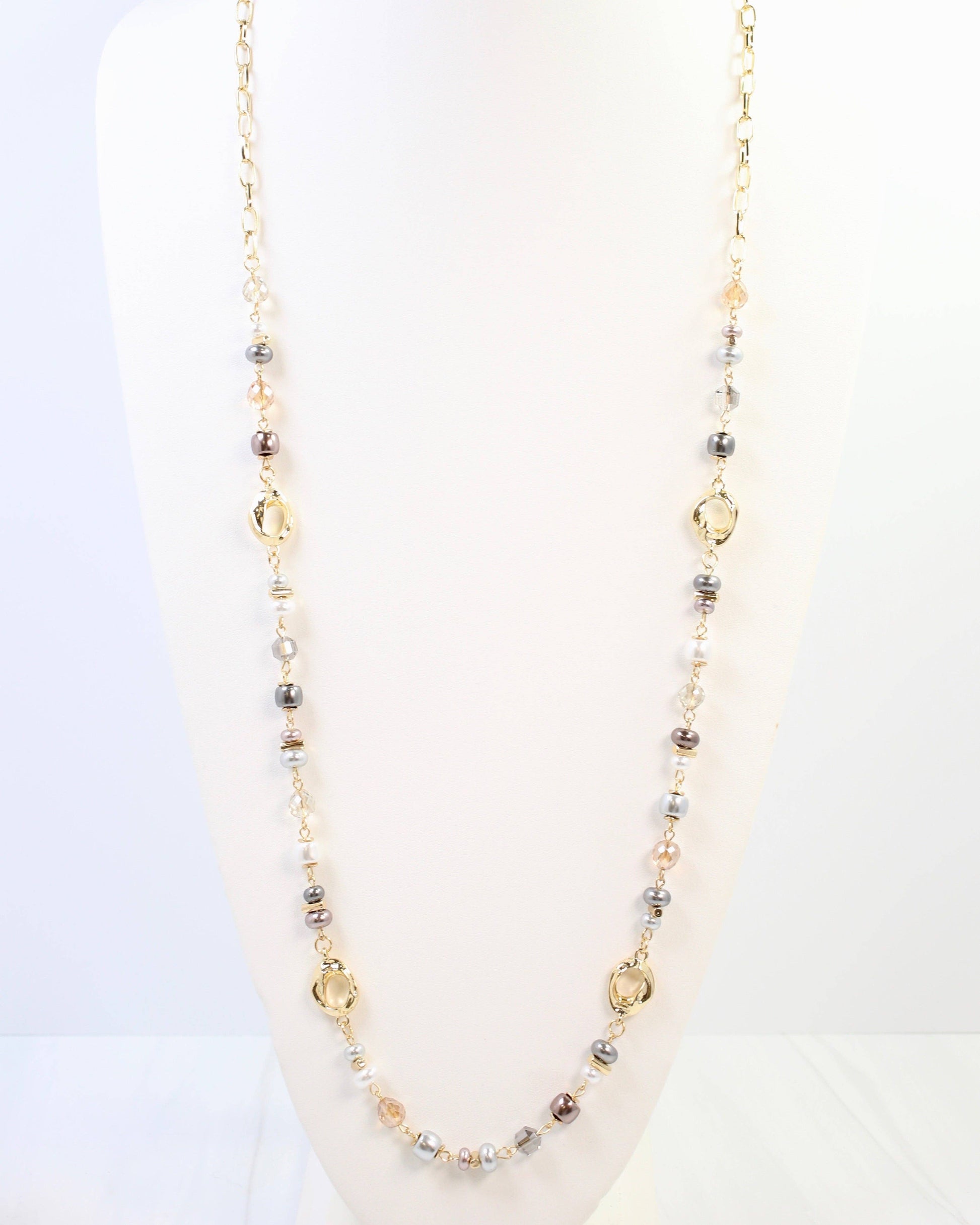 Elevate your style with the Fairbanks Long Glass Beaded Necklace in Gray Multi. Featuring elegant gunmetal beads paired with lustrous pearls and chic gold oval accents, this necklace adds a sophisticated touch to any outfit. Its versatile design effortlessly complements both casual and formal looks, making it a must-have accessory for fashion-forward wardrobes.