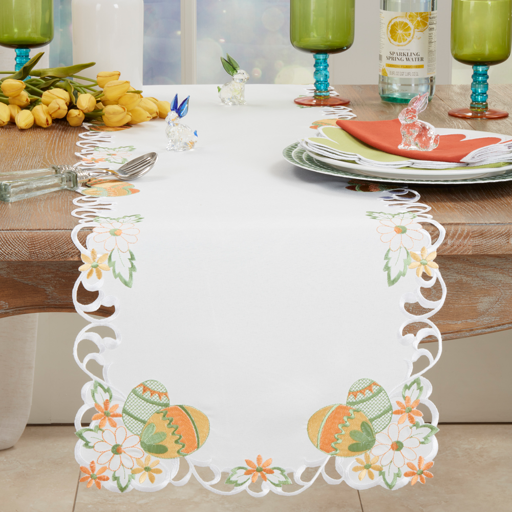 Color: Crisp white background with vibrant, multicolored Easter egg embroidery