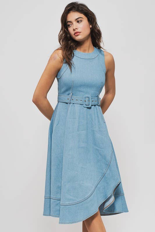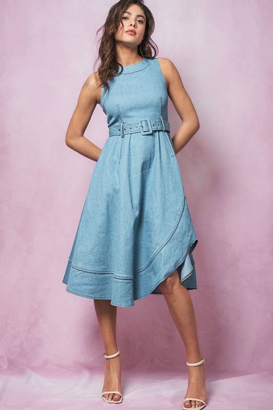 This elegant sleeveless denim midi dress features a flattering fit-and-flare silhouette, high-low hem, and a removable matching belt for versatile styling. Crafted from a comfortable stretch cotton blend, it offers hidden side pockets for convenience and a polished look perfect for summer occasions or everyday wear. Features: • 78% Cotton, 20% Polyester, 2% Spandex • S-M-L: 2-2-2 • High-low midi hem • Removable matching belt • Hidden side pockets •