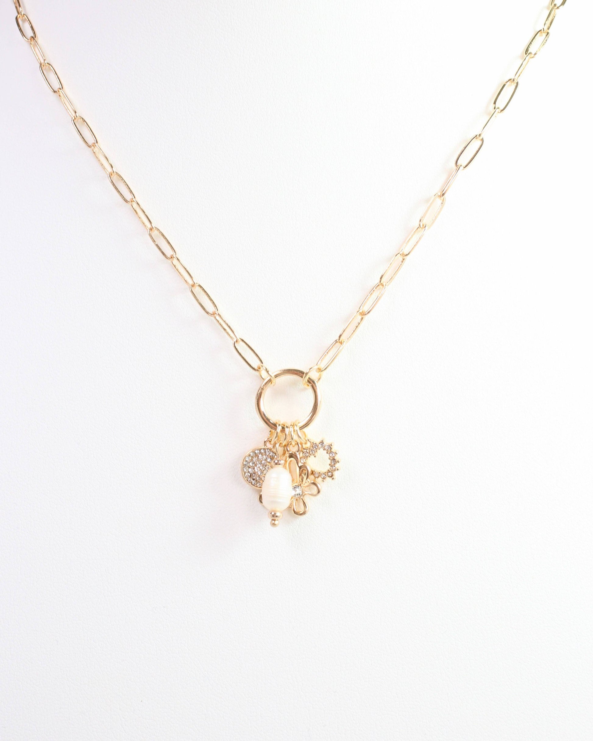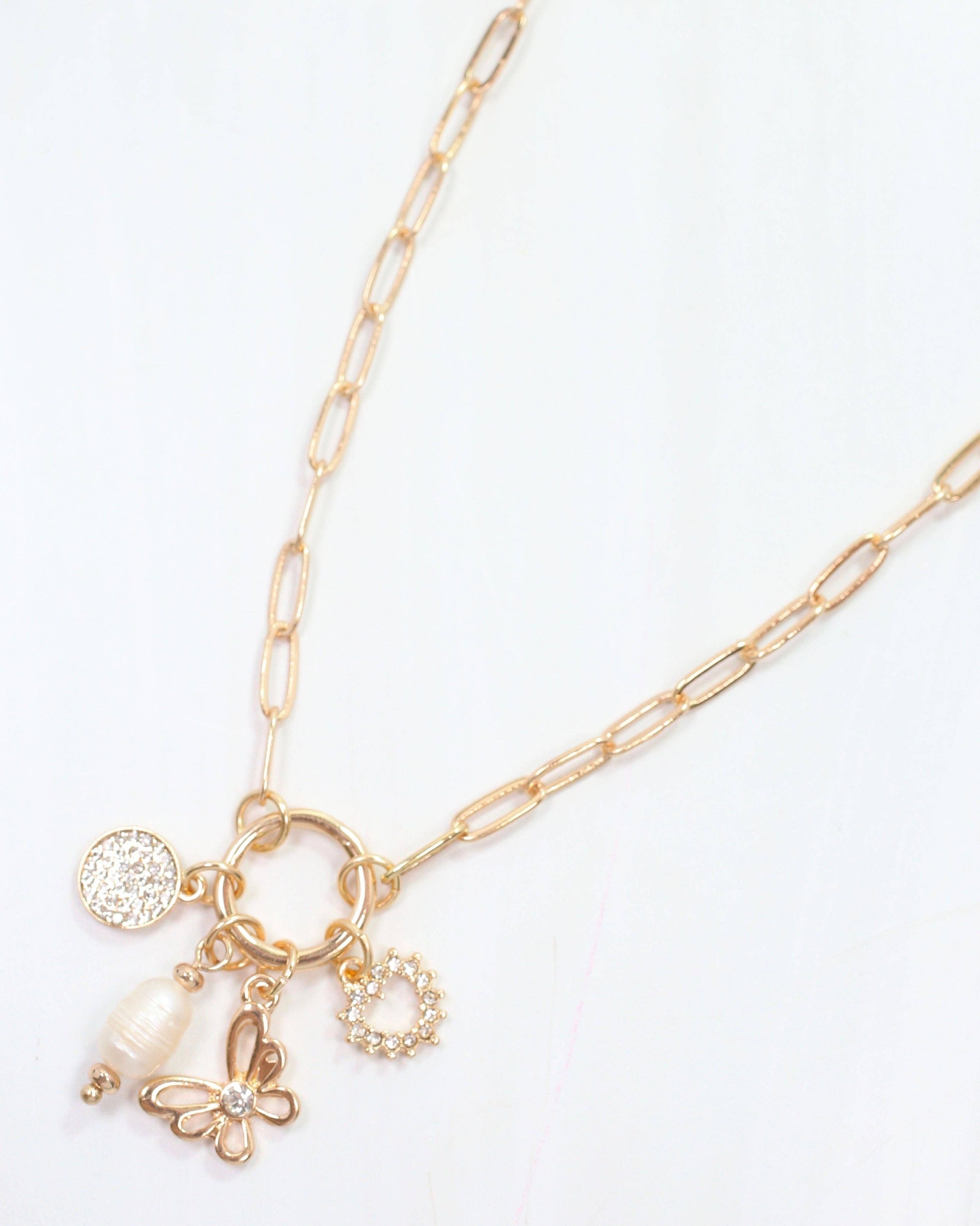Experience the timeless elegance of our Fordham Charm Necklace in gold. This stunning necklace features a delicate paperclip chain adorned with a cluster of charms, including a pearl, CZ heart, butterfly, and CZ Pave disc. Perfect for all ages, this necklace adds a touch of sophistication to any outfit. Get the popular charm trend with a modern twist.