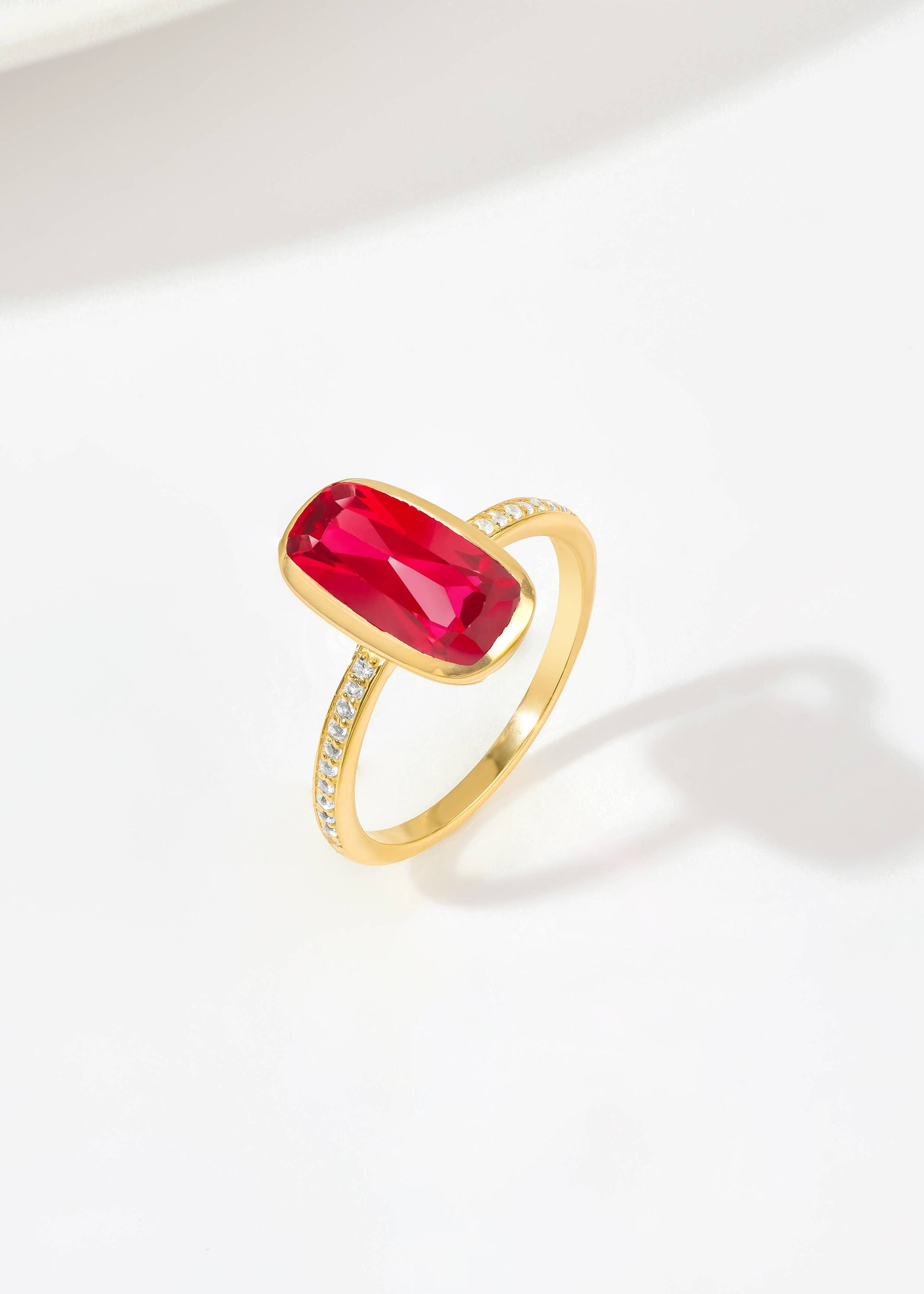 This gold plated over 925 silver ring commands attention with a cushion-cut lab created ruby gemstone bezel-set at its center, radiating warmth and intensity. The bold centerpiece is framed by a polished gold bezel that enhances its faceted brilliance. Along the upper half of the band, a row of round brilliant-cut white topaz adds refined sparkle, creating a contrast that’s both luxurious and precise. The composition is balanced, the craftsmanship deliberate—designed for those who lead with clarity and never compromise on detail.
