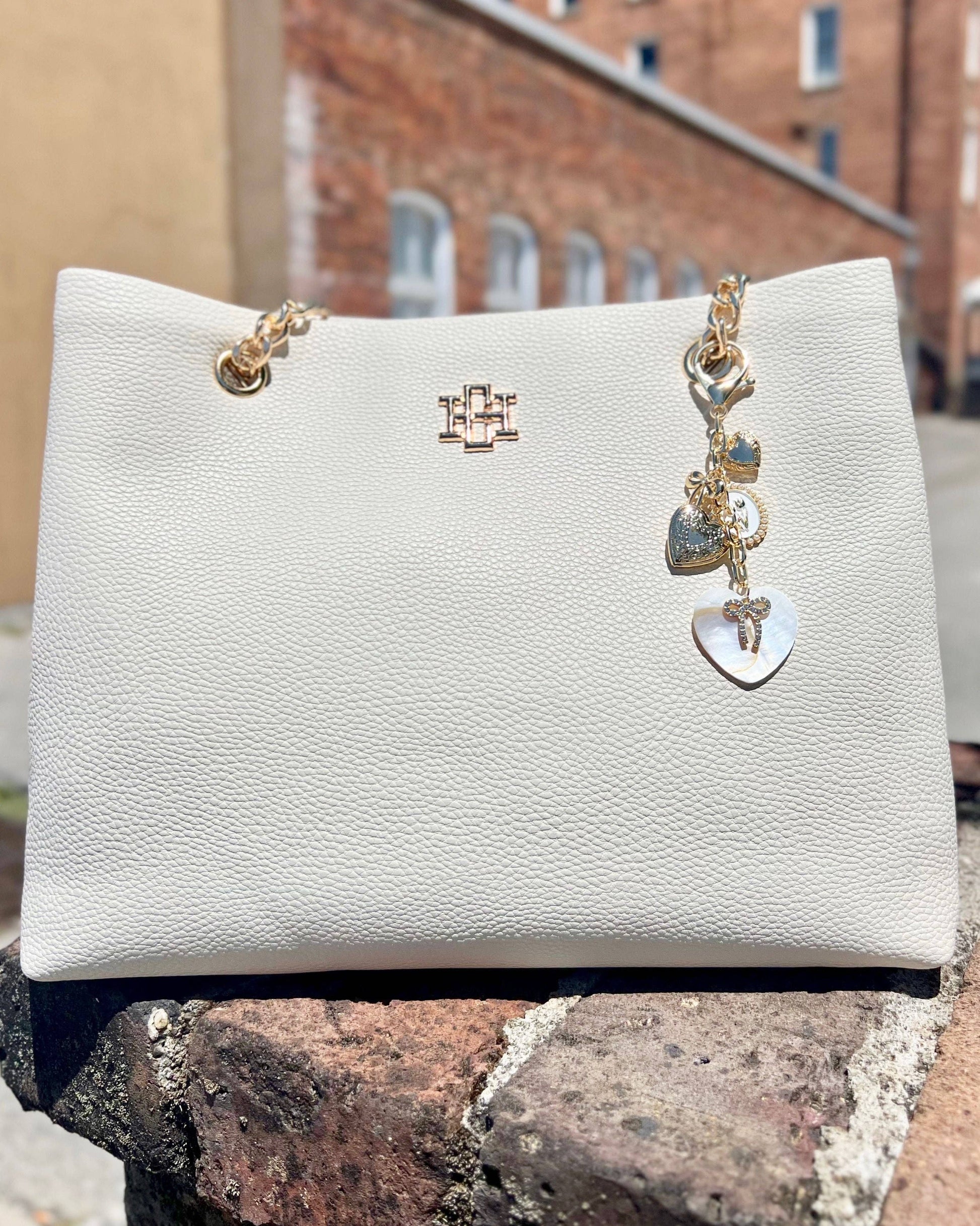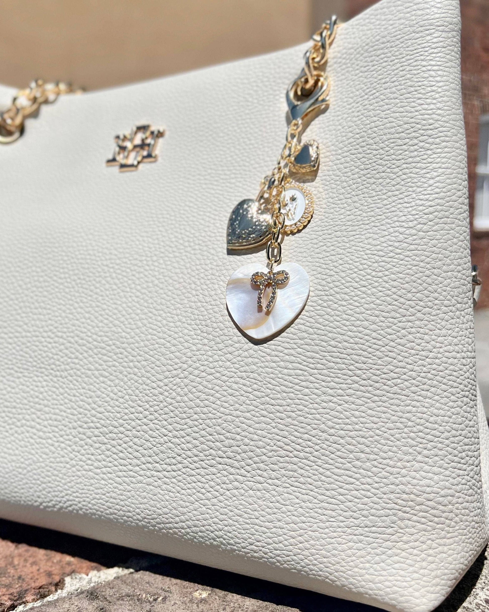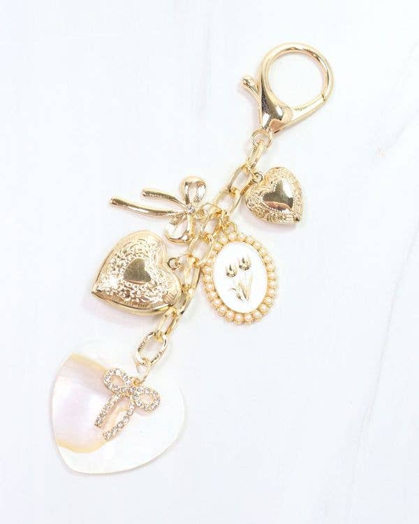 Add a touch of elegance to your handbag with our Hearts of Gold Bag Charm. The classic gold finish, etched hearts, working locket, pearlized shell heart, and crystal bow all contribute to its girly and sophisticated appeal. Designed to also serve as a keychain, it's the perfect accessory for any fashion lover.