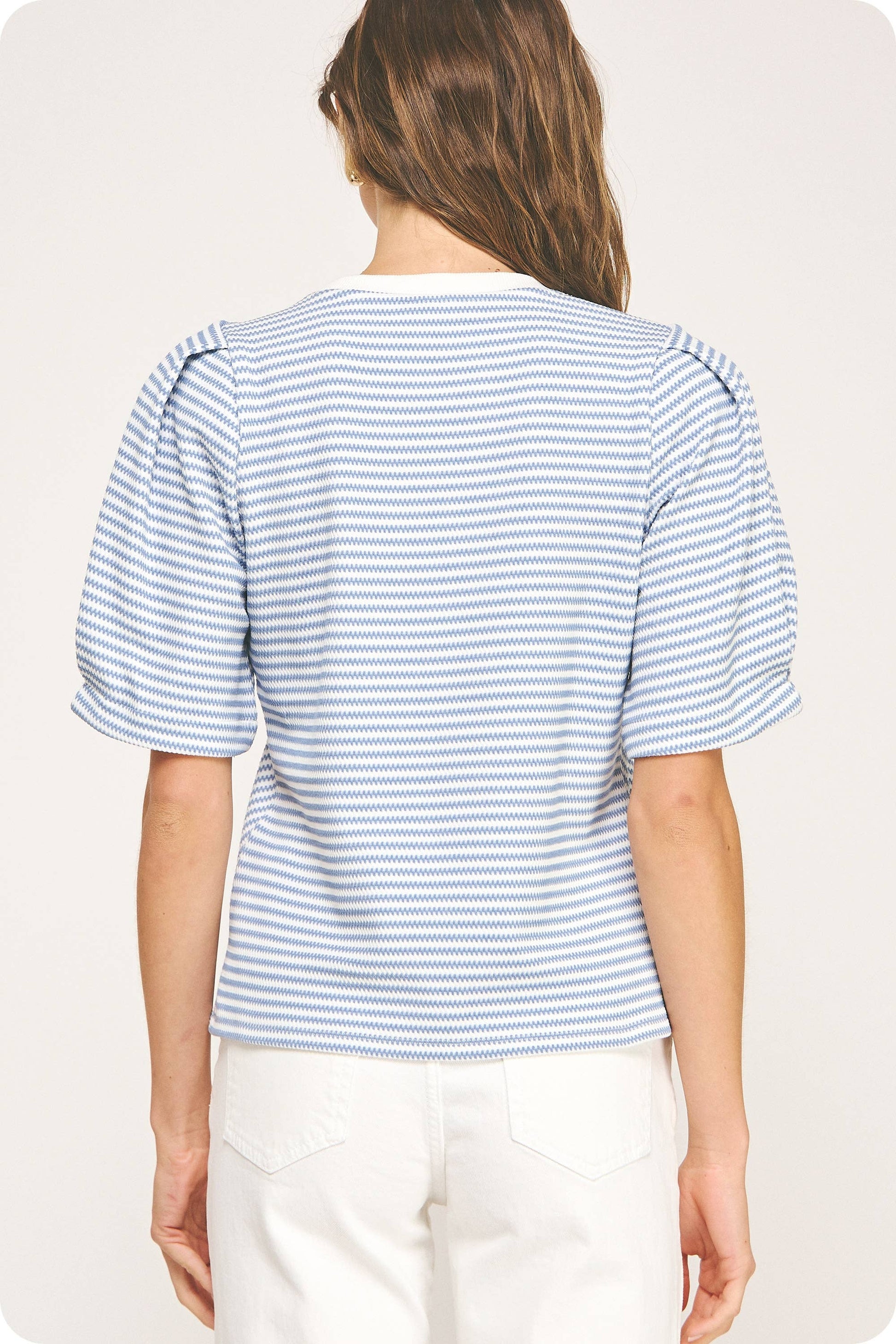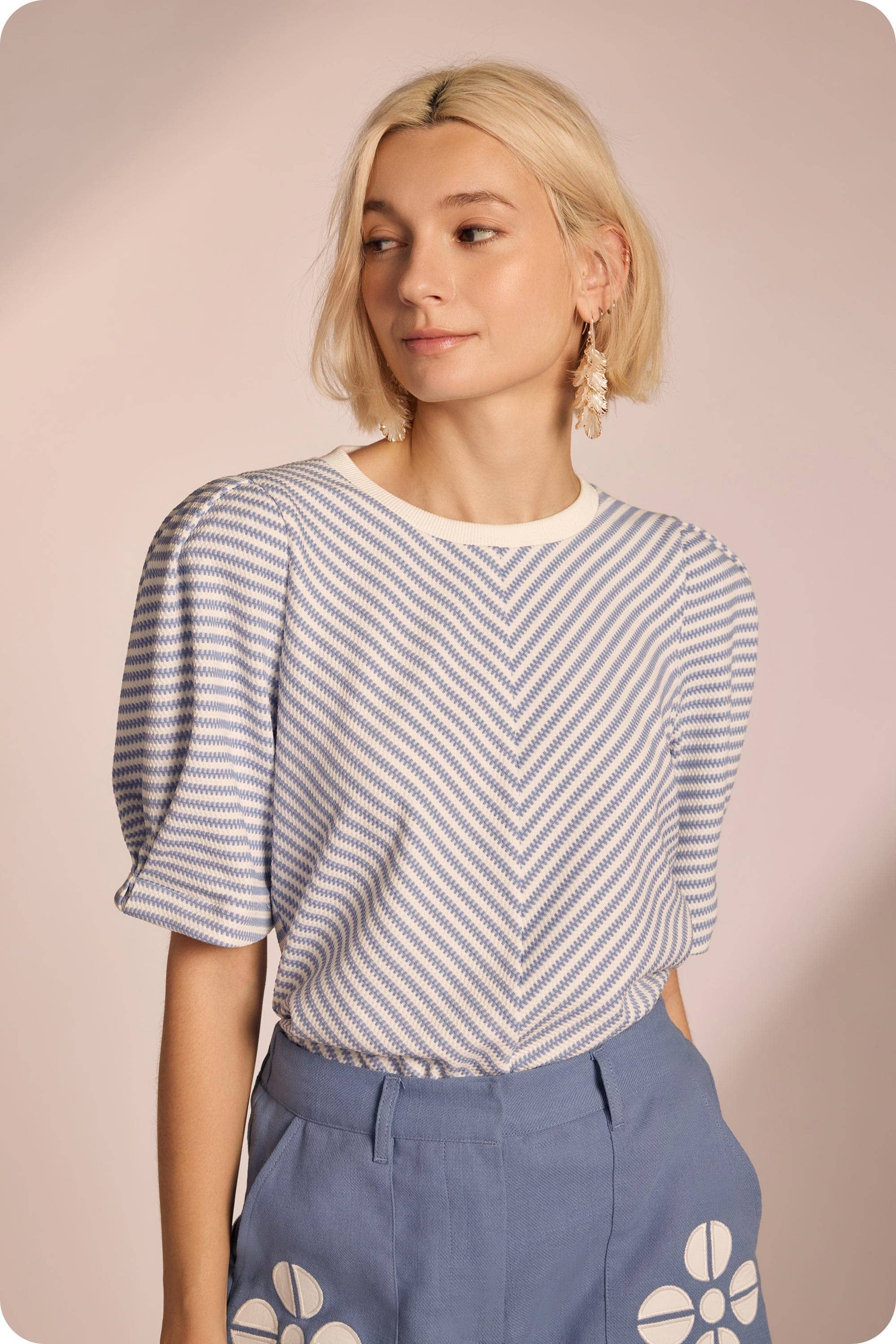 Studio Strut and Bolt Collection. Herringbone tee blouse in stretch striped knit fabric. This updated t-shirt style features herringbone stripe design on front, a ribbed round neck, puff short sleeve, pleat detail at shoulder, and a relaxed fit.