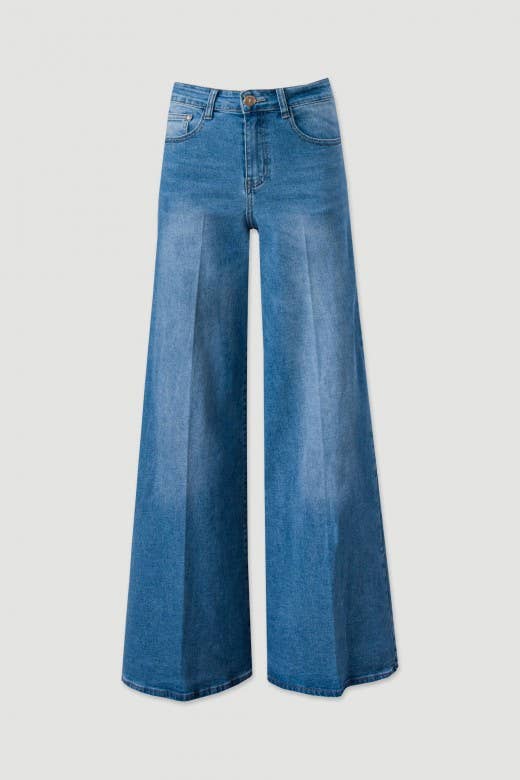Only 1 pair left! High-waisted wide-leg jeans with front pockets and patch pockets at the back. Zipper fastening at the front, with a custom metal button for a modern and unique touch. A stylish basic for versatile and comfortable looks. Measurements: 34 length:109cm waist:34cm hip:37cm hook:30cm 36 waist:36cm hip:39cm 38 waist:38cm hip:41cm 40 waist:40cm hip:43cm 42 waist:42cm hip:45cm