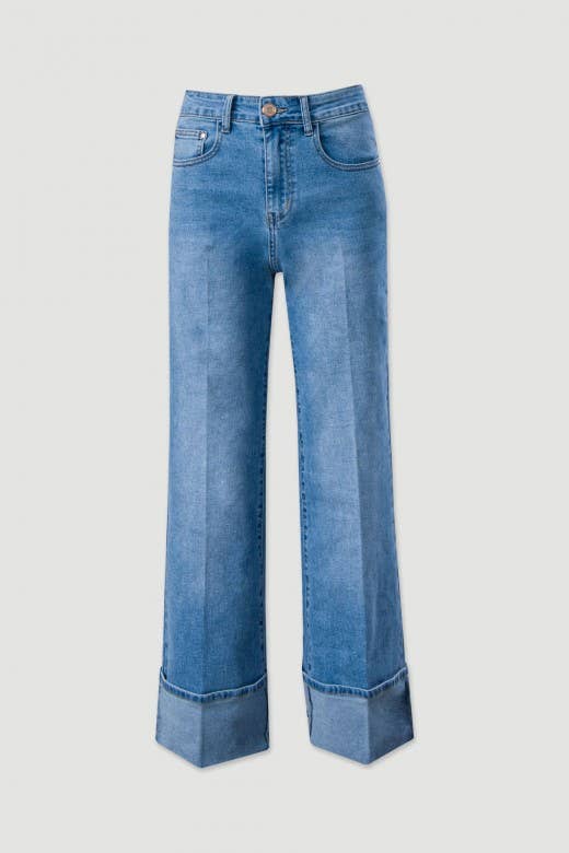 Only 2 left! Size 34 = Size 2 US. Size 40 = Size 8 US. High-waisted wide-leg jeans with a folded hem. Front zip closure with a metallic button. Front pockets. Fabric with a cotton blend. Measurements: 34 length:106cm waist:34cm hip:40cm hook:29cm 36 waist:36cm hip:41cm 38 waist:38cm hip:42cm 40 waist:40cm hip:43cm 42 waist:42cm hip:44cm