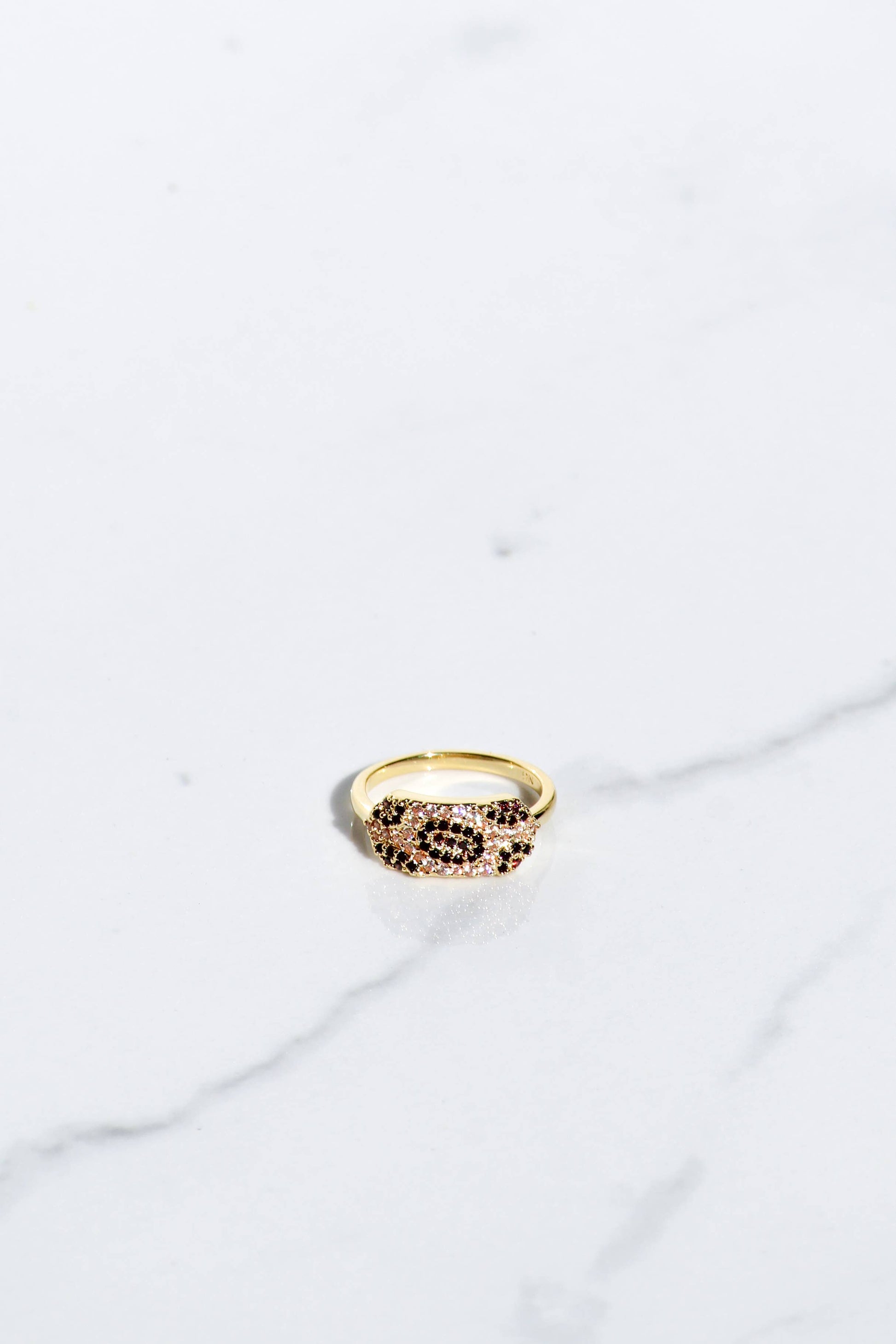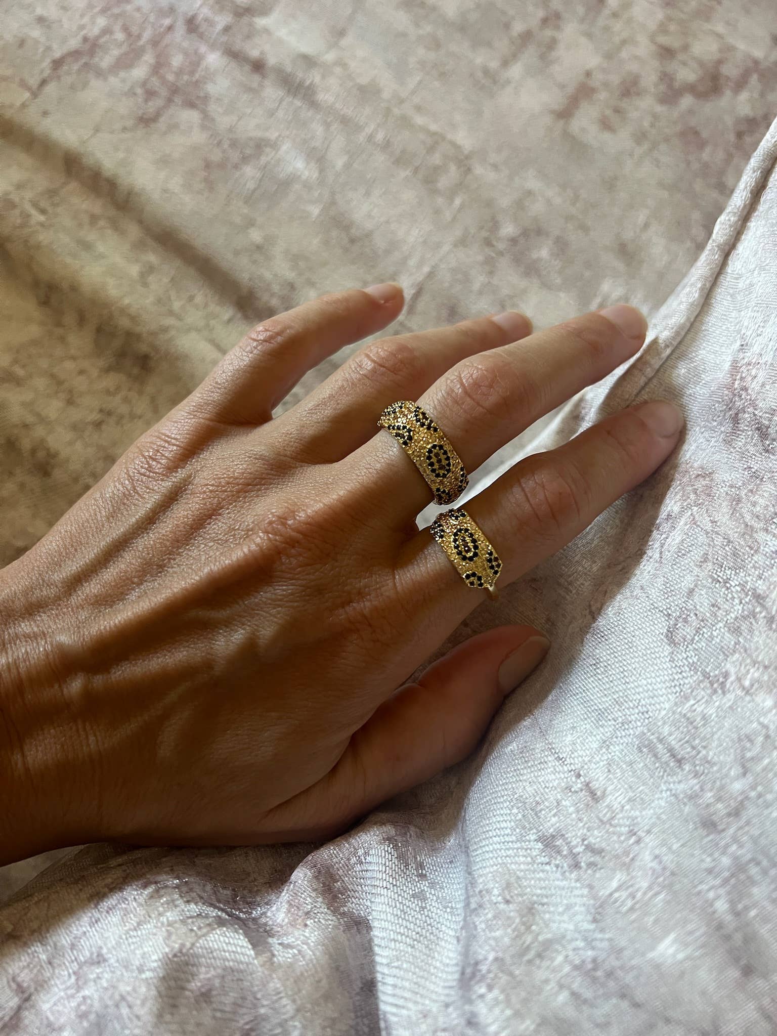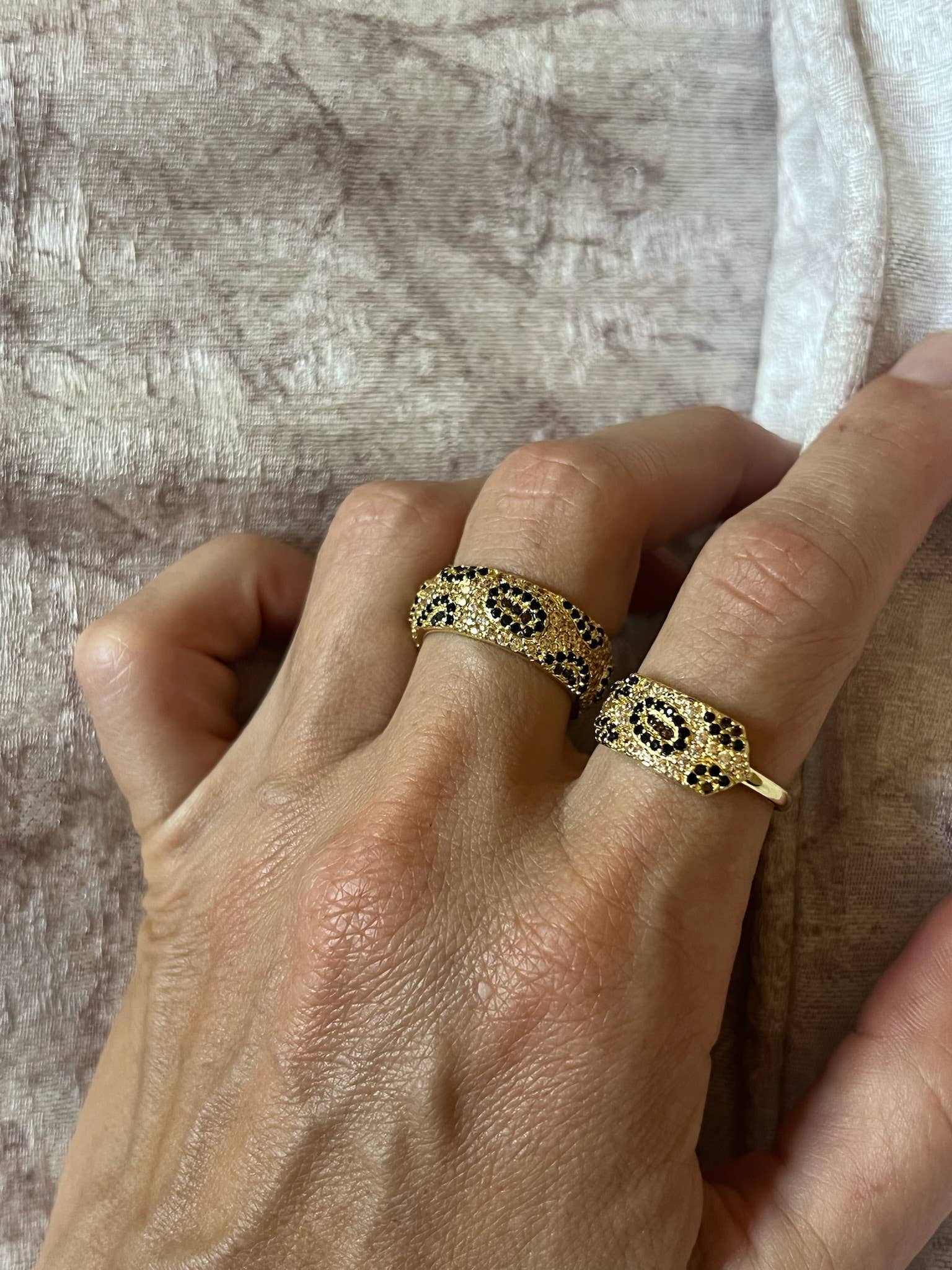 A popular ID ring features a stunning leopard CZ design set in luxurious 14K gold vermeil. A perfect statement piece that blends sophistication with wild style.