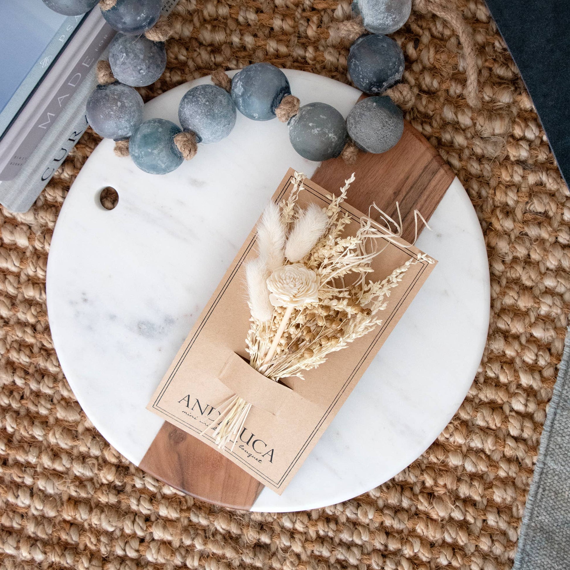 Our floral team designed this beautiful MINI bouquet using an assortment of bunny tails, sola flower, and flax to create this charming and petit mini bouquet arrangement. Each bouquet is designed and handcrafted in our California design studio and is a perfect decorative accent to your tablescape or vignette.