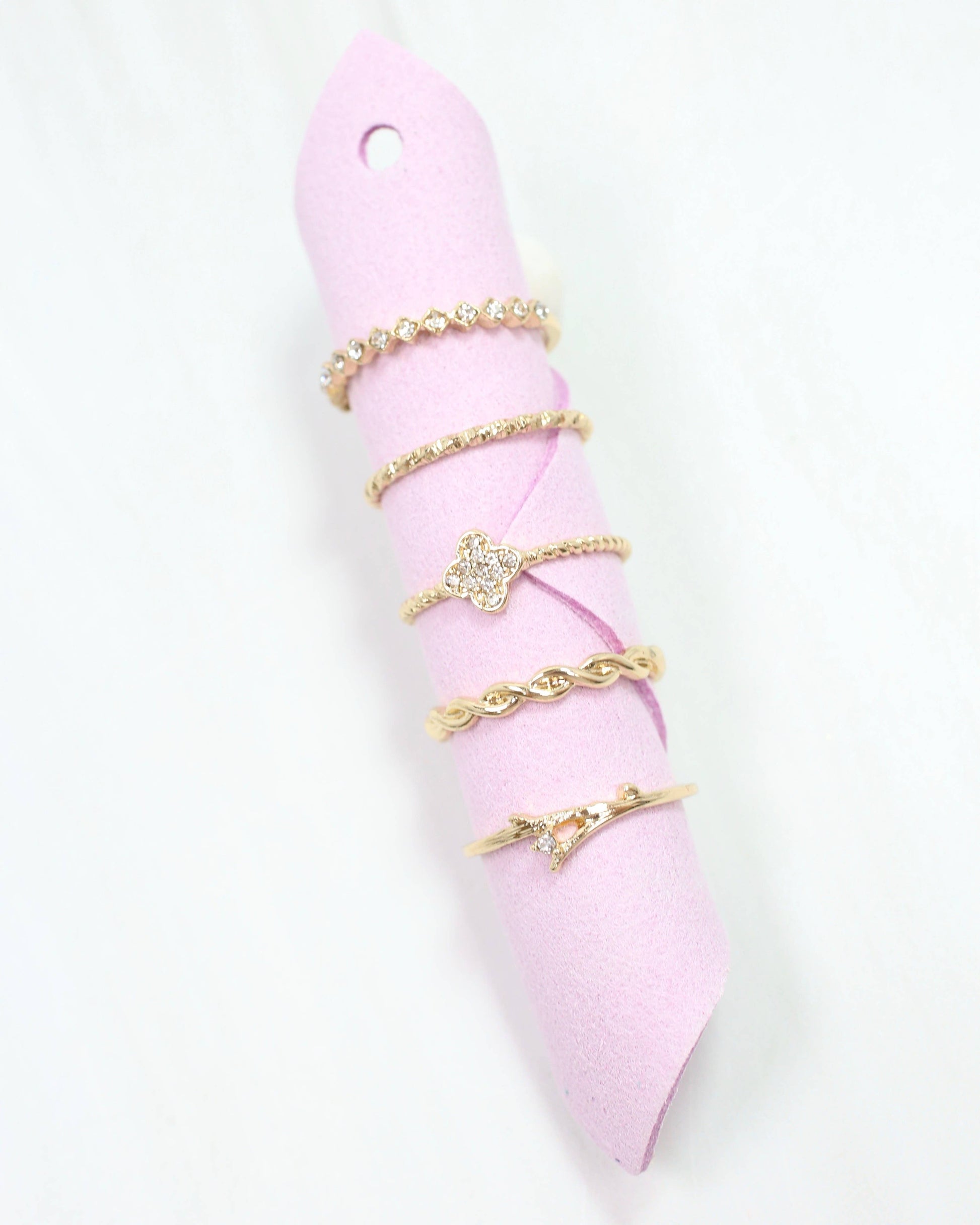 The Joey Ring Set Gold includes five playful gold rings: a pave clover, crystal band, branch design, and twisted styles. Perfect for mixing and matching!