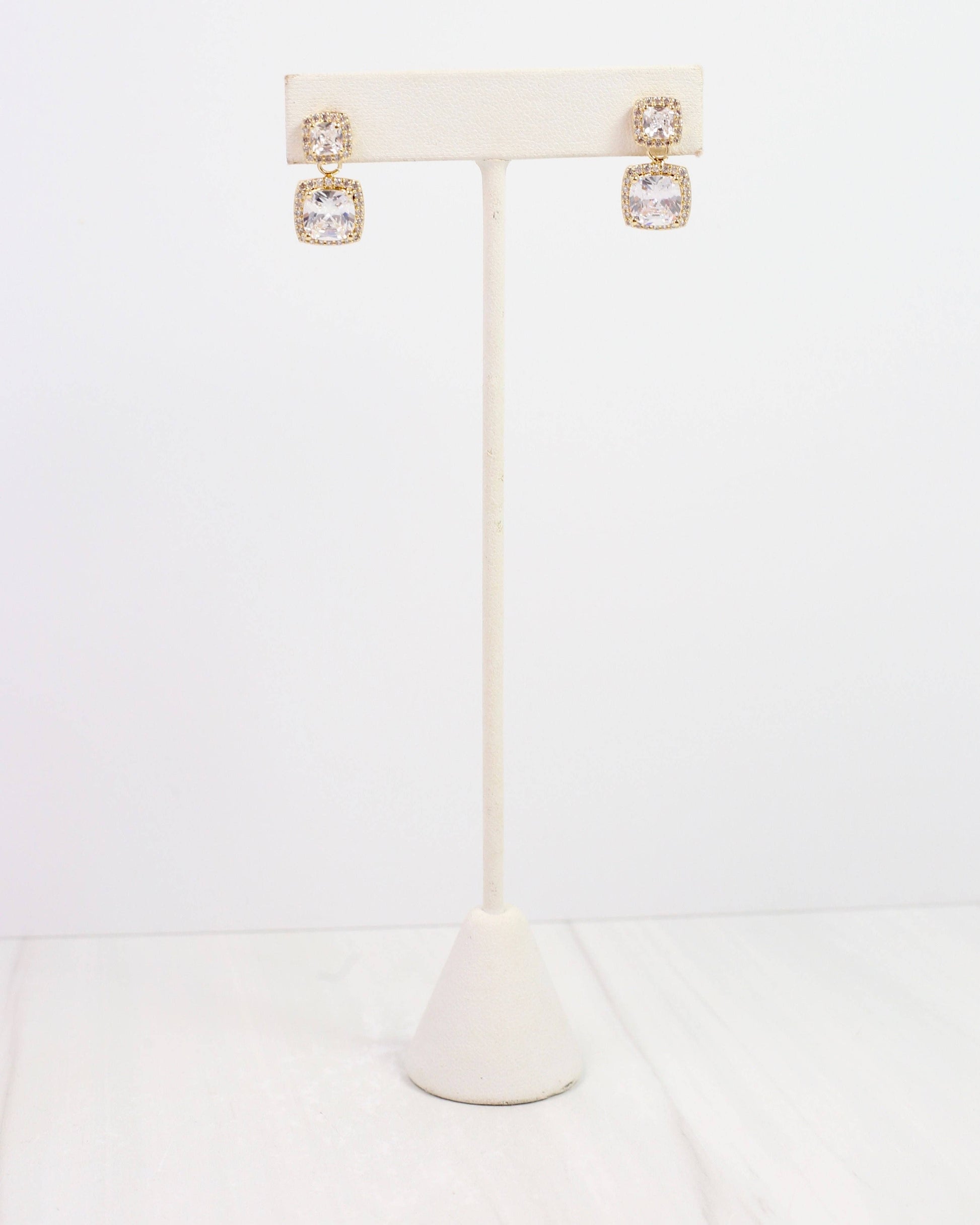 Add a touch of sparkle with the Katherine CZ Drop Earrings in Gold. Featuring a chic square stud paired with a larger square drop, these gold-dipped beauties shimmer with dazzling cubic zirconia. Perfect for brides or anyone ready to shine at a fancy event, they bring elegance with a playful twist.