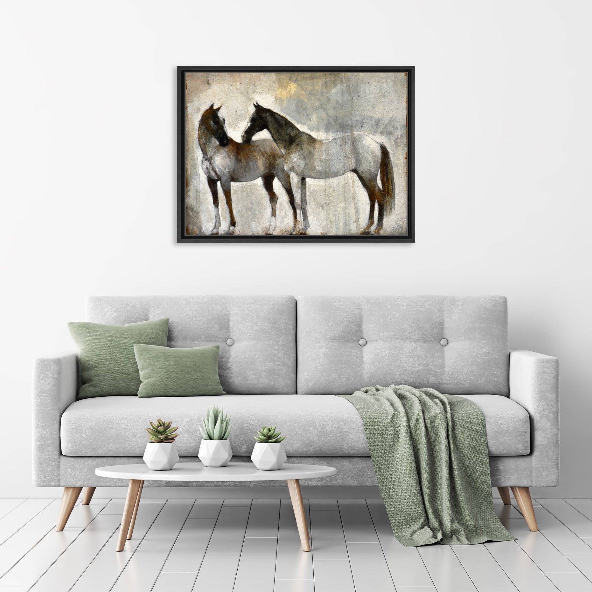 Follow 'Kindred' stallions by Norman Wyatt Jr. who wander modestly through bleak shadows. The horizontal decorative artwork will complement your space with its transitional and contemporary aesthetic. This piece is handcrafted in Chattanooga, Tennessee by Ready2HangArt using a locally sourced artist print, with a frame and a rear hanger for simple installation. Offering a wide range of transitional subjects and unique textures, Norman Wyatt's collections will add interest to any modern or contemporary decor.