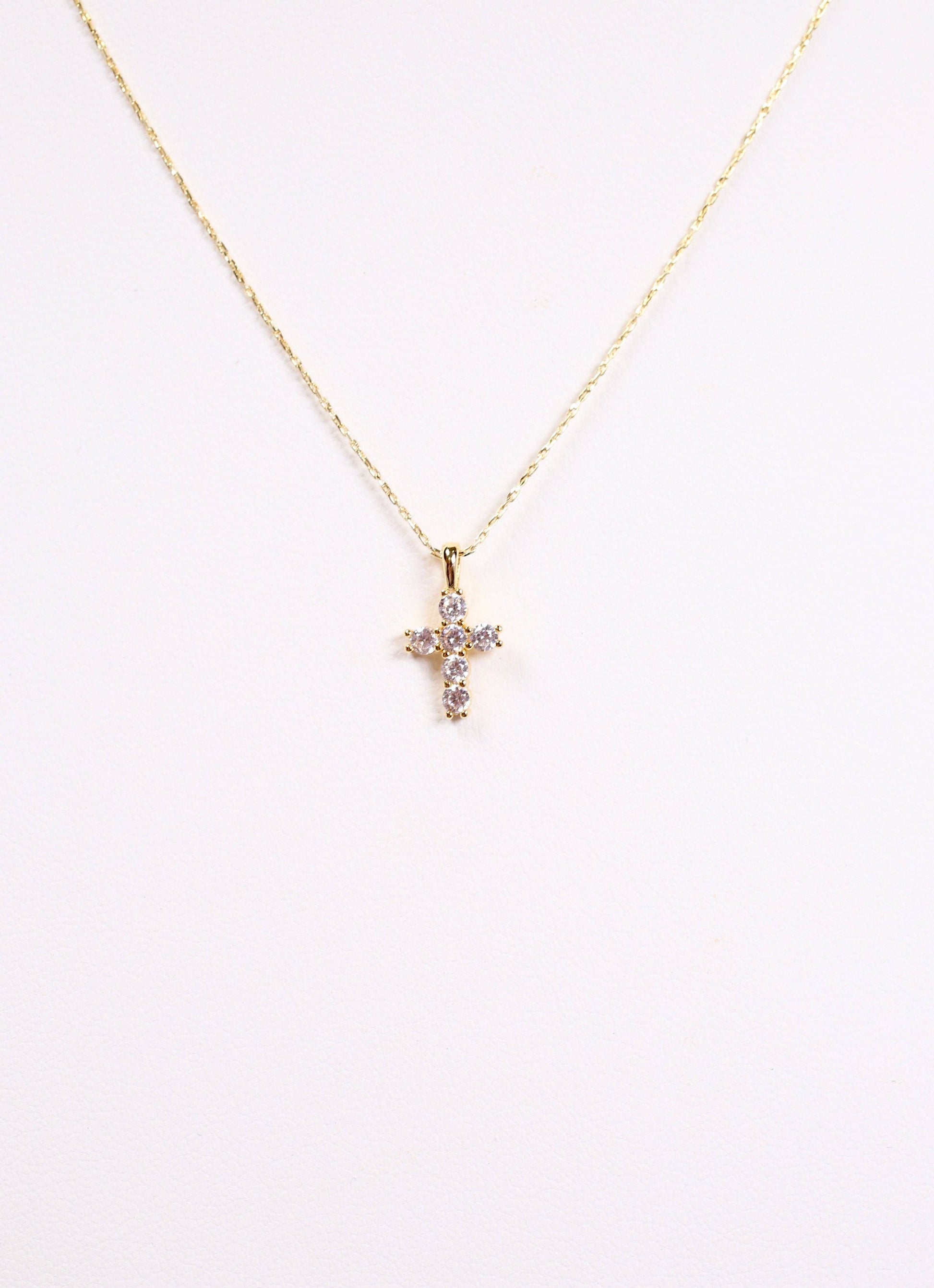 This delicate necklace features a single CZ lined cross charm that is so beautiful. This is a great stand alone piece, or it can by layered with other necklaces for a fuller look. Gold dipped.