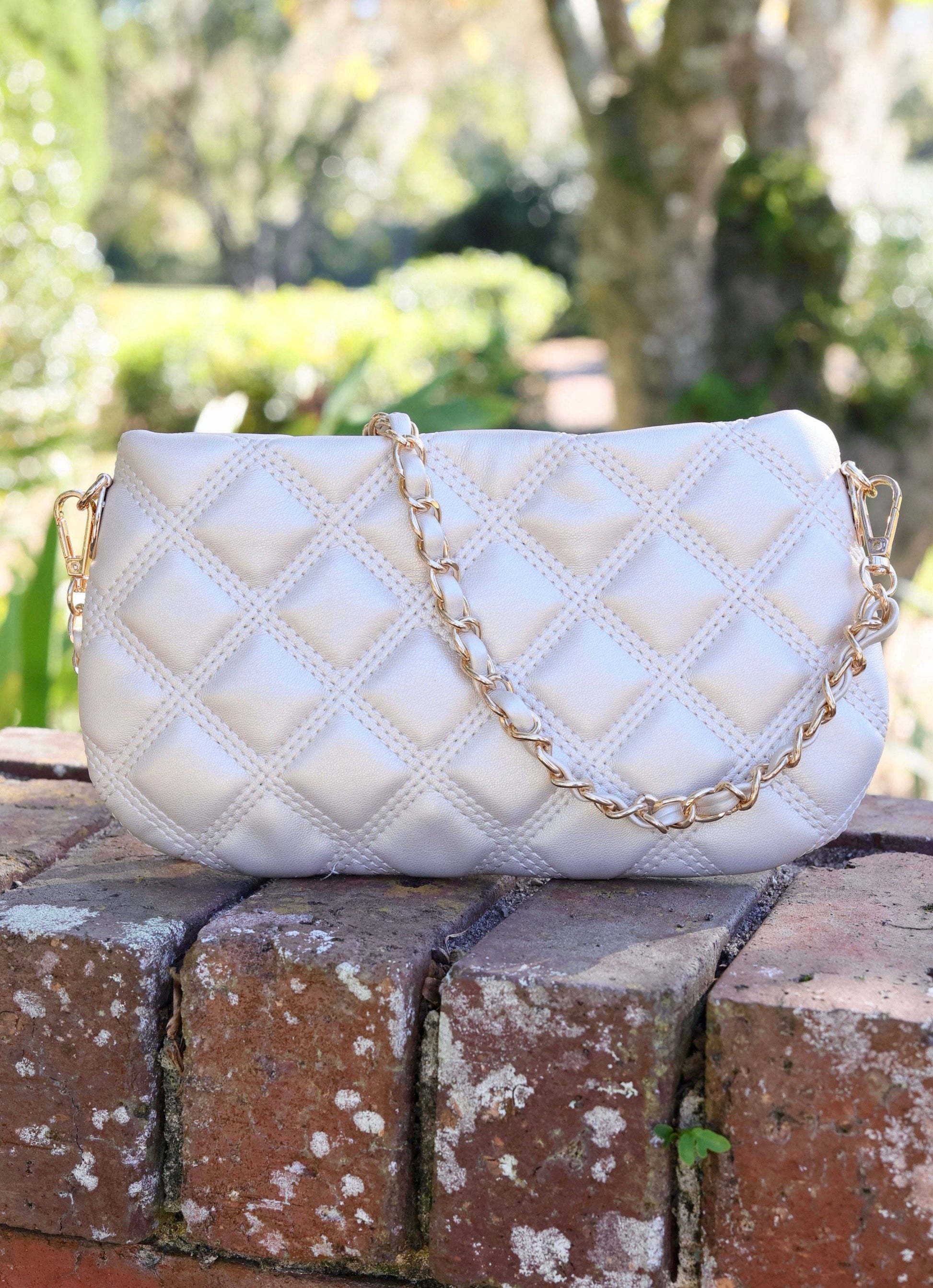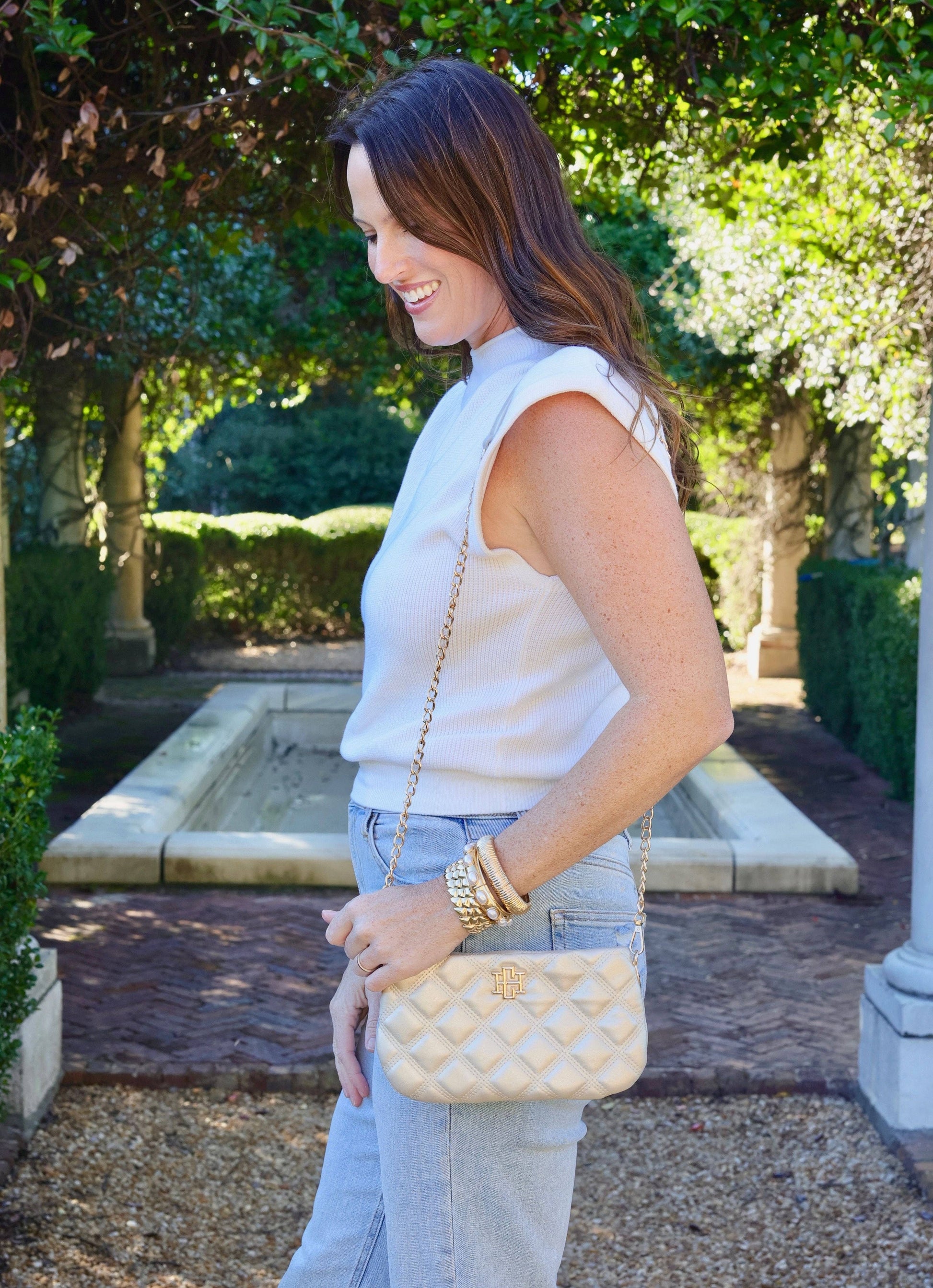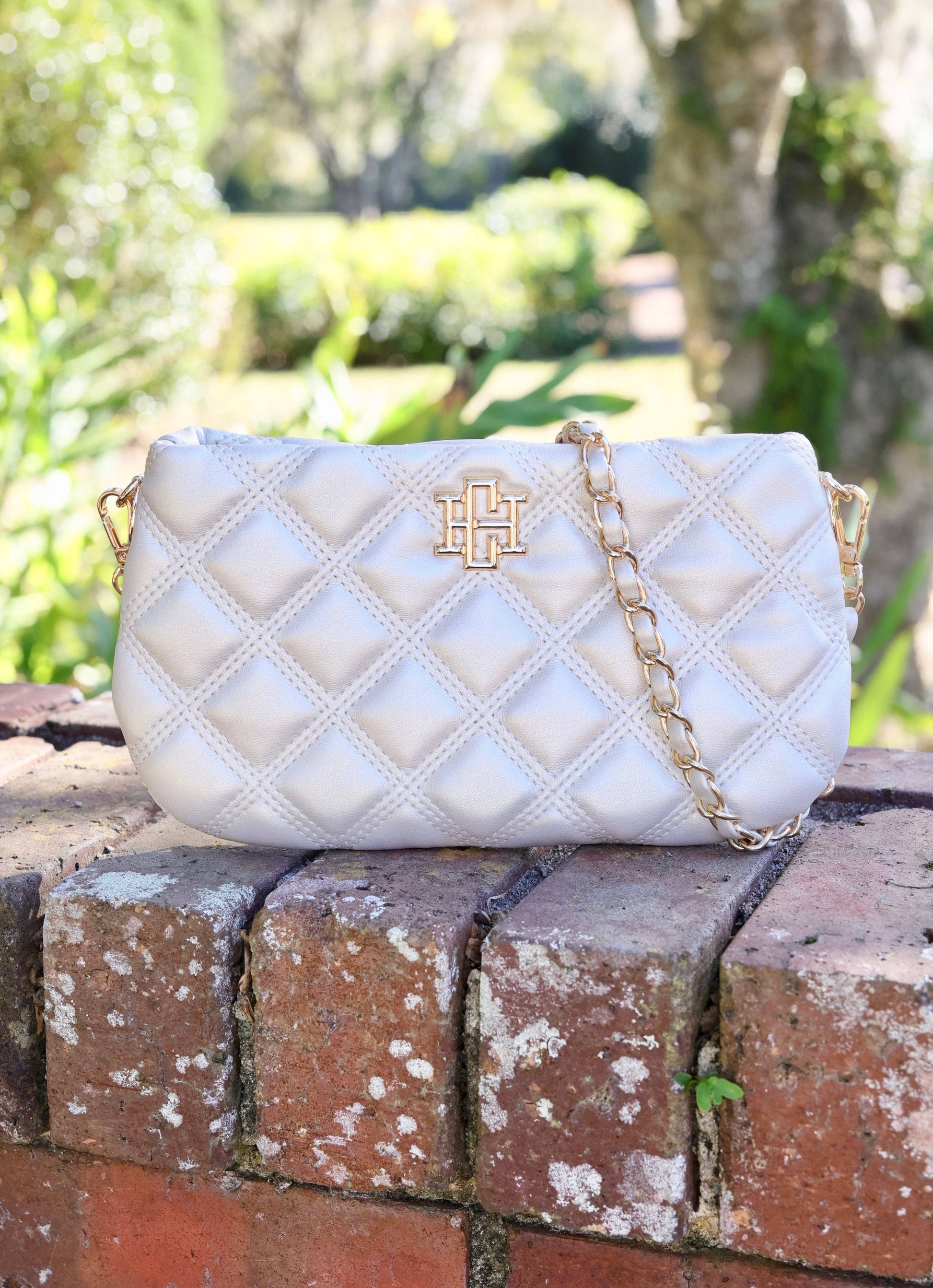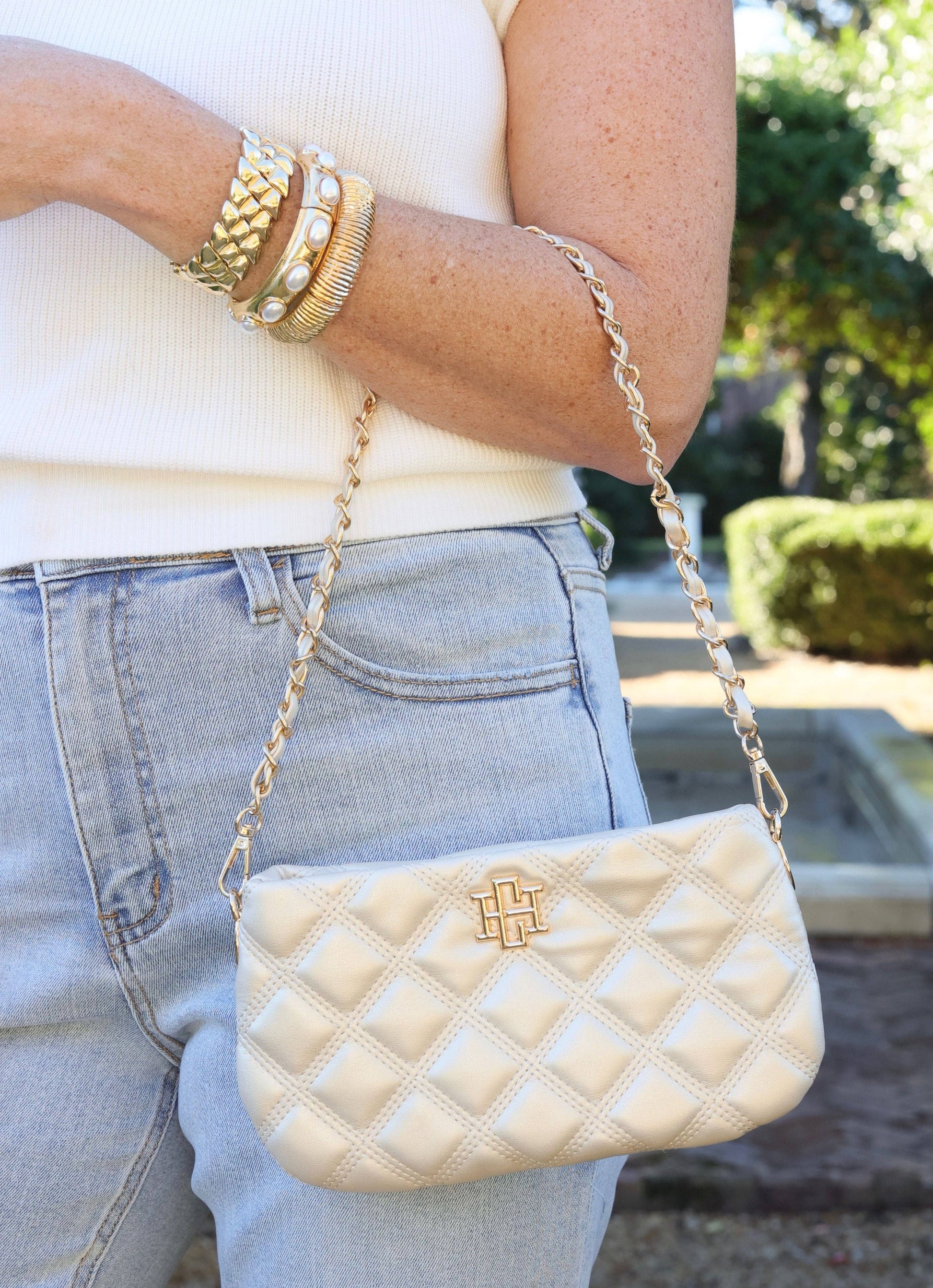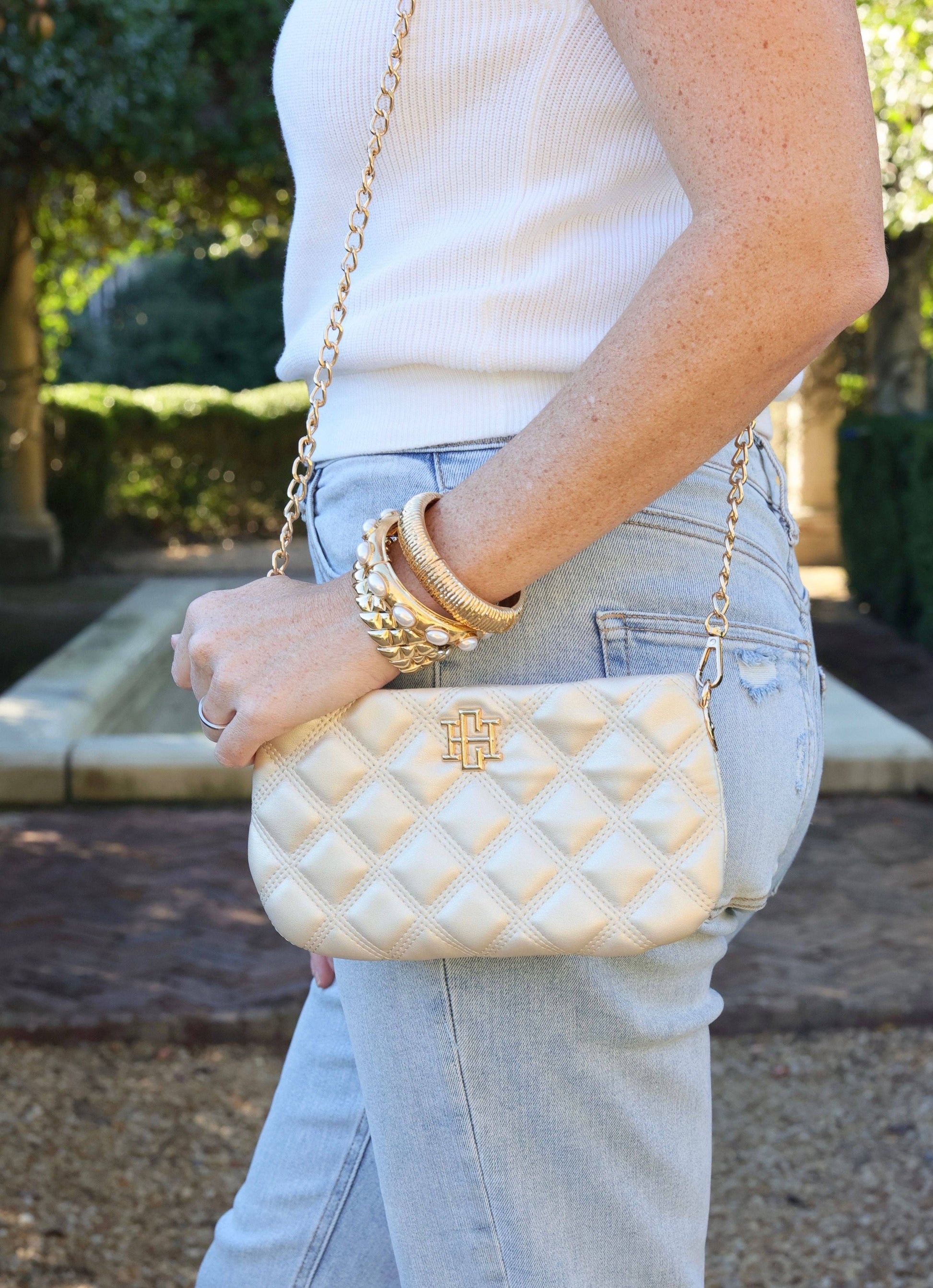 This slim silhouette crossbody features a vegan leather quilted fabric. The Caroline Hill logo is centered at the top of one side, and there is a top zippered closure as well. The interior features a zippered pocket and a single open pocket as well. This handbag comes with two removable strap options- one shorter braided strap and one longer strap with a matching piece of material on the strap.