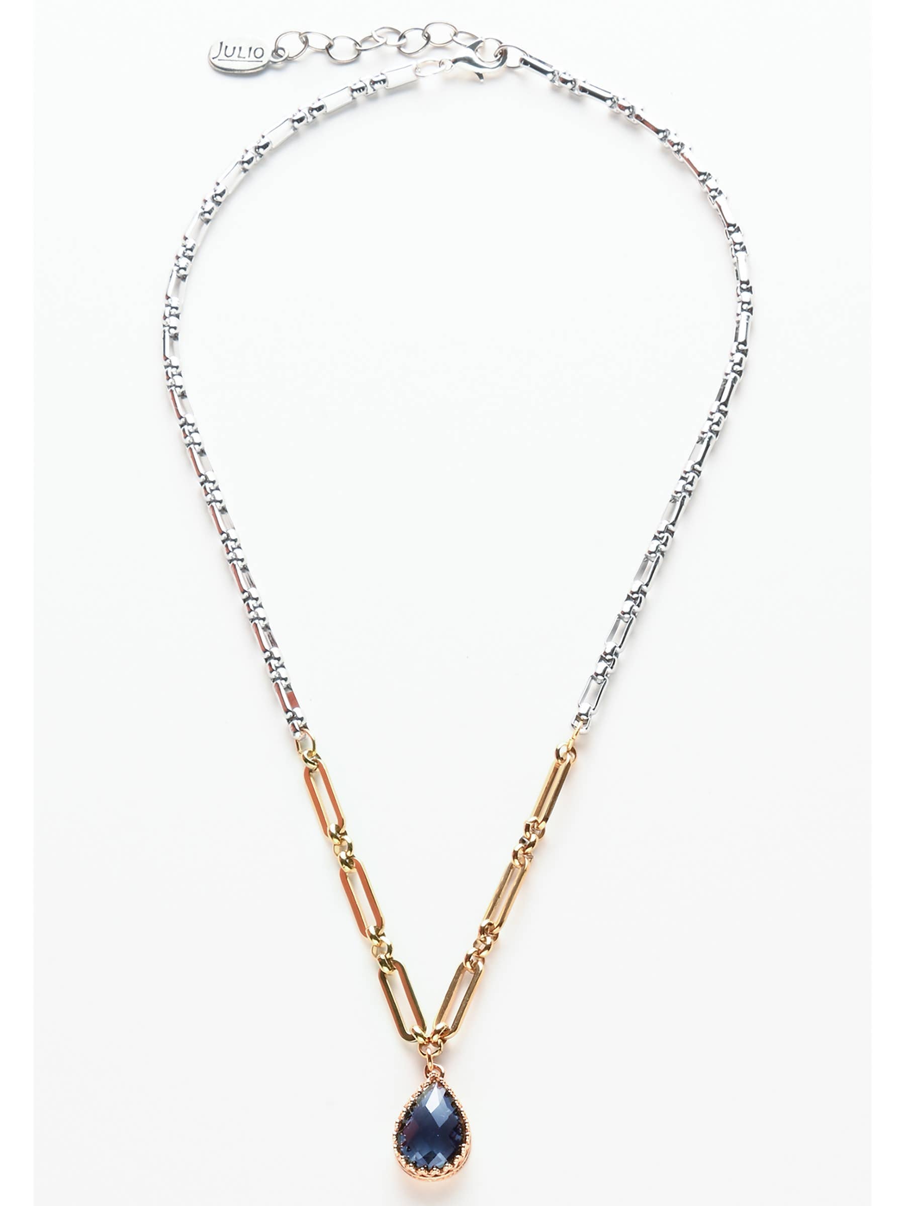 2-toned and duo-textured chain with faceted crystal pendant. 16" length with 2" extender.