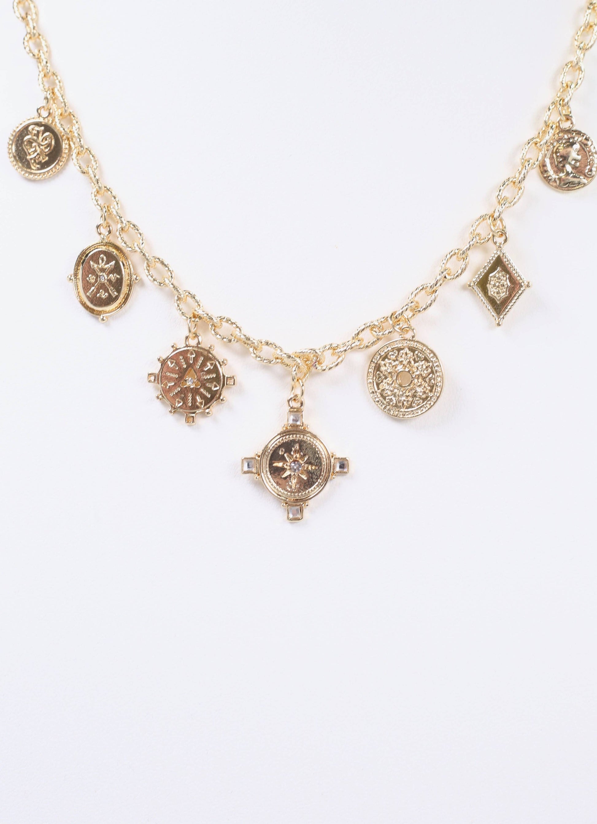 This textured link necklace has seven charms each with their own unique design. It is the perfect style to add to an outfit for a classy look.
