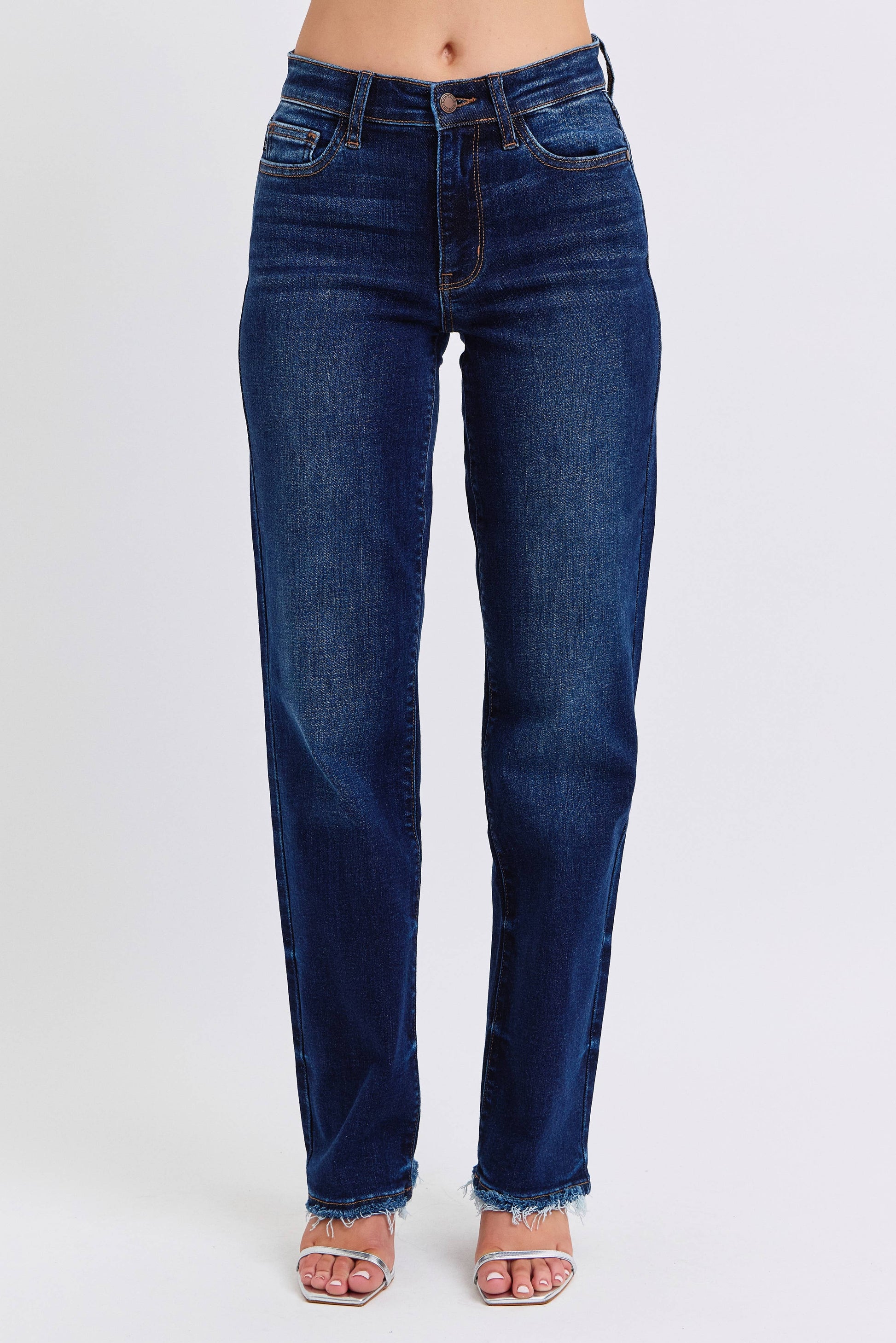Step into the world of contemporary fashion with our Mid Rise Straight Leg with Fray Hem jeans from Judy Blue. Designed with a unique blend of timeless appeal and a modern twist, these jeans capture the effortlessly chic vibe of California. Our passion for denim has led us to create jeans that are trendy, comfortable, and have a body-hugging fit. With unique wash techniques and superior quality, these jeans are perfect for a casual day out or to add a stylish touch to your wardrobe. Feel the difference with every wear.