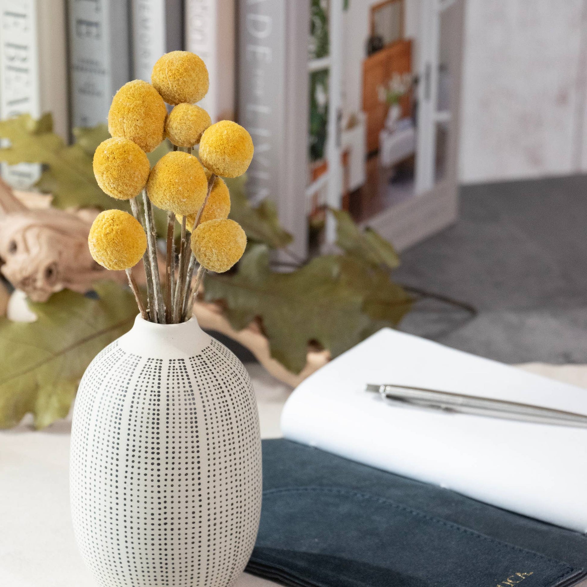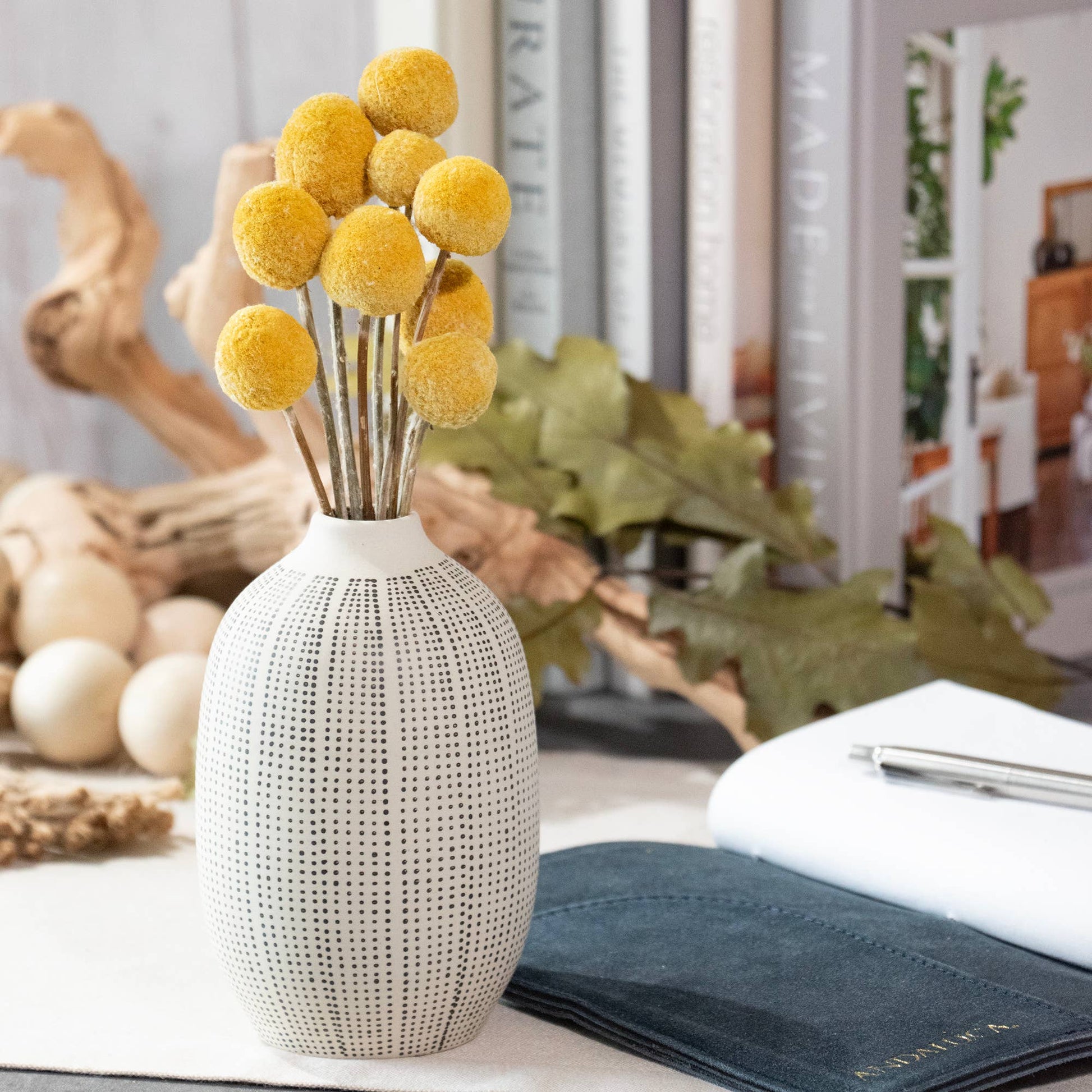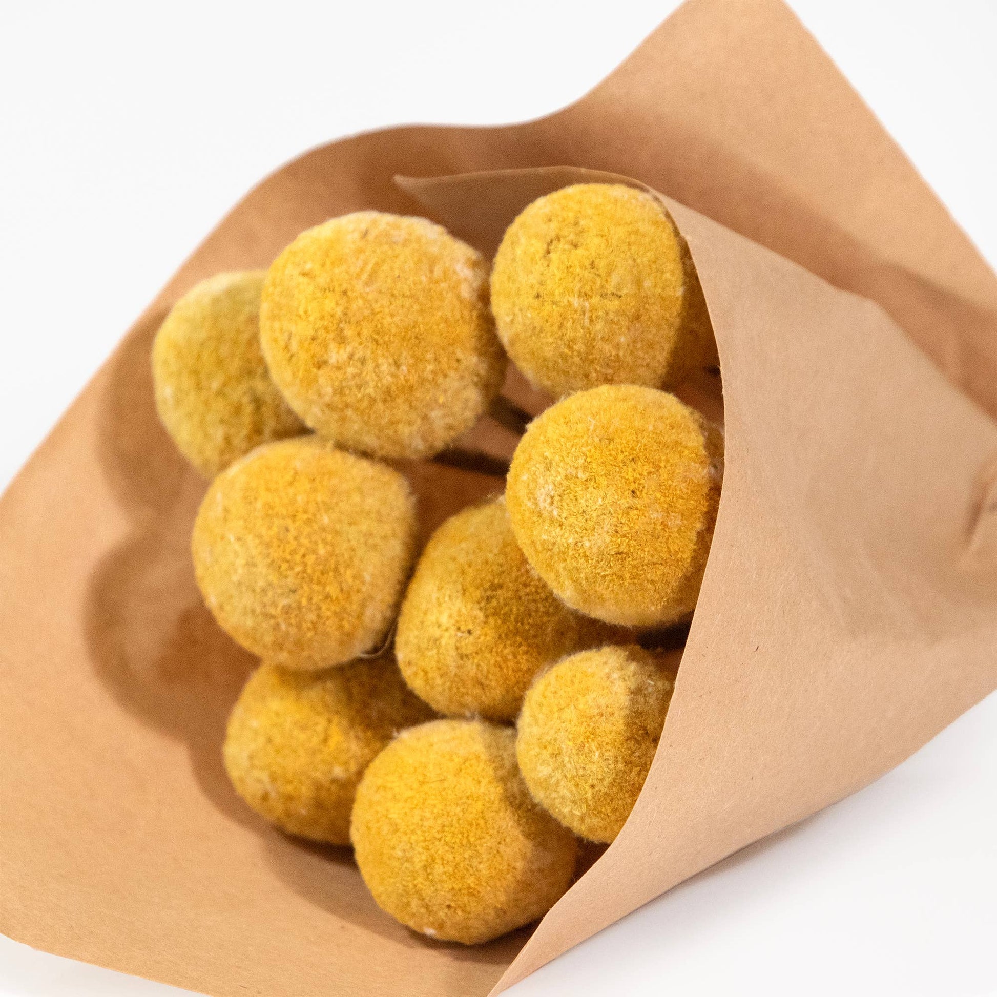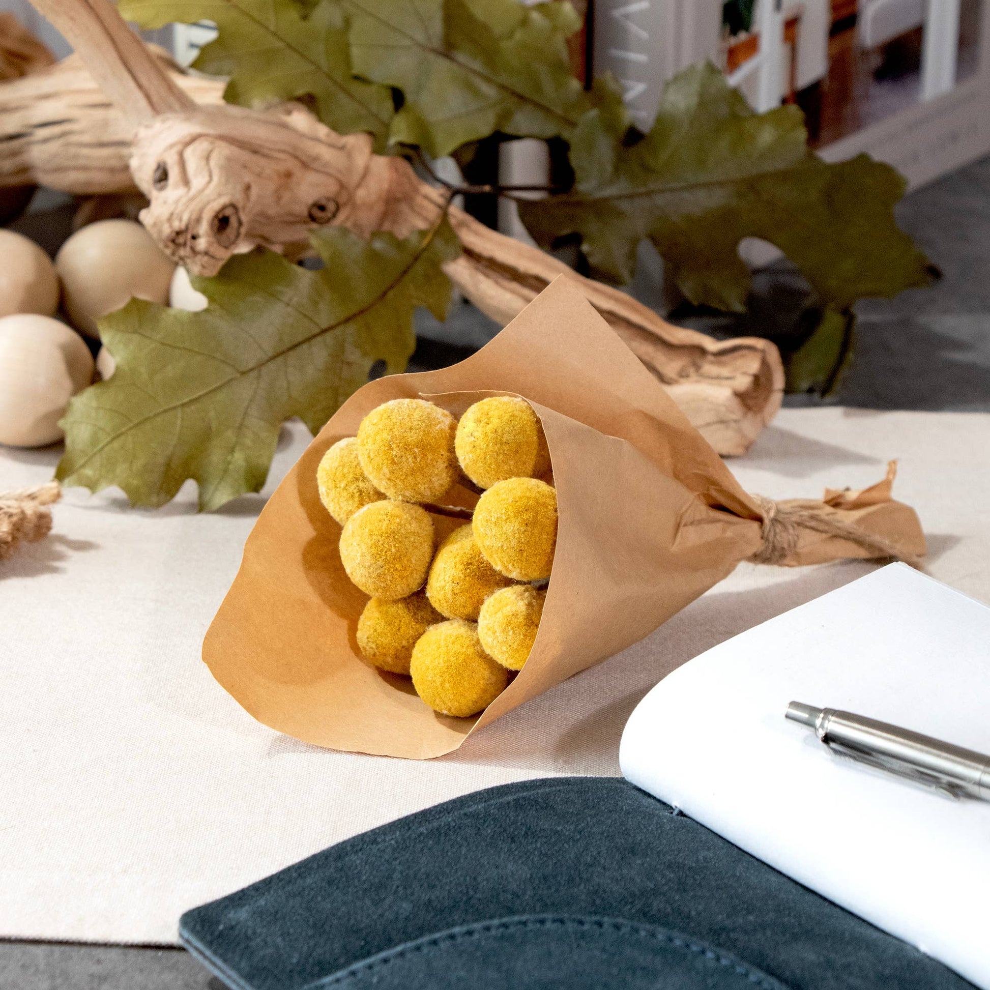 Our Mini Billy Button Bundle is an adorable accent or gift for any occasion. Each mini bouquet is wrapped in a Kraft paper wrap and tied with a jute rope. This petite bundle is a perfect and lovely accent to your tablescape, decorative shelf, or mantle.