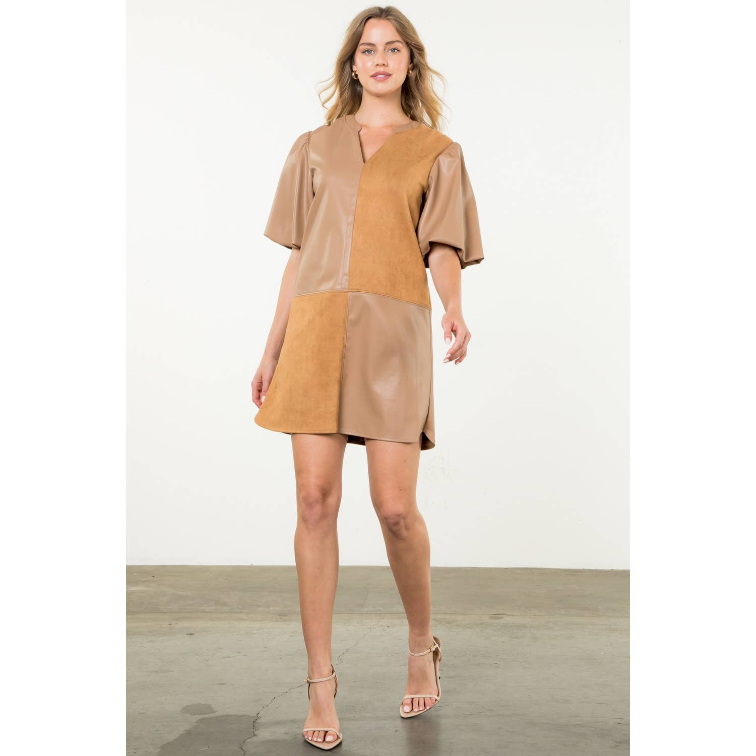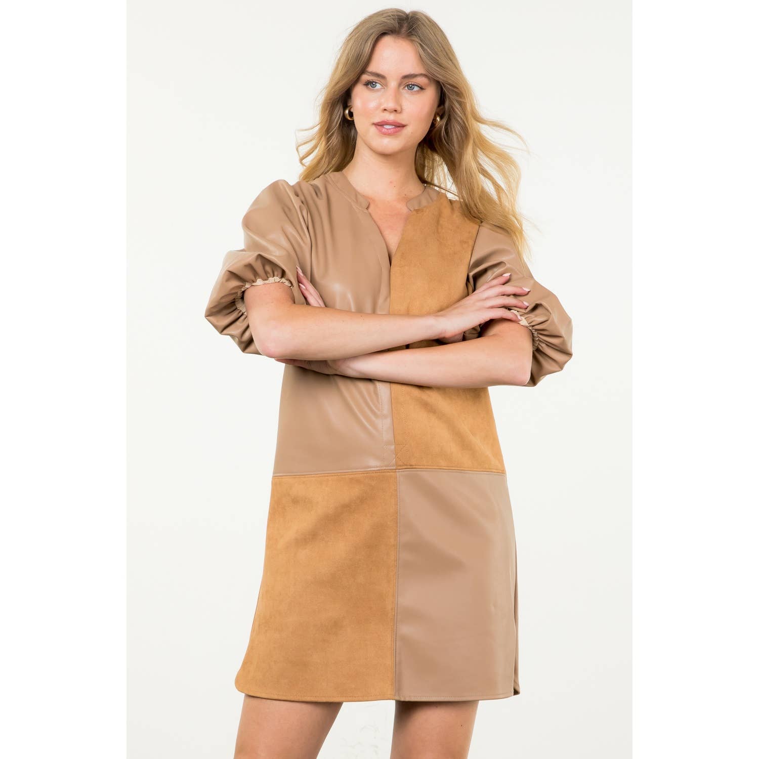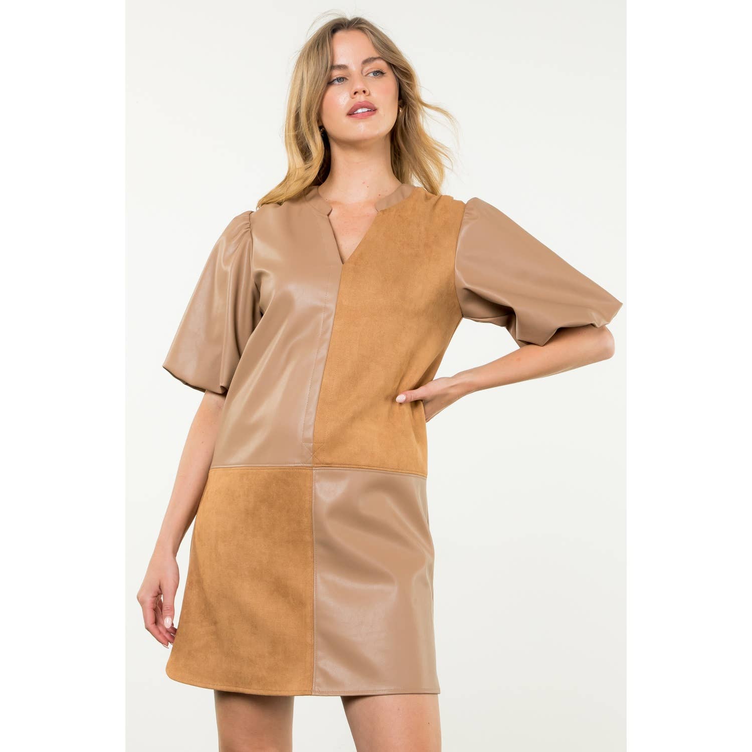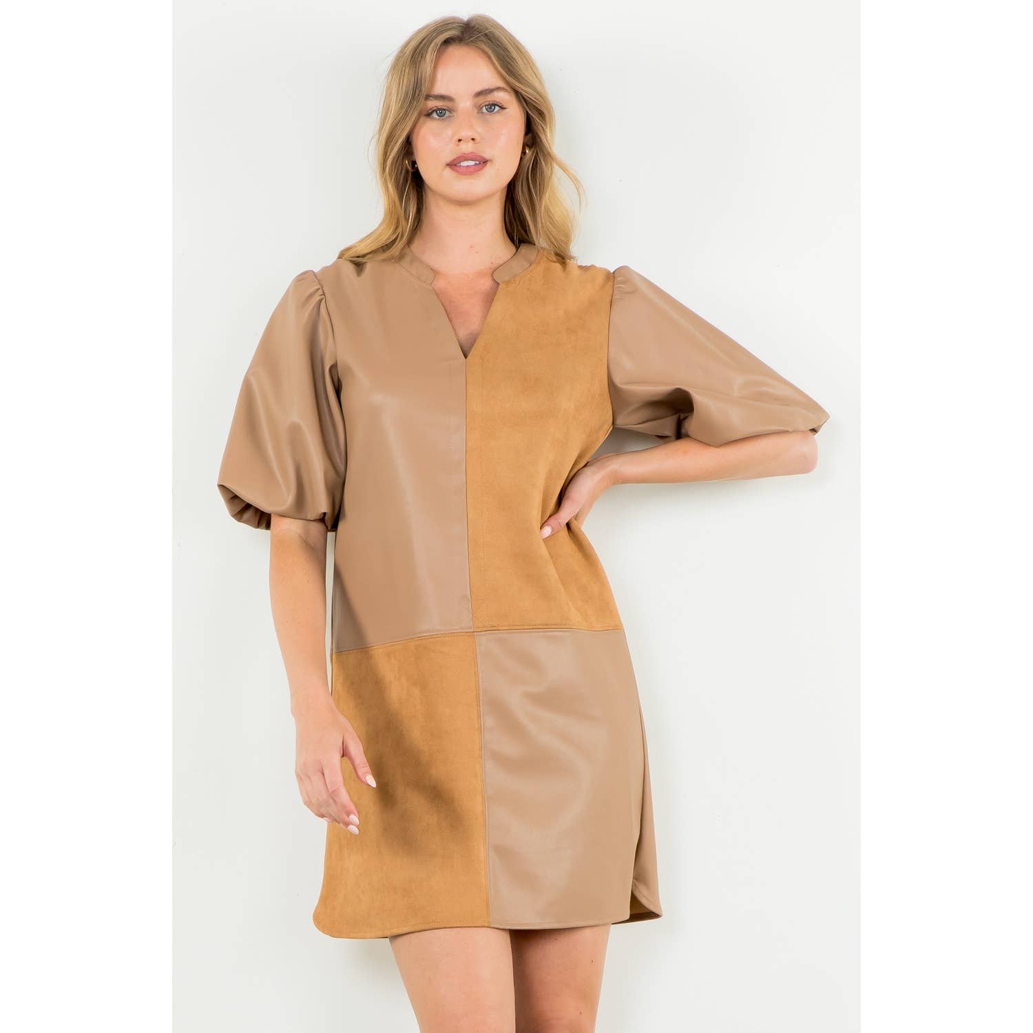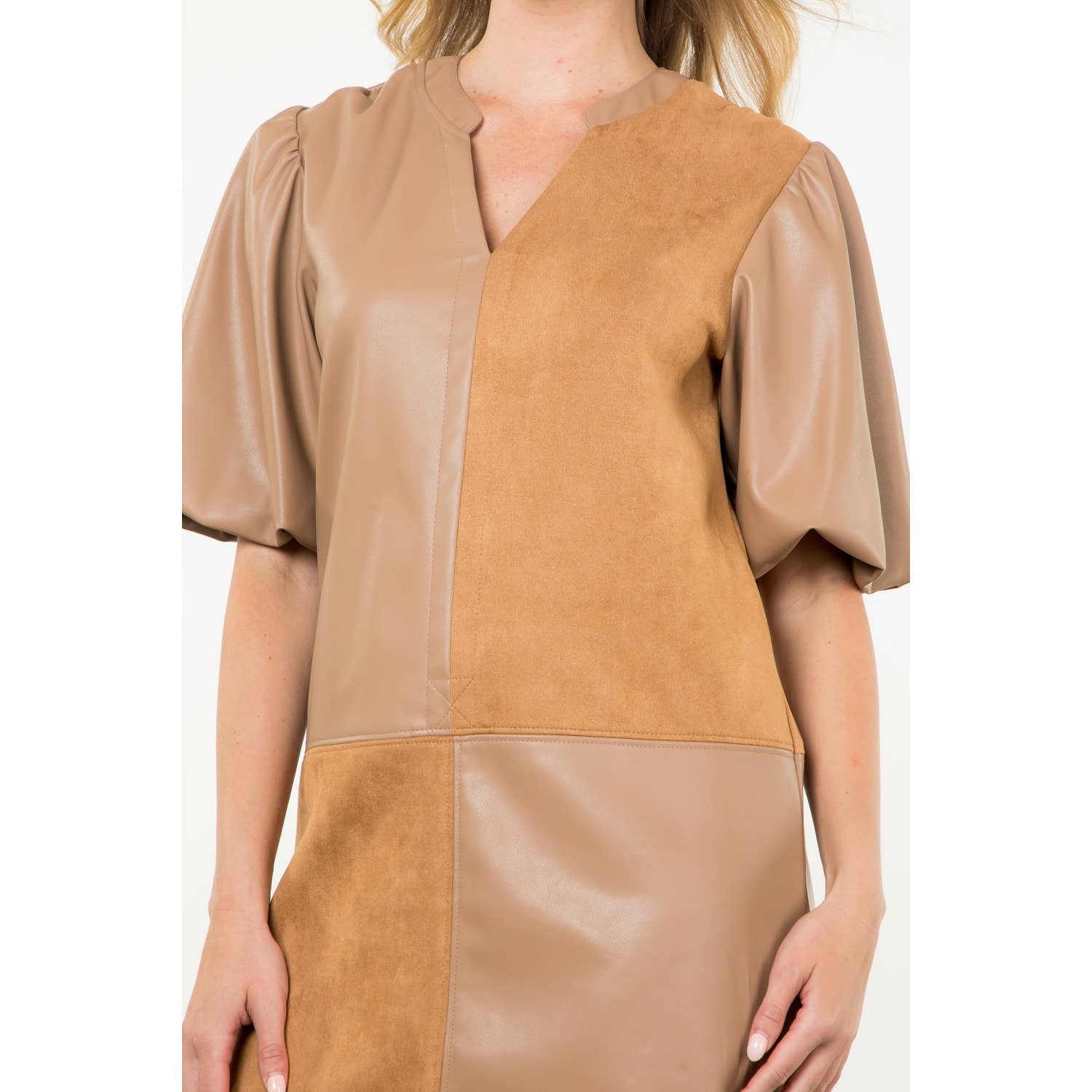 Mixed Media Puff Sleeve Dress . / Style Measurements for Size S / Designed in USA - Body Length: 35 in - Bust Width: 36 1/2 in - Sleeve Length: 12 1/2 in . / Model Sizes - Wearing Size S - Height 5' 9", Bust 32", Waist 25 1/2", Hips 36" / / Fabric Content - WOVEN / 55% Polyester, 45% Polyurethane