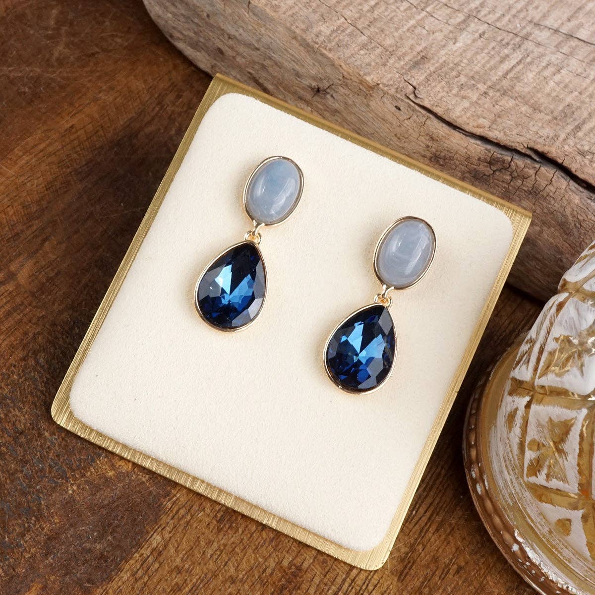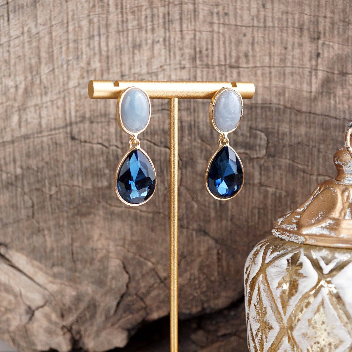 Moonlit Grace – Classic Teardrop Jeweled Statement Earrings A timeless silhouette with luminous contrast, these teardrop earrings blend soft cabochon glow with faceted glass sparkle. The elongated drop frames the face beautifully, offering just the right balance of polish and drama—easy to style from everyday denim to evening layers. DETAILS • Drop length: 1.75" • Top: Oval smooth acrylic cabochon • Bottom: Faceted glass teardrop • Finish: Shiny gold tone • Closure: Post back • Available colorways: Blue, Light Brown STYLE NOTES Luxe Texture • Subtle Sparkle • Versatile Charm
