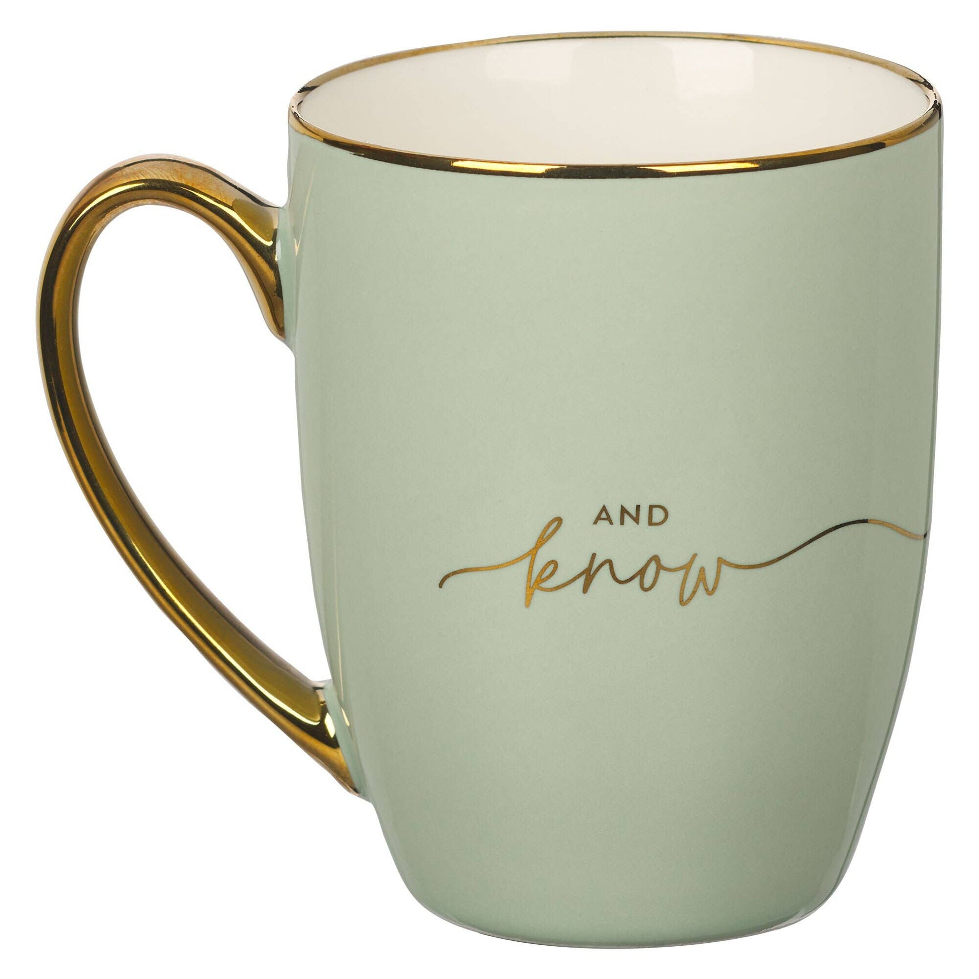 Soft green background, Gold-foiled text, Be still and know, Ceramic mug, Metallic gold rim and handle, Milky white interior, Not microwave and dishwasher safe due to delicate foil, Handwash recommended, Packaged in a tuck-top Kraft cardboard box, Packaging dimensions: 4.4" x 4.7" x 3.5" (112 x 119 x 89mm) Capacity: 12 fl. oz. (355 ml)