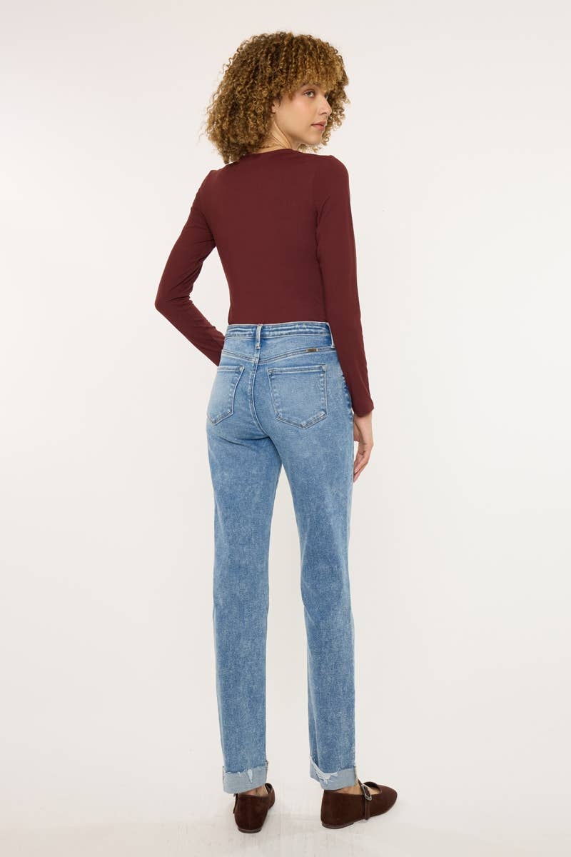 OPEN PACK HIGH RISE SLIM STRAIGHT JENAS MEDIUM WASH STRETCH NON DISTRESSED 5 POCKET DESIGN STYLE OPEN SIDE SEAM RAW HEM PIECE DETAIL WAISTBAND SINGLE CUFF HEM RISE 10 1/2” INSEAM 28 1/2" AFTER CUFF IN SIZE 5/26 75% COTTON, 23% POLYESTER, 2% SPANDEX 13.5 OZ