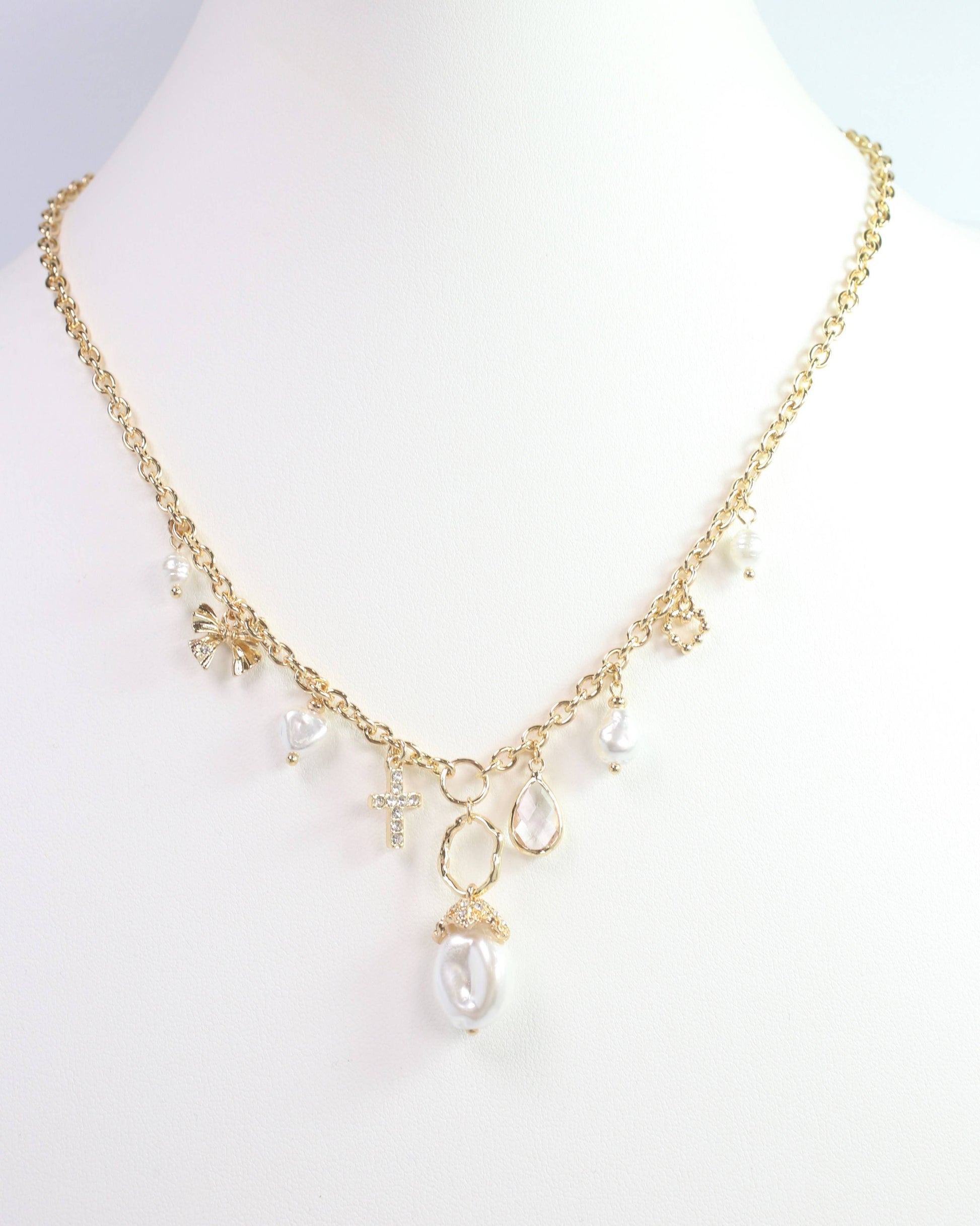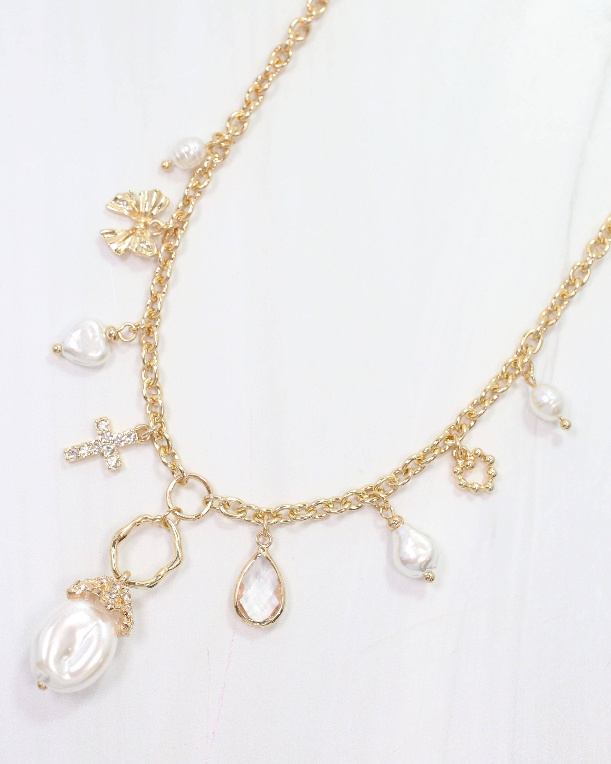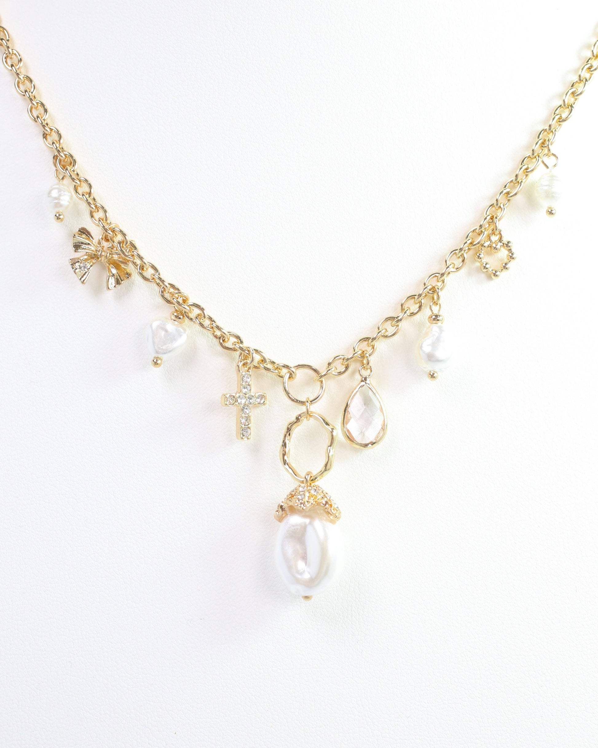 Enhance your elegant style with the Packard Pearl Charm Necklace in a shiny gold finish. Featuring a variety of charms, including pear drops, CZ cross, and textured bow, this necklace adds a playful touch to any outfit. With a large pearl pendant and gold and CZ cap, it exudes sophistication and charm. Elevate your look with this must-have accessory!