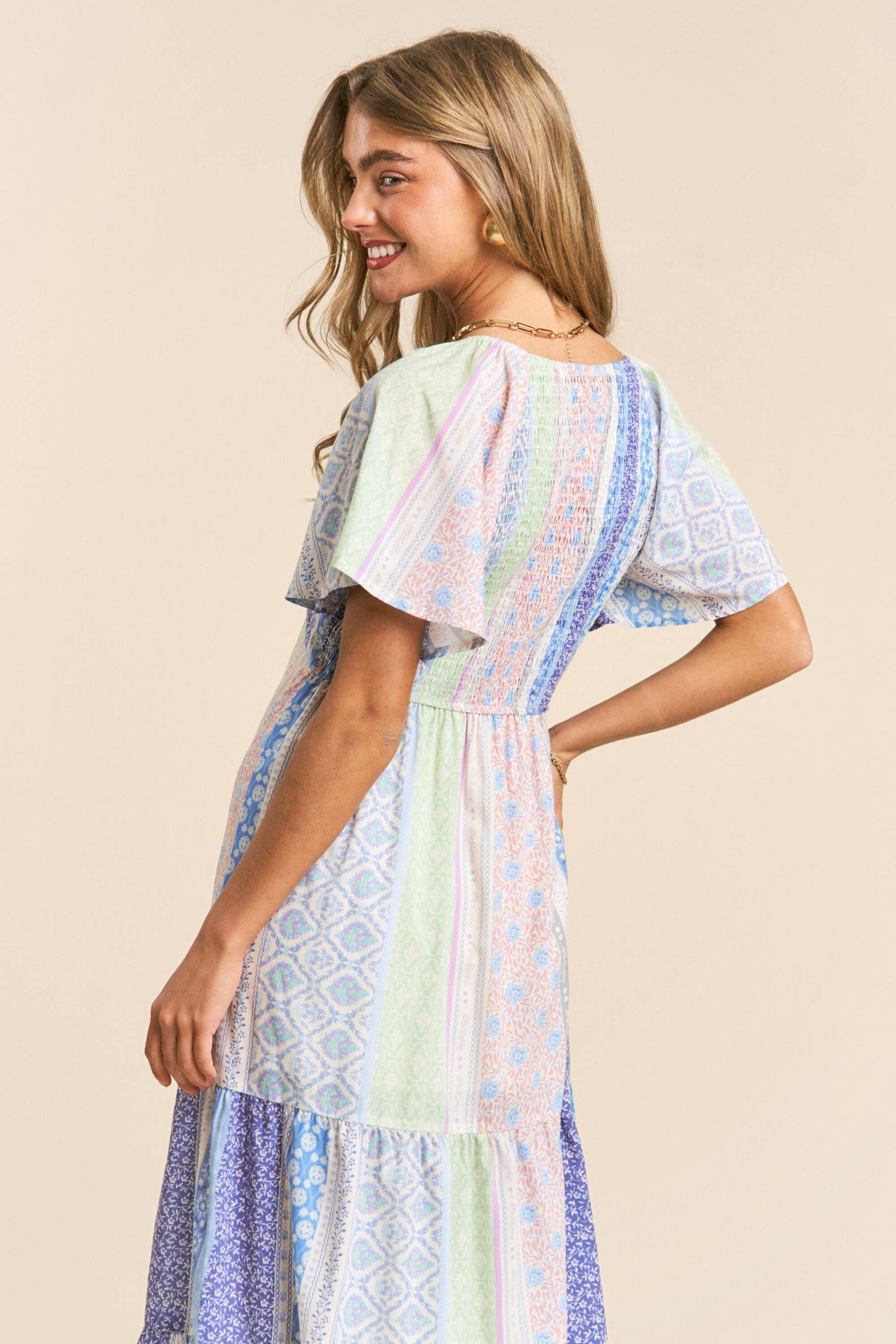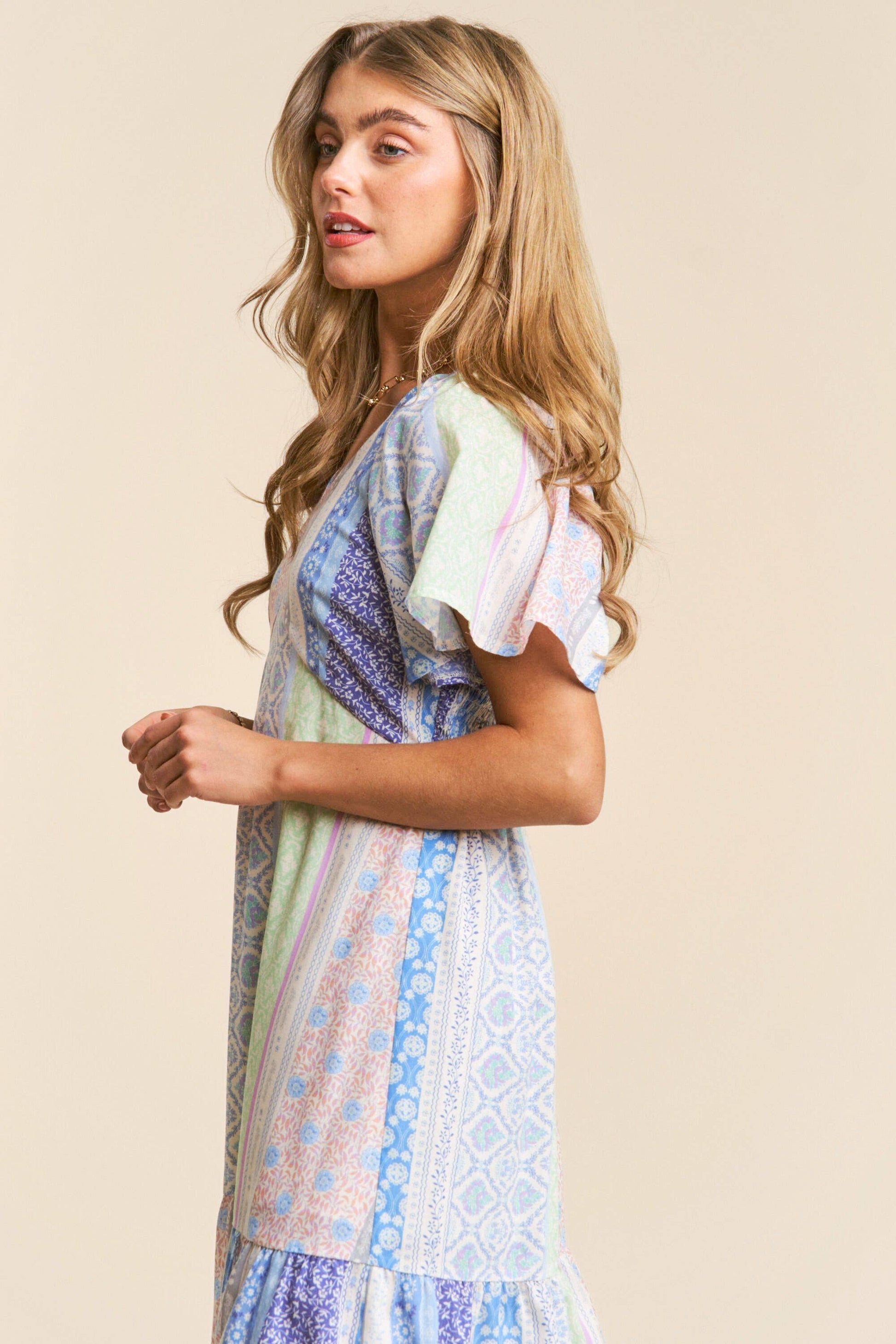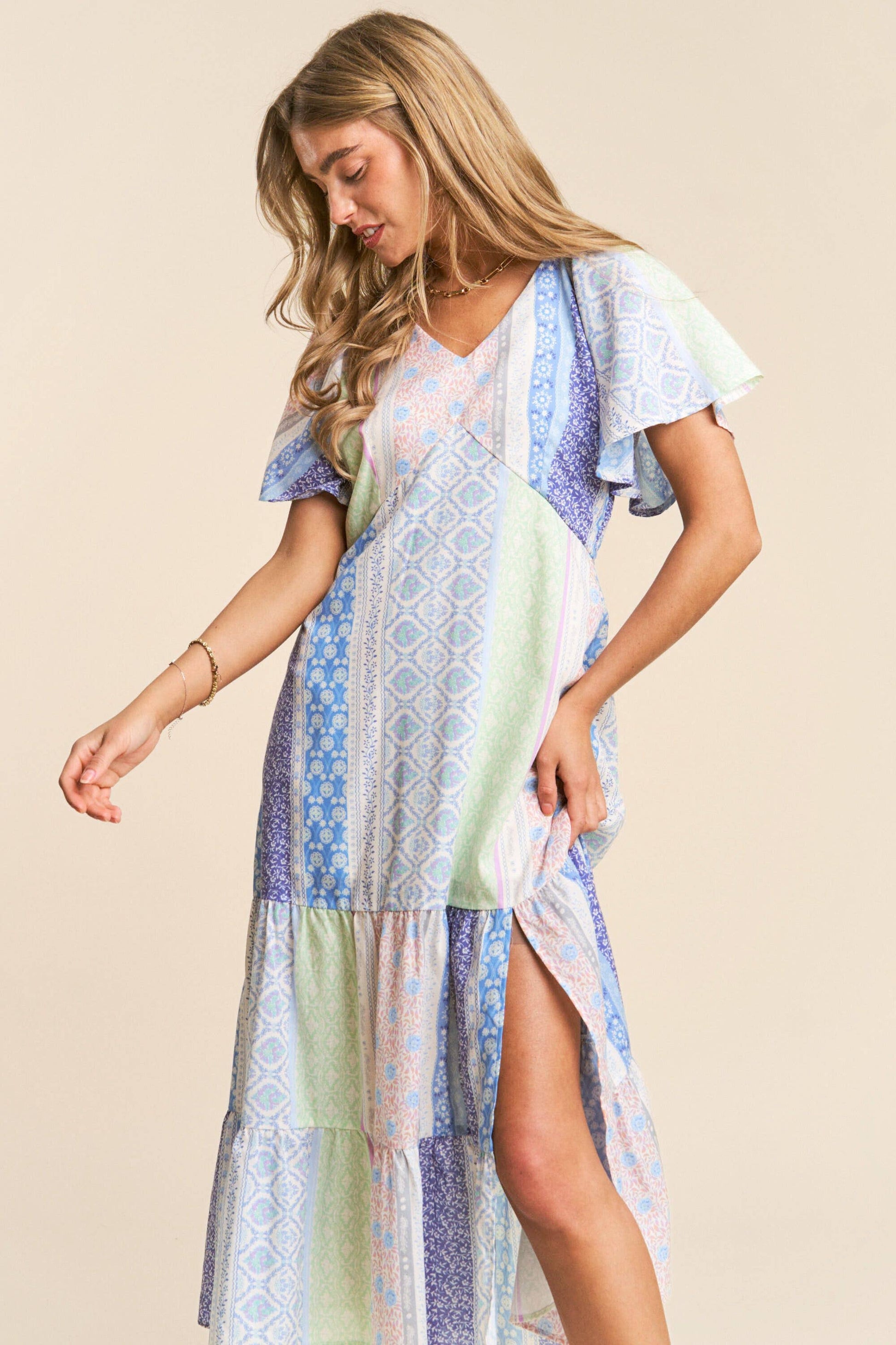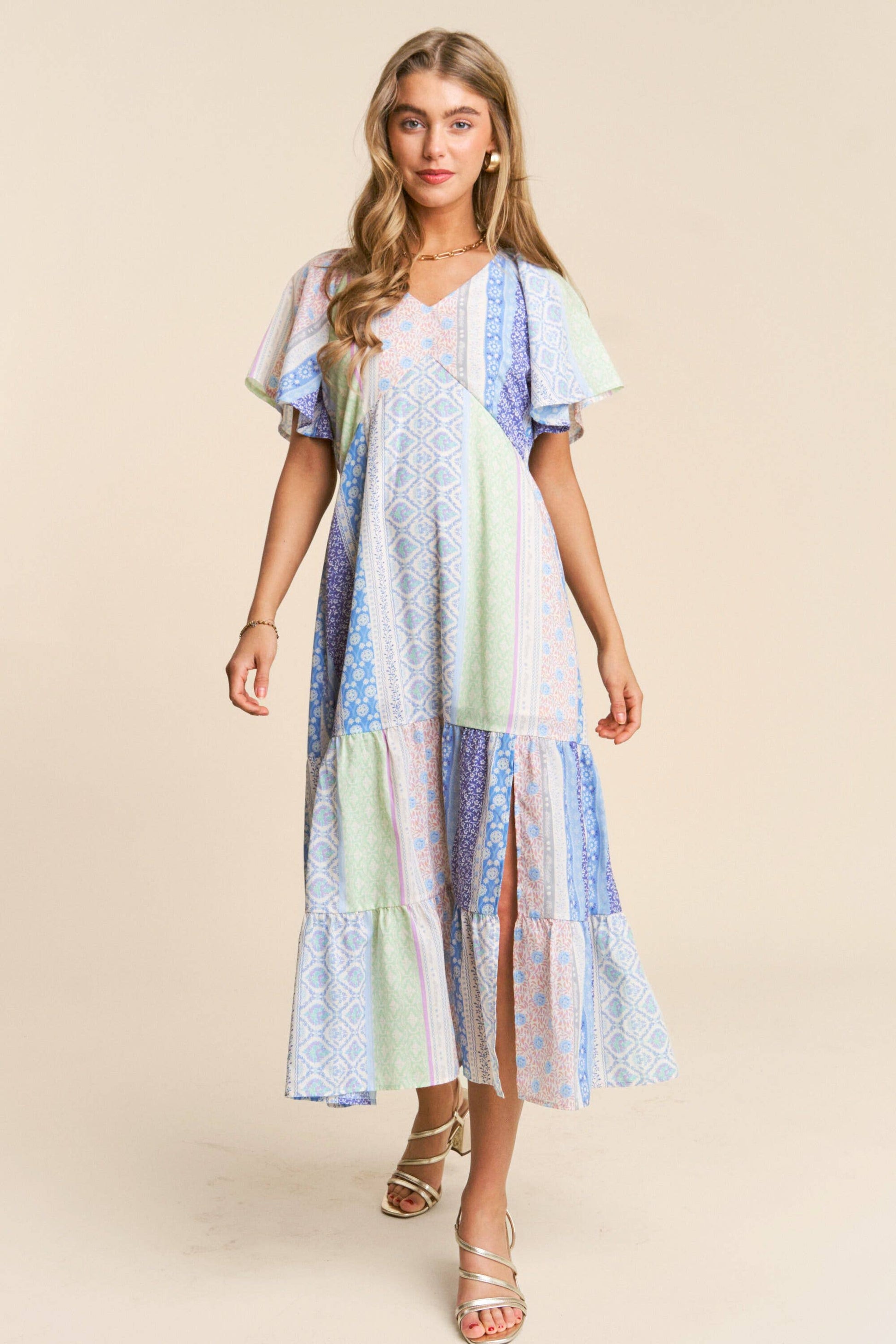 Women's V neck multi color and pattern tiered midi dress. Designed with flowy short sleeves and skirt slits. Beautiful pastel patch-work.