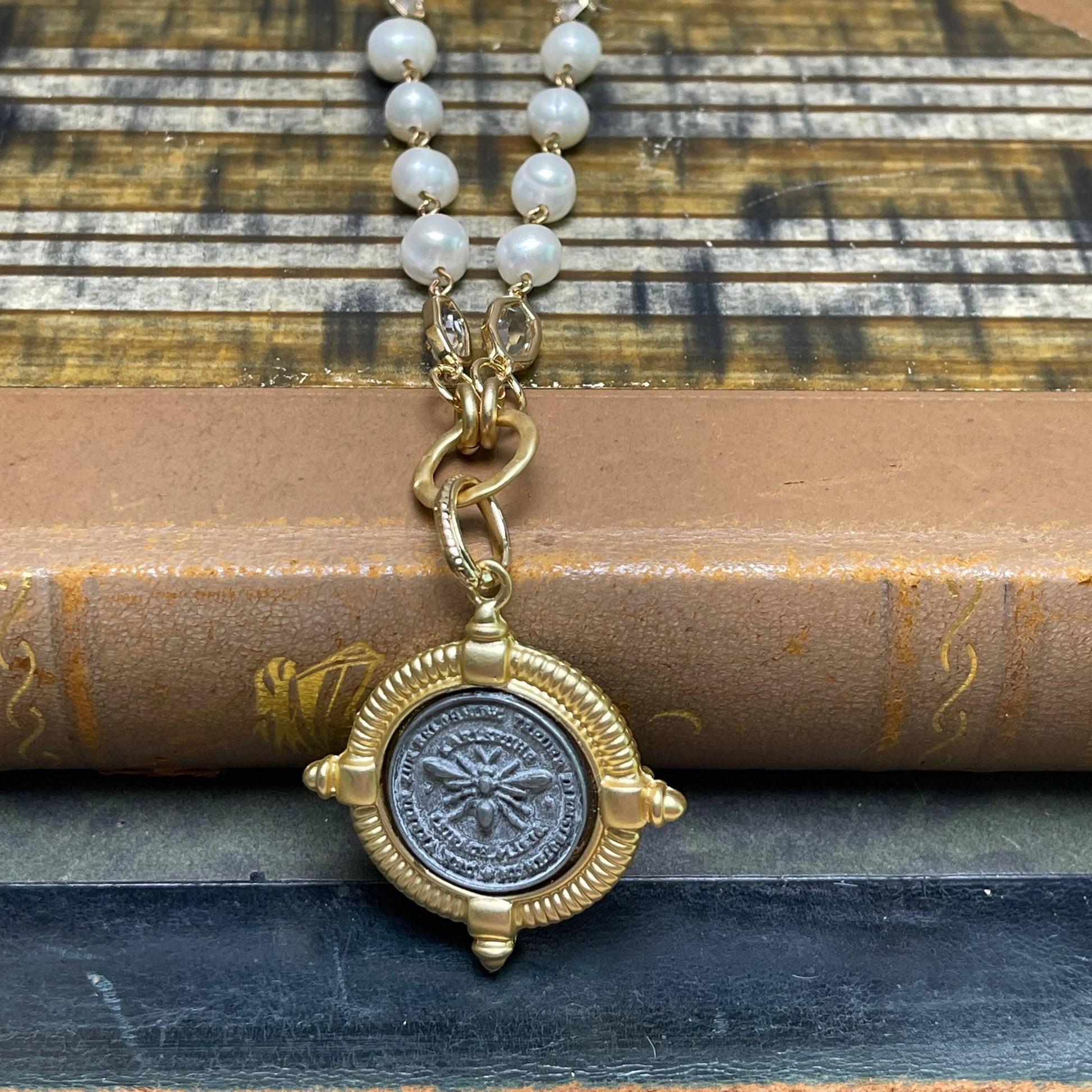 Crafted with a blend of elegance and vintage charm, this 16" mixed-metal necklace features lustrous pearls and a bold shiny gold thick link chain. A back spring closure secures the piece, while a 1.5" matte antique silver medallion with a matte gold edge showcases a detailed French bee coin pendant. Perfect for adding a touch of sophistication and timeless appeal, this necklace is an eye-catching statement piece.