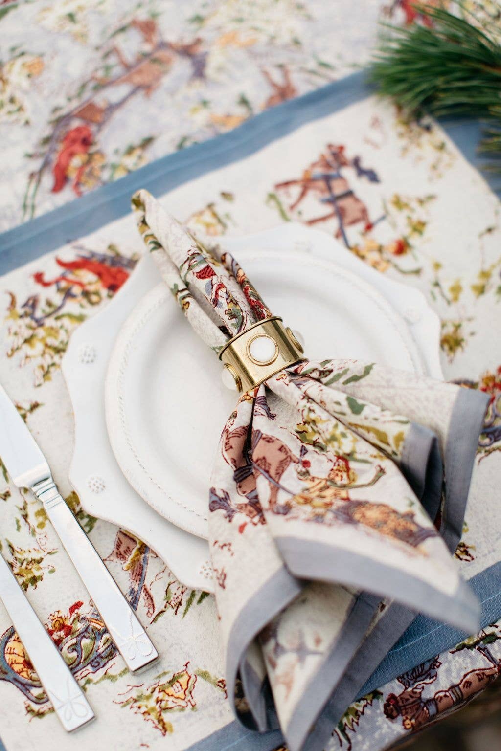 Evoke the wonder of wintry landscapes and evergreen forests with our Renne collection. With a charming pattern depicting reindeer alongside children at play in the snow, this piece is designed to add a jovial sense of winter fun to your table setting. This high-quality French linen has been carefully handprinted by skilled artisans using a time-honored technique, resulting in a singular piece of craftsmanship.