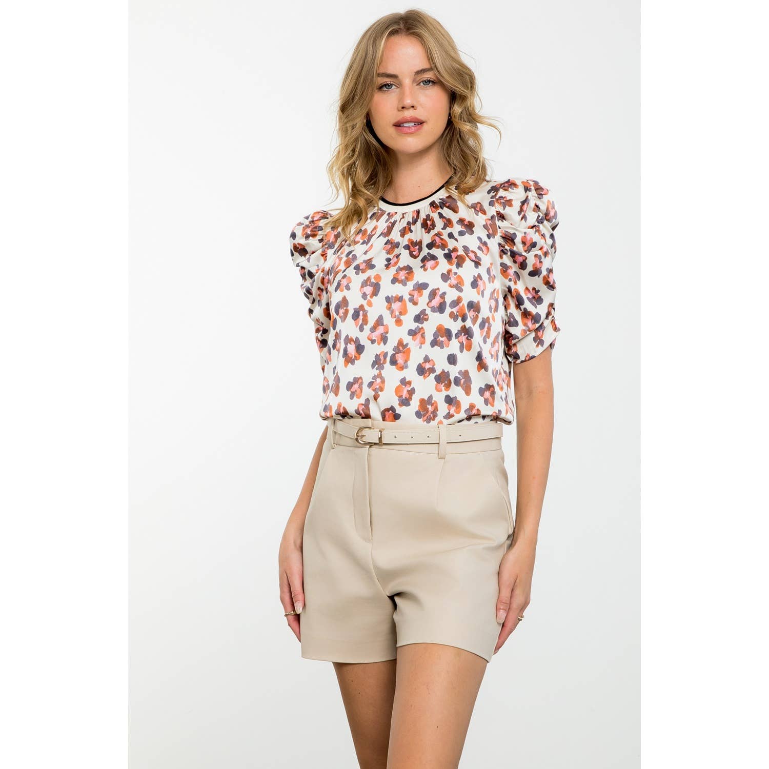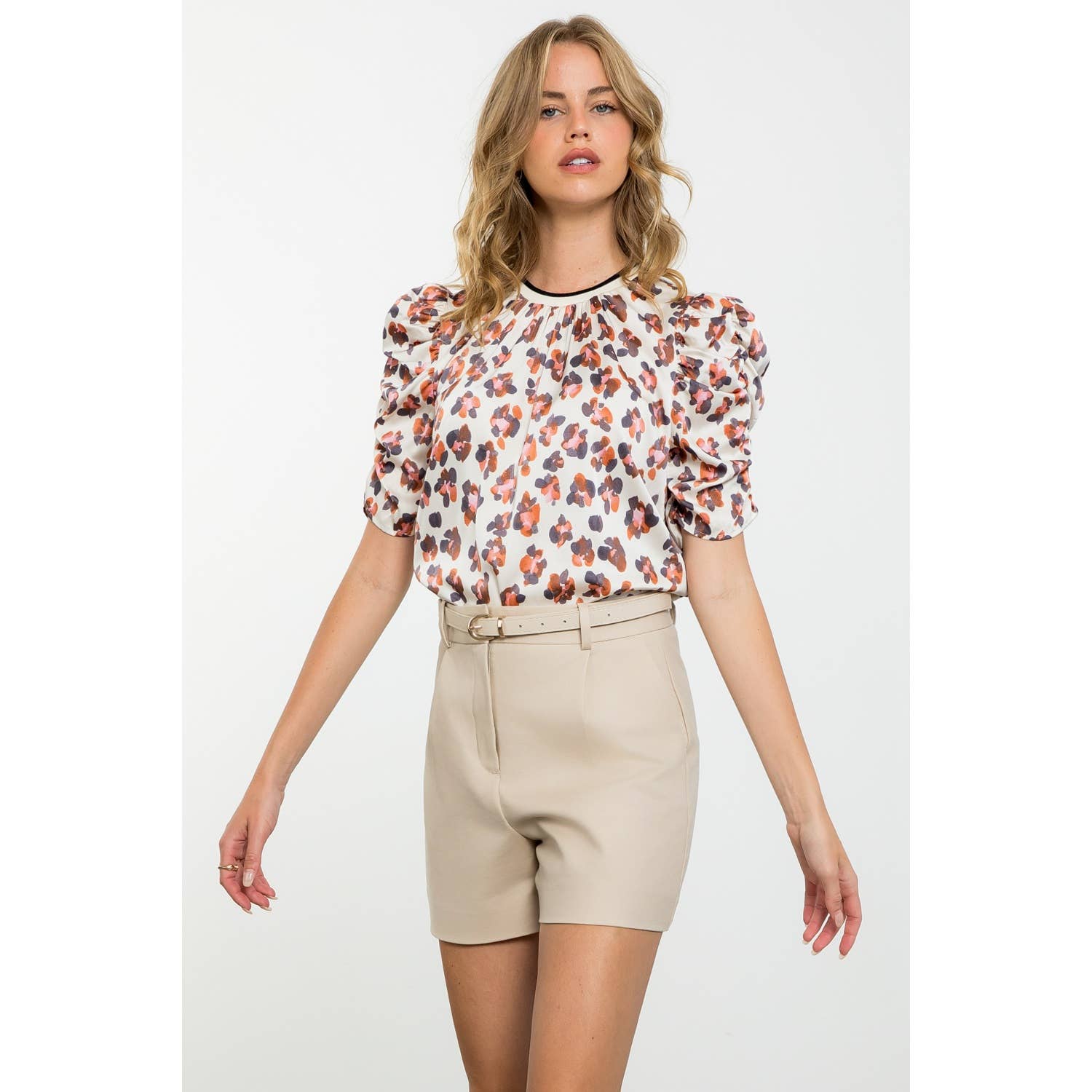 Ruched Sleeve Print Top . / Style Measurements for Size S / Designed in USA - Body Length: 24 in - Bust Width: 38 in - Sleeve Length: 10 in . / Model Sizes - Wearing Size S - Height 5' 9", Bust 32", Waist 25 1/2", Hips 36" . / Fabric Content - WOVEN / 98% Polyester, 2% Spandex