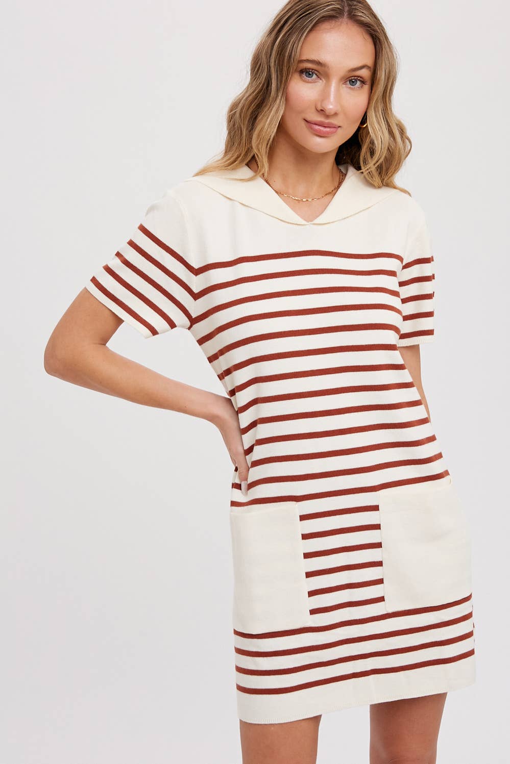 Cozy sweater knit dress features an all over striped pattern, sailor collared v neckline, short sleeves, front patch pockets and a relaxed fit.