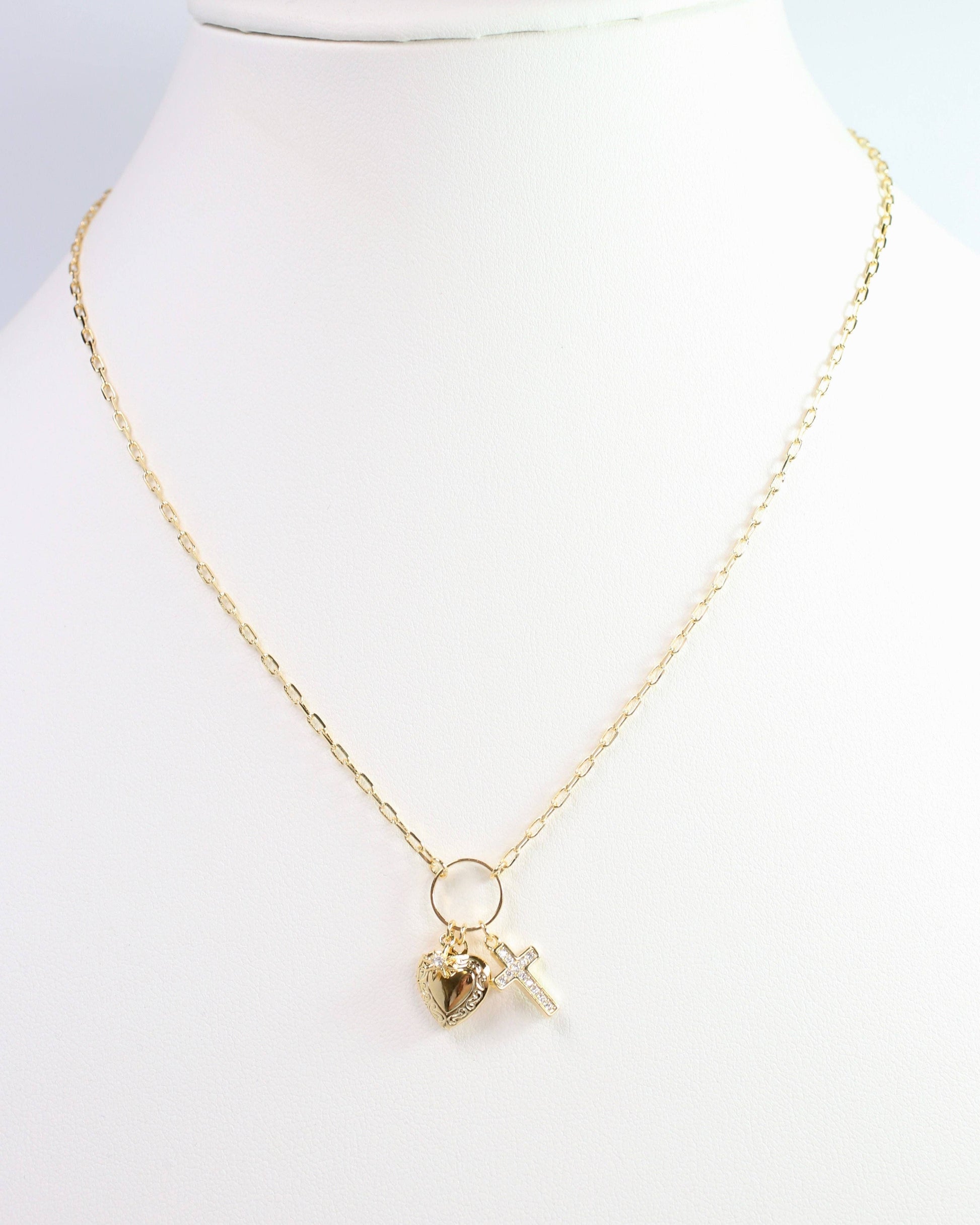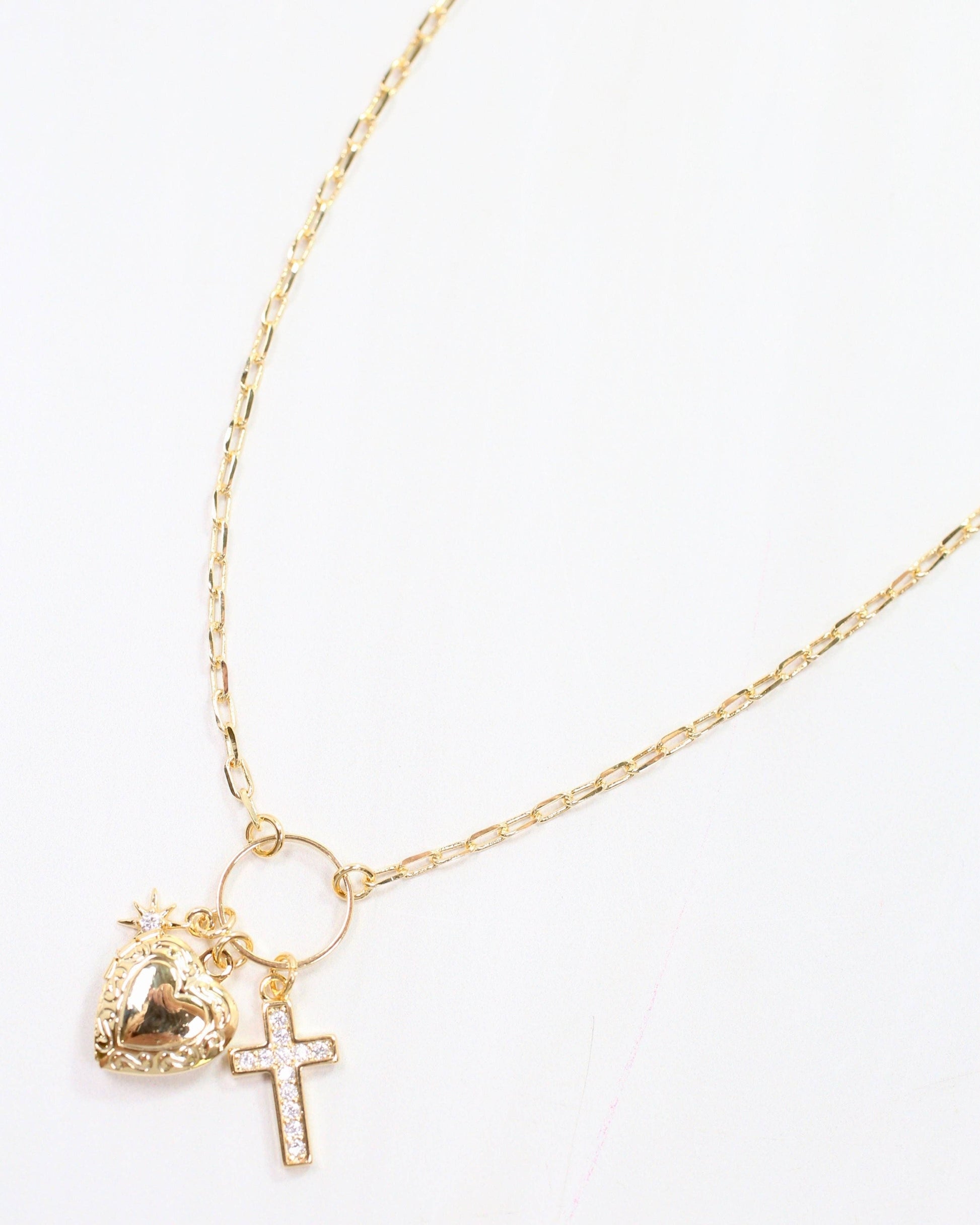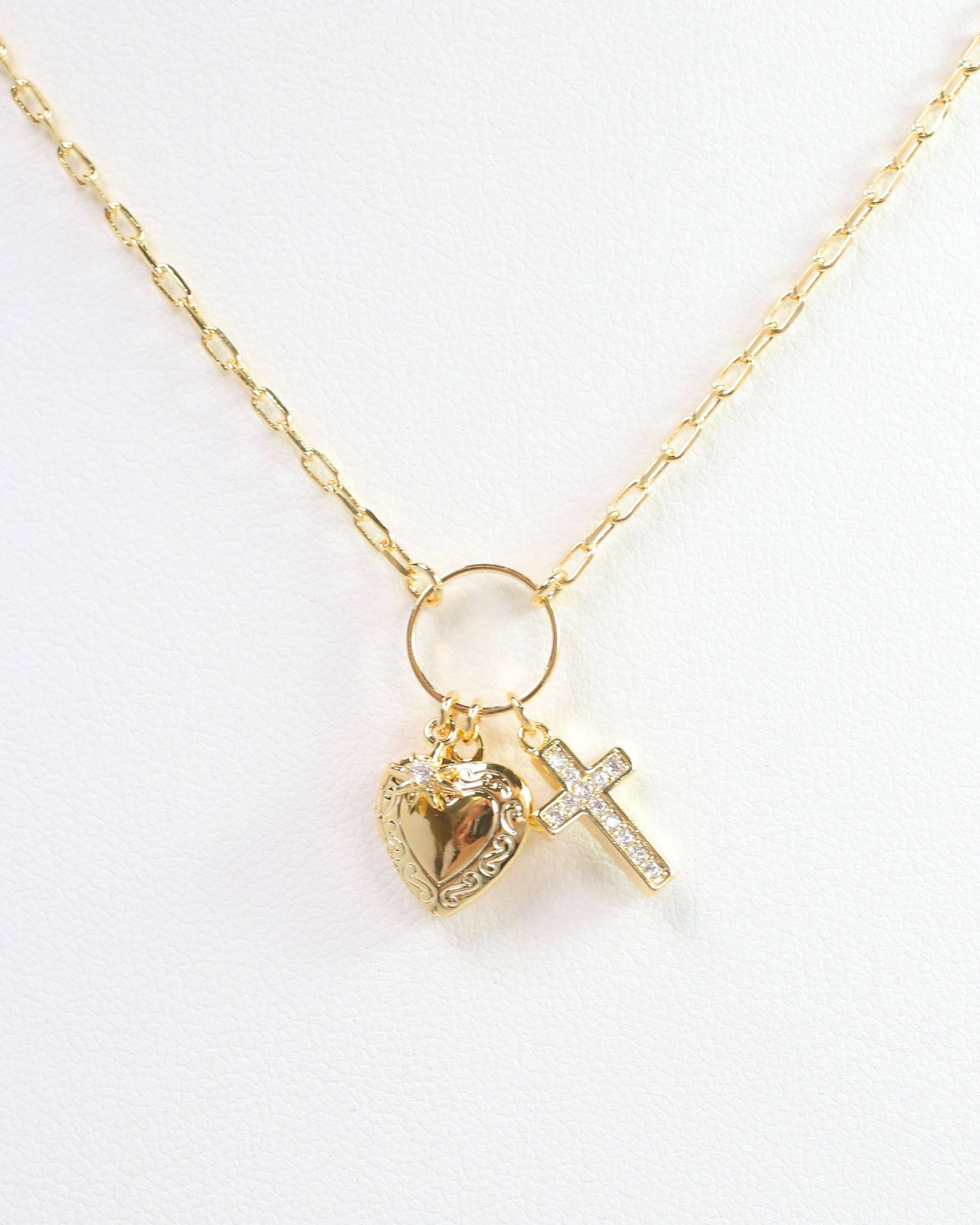 Add some charm to your outfit with the Sally Drop Necklace. This gold necklace features a CZ cross, a heart locket, and a petite star with a CZ center, all on a delicate paperclip chain. Perfect for any occasion, this necklace is both stylish and playful.