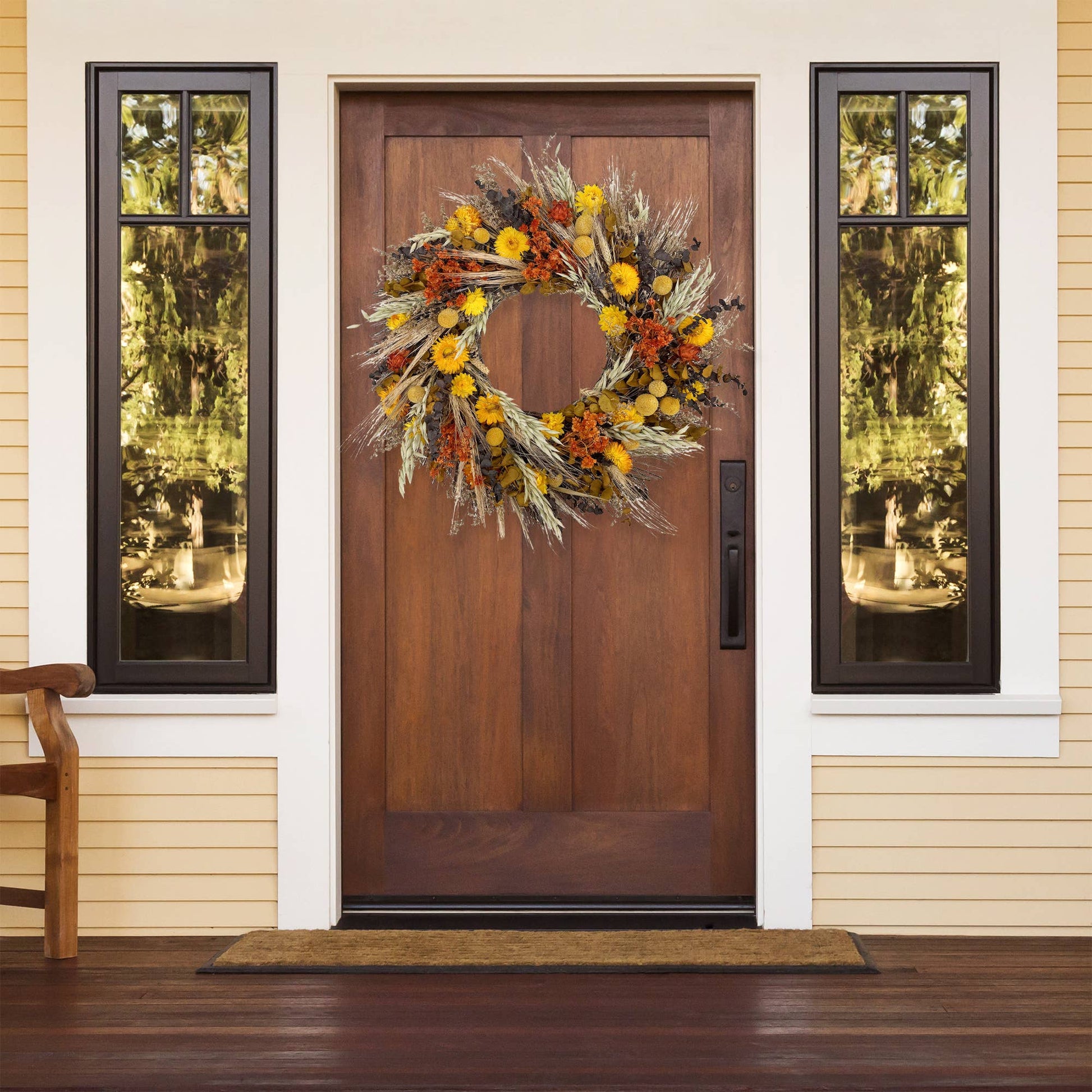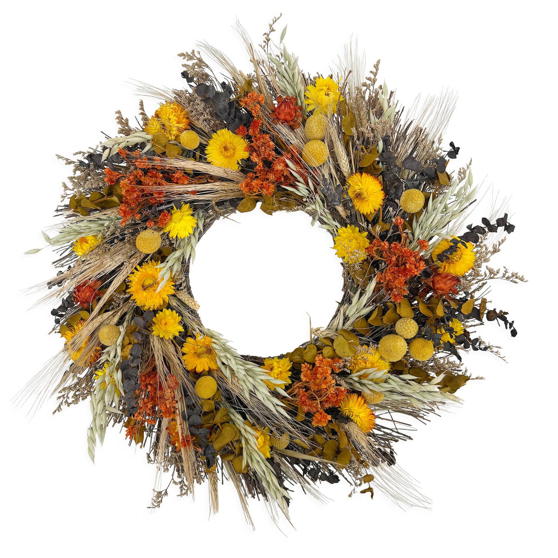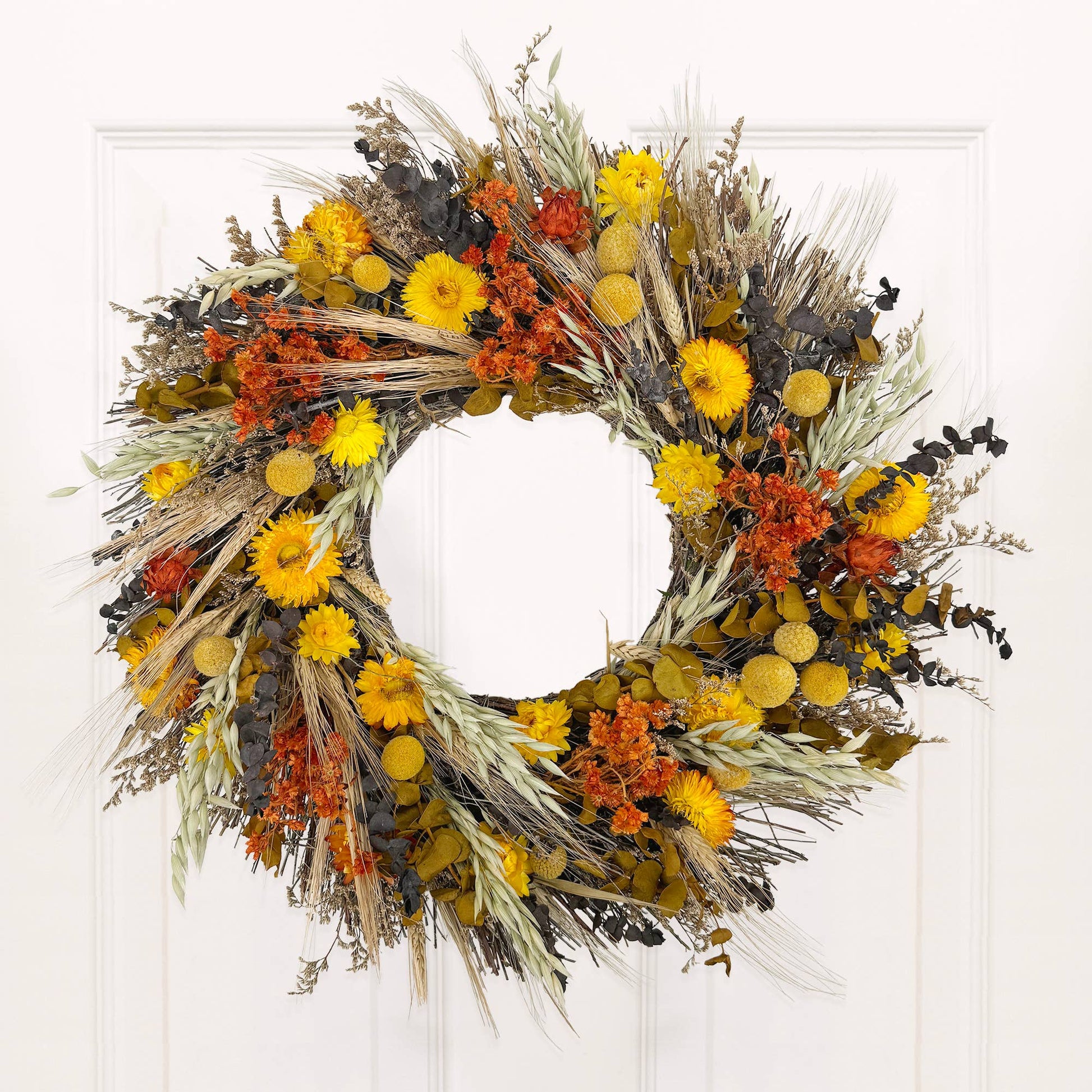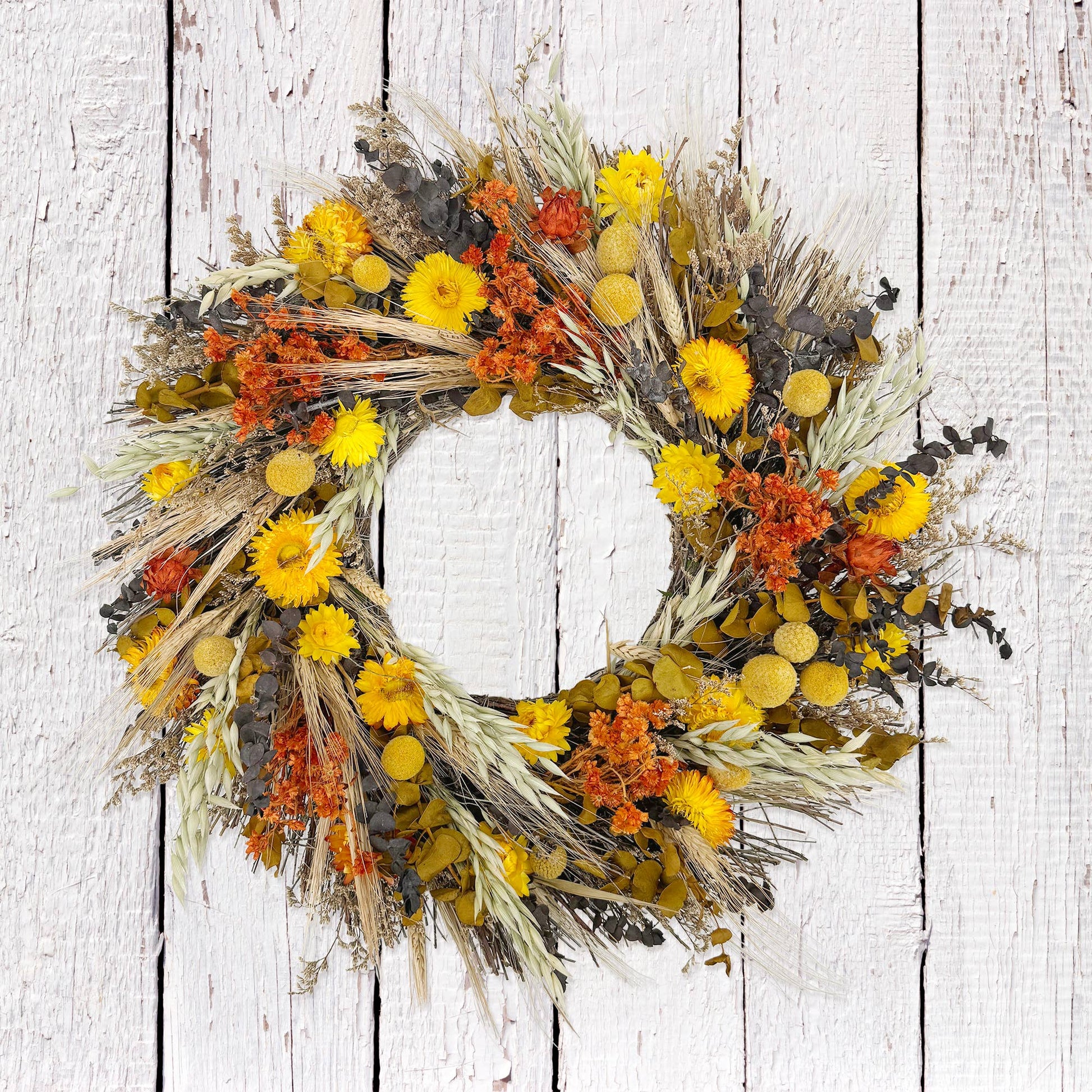 A festive wreath that can both transition in and out of fall with its delicate flowers and lush greenery. Each wreath is made on a twig base with gorgeous baby eucalyptus, aveena, wheat, and strawflowers.