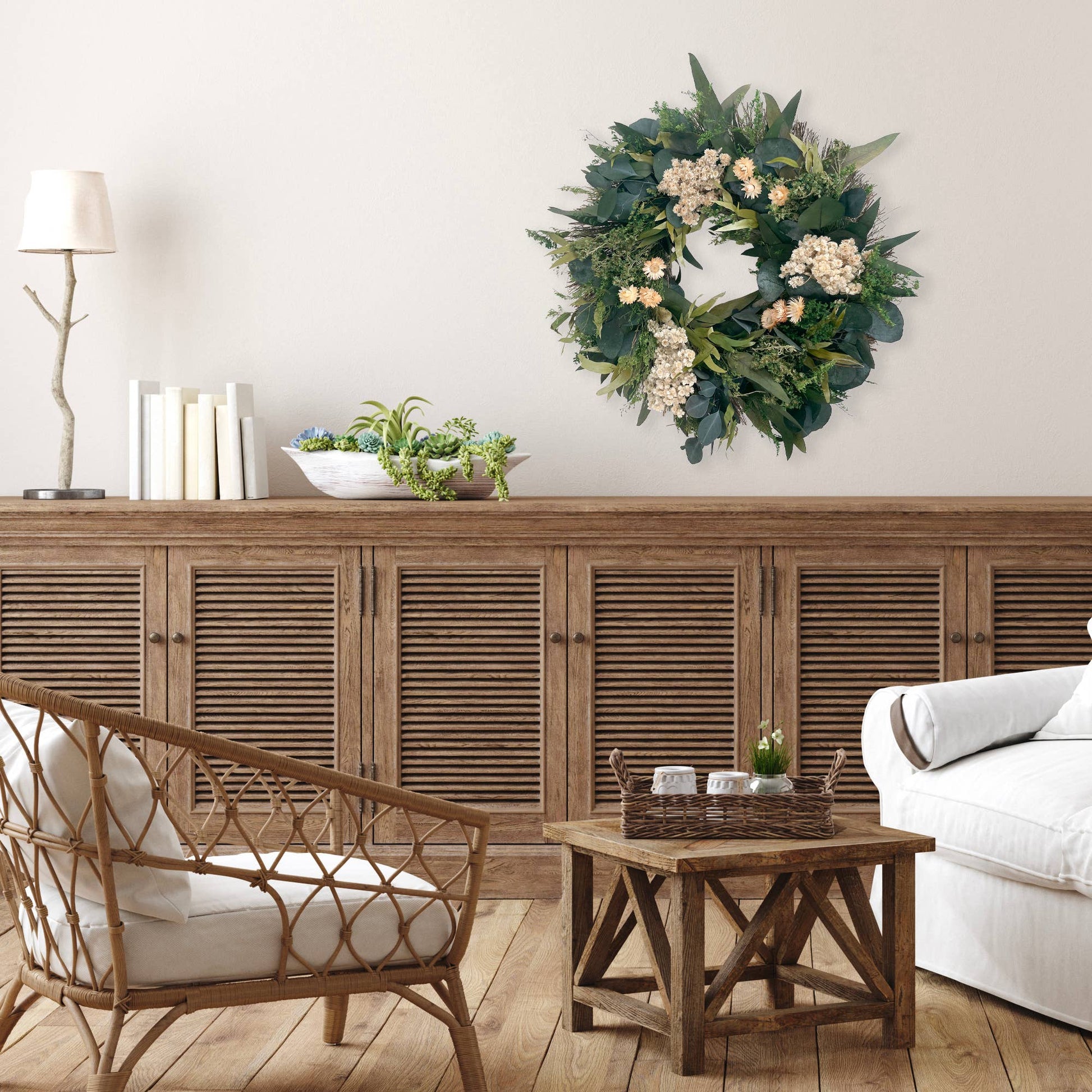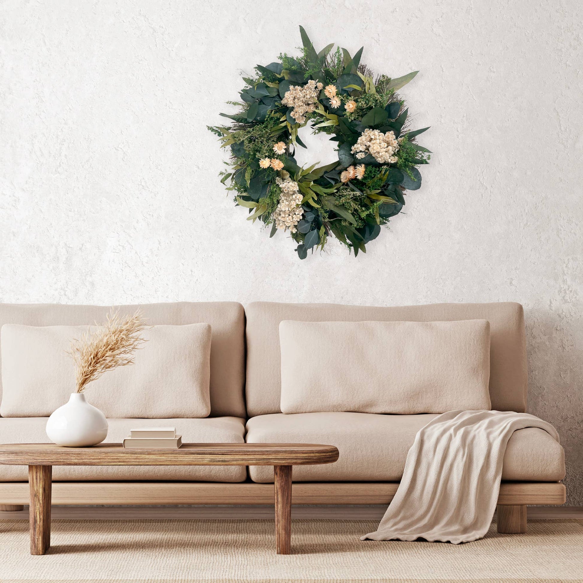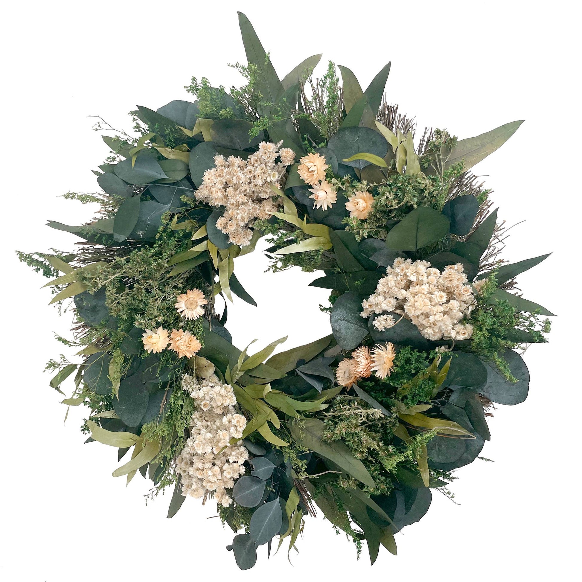 Using silver dollar and willow eucalyptus, greenery, and multiple types of delicate dried flowers, we hand-made this lush and rich Santa Rosa Wreath that fits perfectly with any decor.