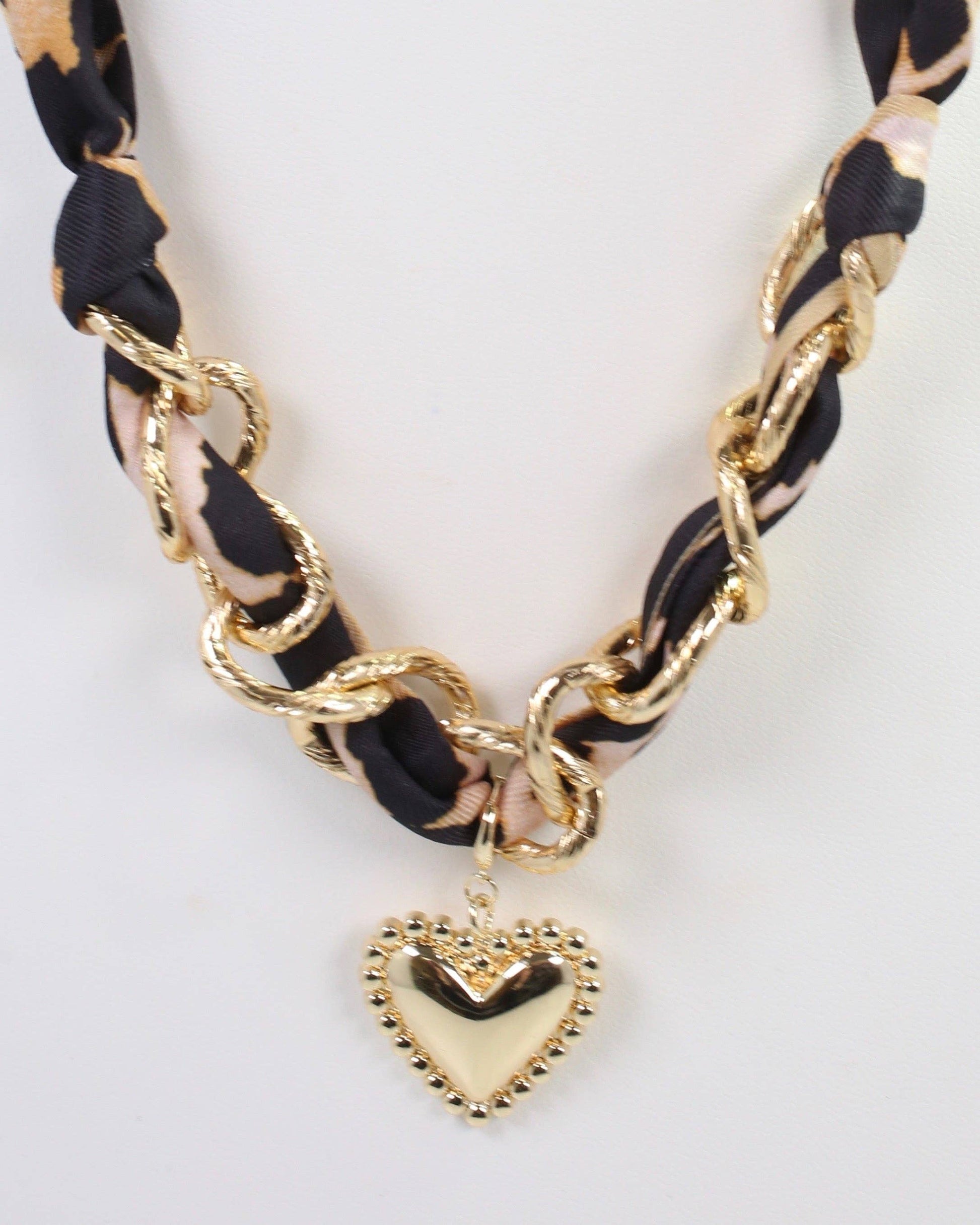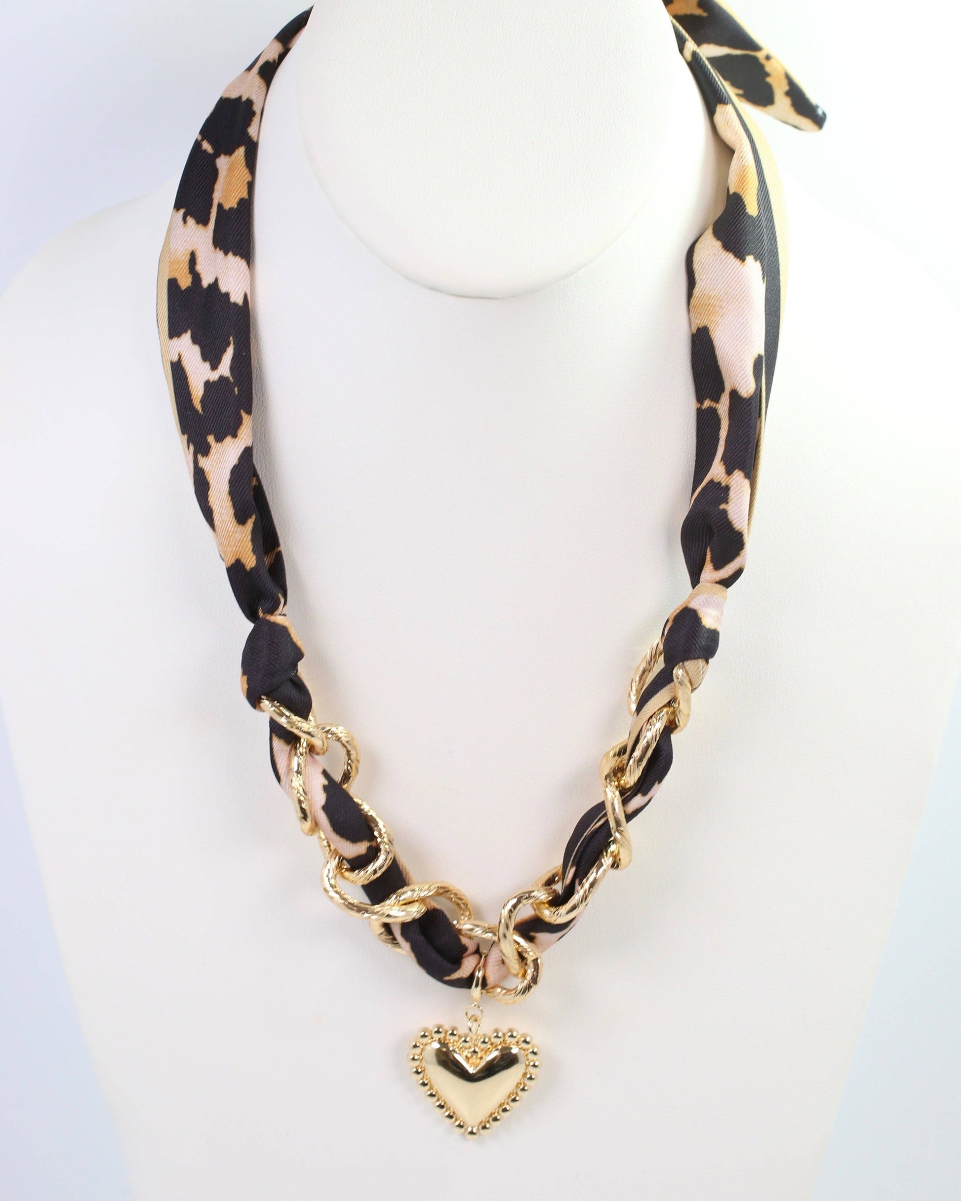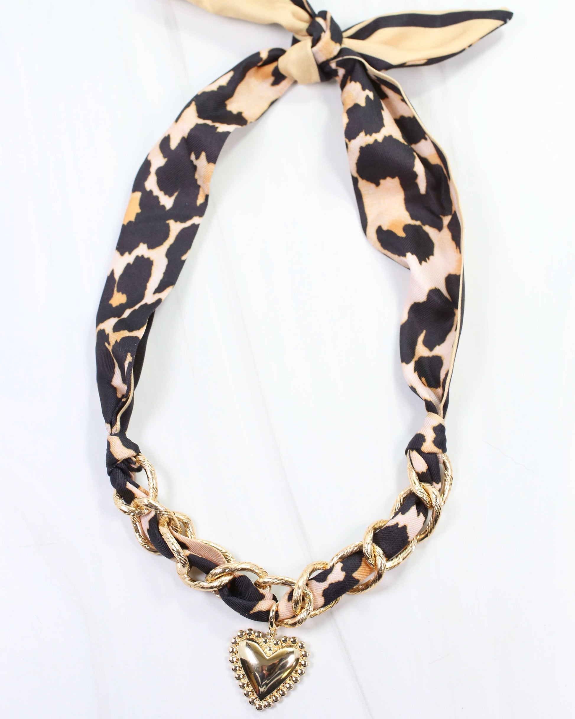 Add a fresh twist to your accessories with this playful scarf necklace. Featuring a delicate chain artfully twisted through sassy leopard printed fabric, it’s finished with an adorable heart charm that adds a touch of charm wherever you go. Perfect for elevating any outfit with a fun and flirty vibe