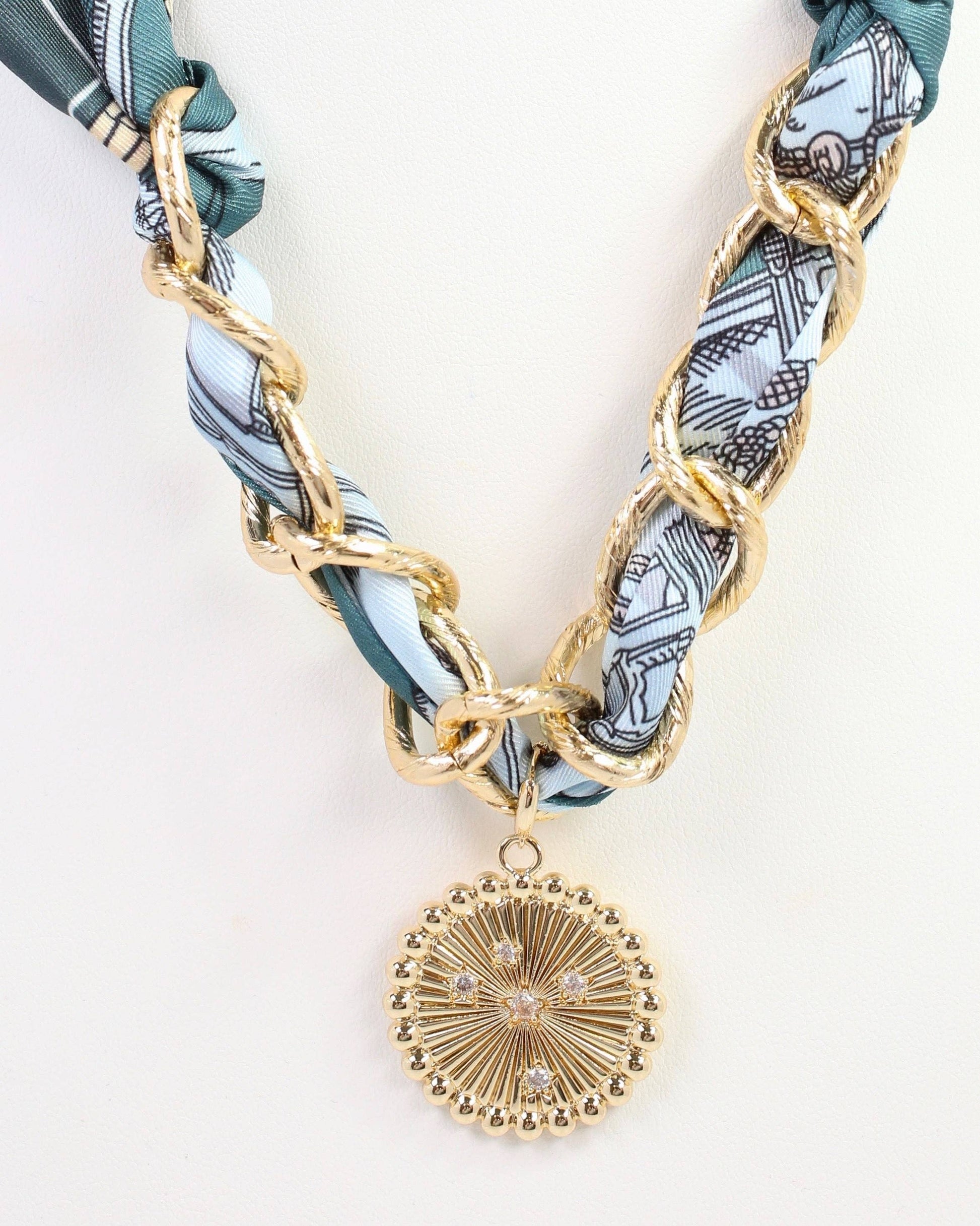 Introduce a fresh pop of color with the Sarah Scarf Charm Necklace in Teal. This fashionable piece pairs a delicate charm with a soft teal scarf accent, creating a versatile accessory that effortlessly elevates both casual and dressy looks. Add a touch of modern elegance and vibrant style to your outfit.